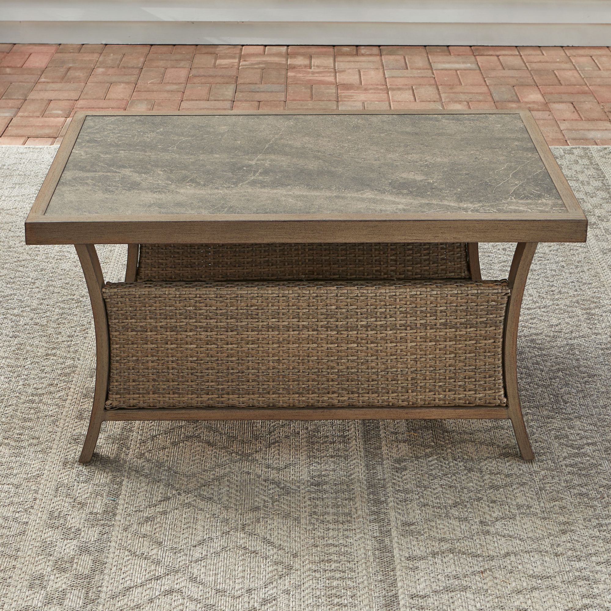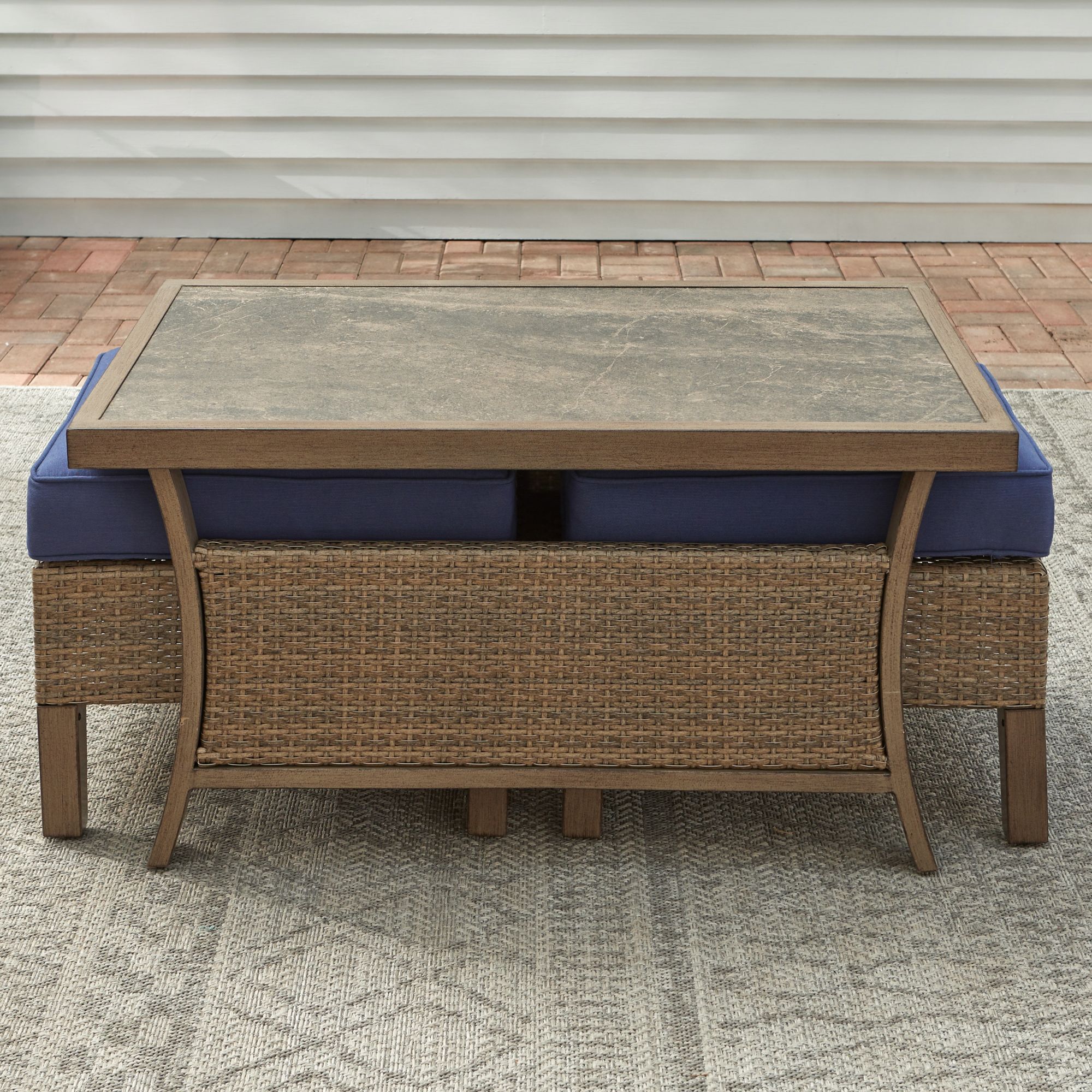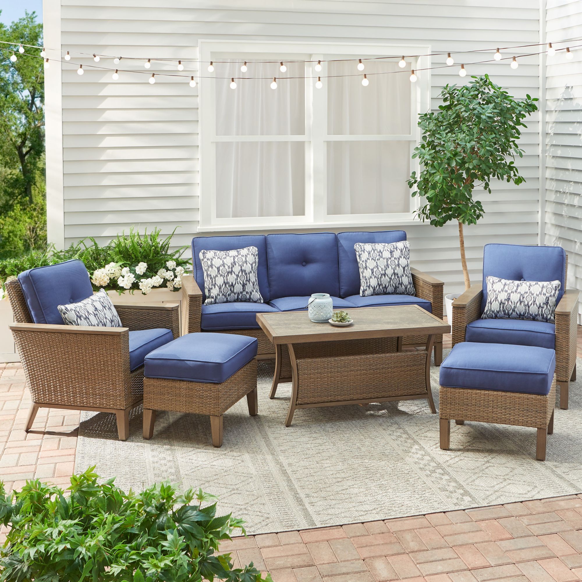 - Includes two deep seating cushioned wicker lounge chair with one pillow, one deep seating cushioned wicker sofa with two pillows, two cushioned wicker ottoman, one rectangular captured tile top woven coffee table