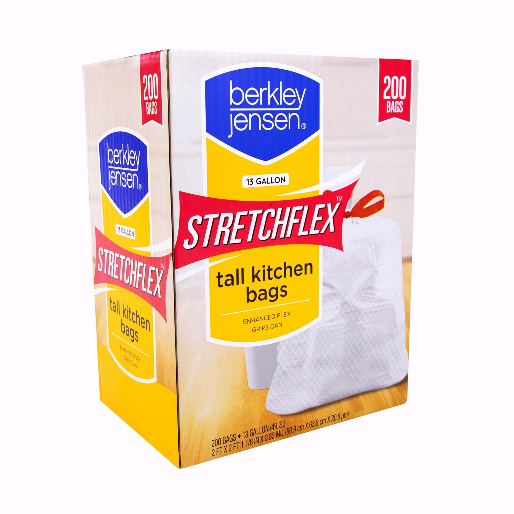 Get the most out of your trash bag with Berkley Jensen Stretchflex Tall Kitchen Bags. For use in the kitchen, these white trash bags offer a Stretchflex design, allowing them to fit securely around most waste containers. These interleaf bags provide an easy method of product removal from the packaging, one bag at a time. The bags have high opacity to conceal bag contents. This product was made with proprietary grades of linear low-density polyethylene. The multi-layer bag technology provides exceptional tear and puncture resistance. If you are not completely satisfied with your purchase, you are entitled to a 100% money back guarantee.