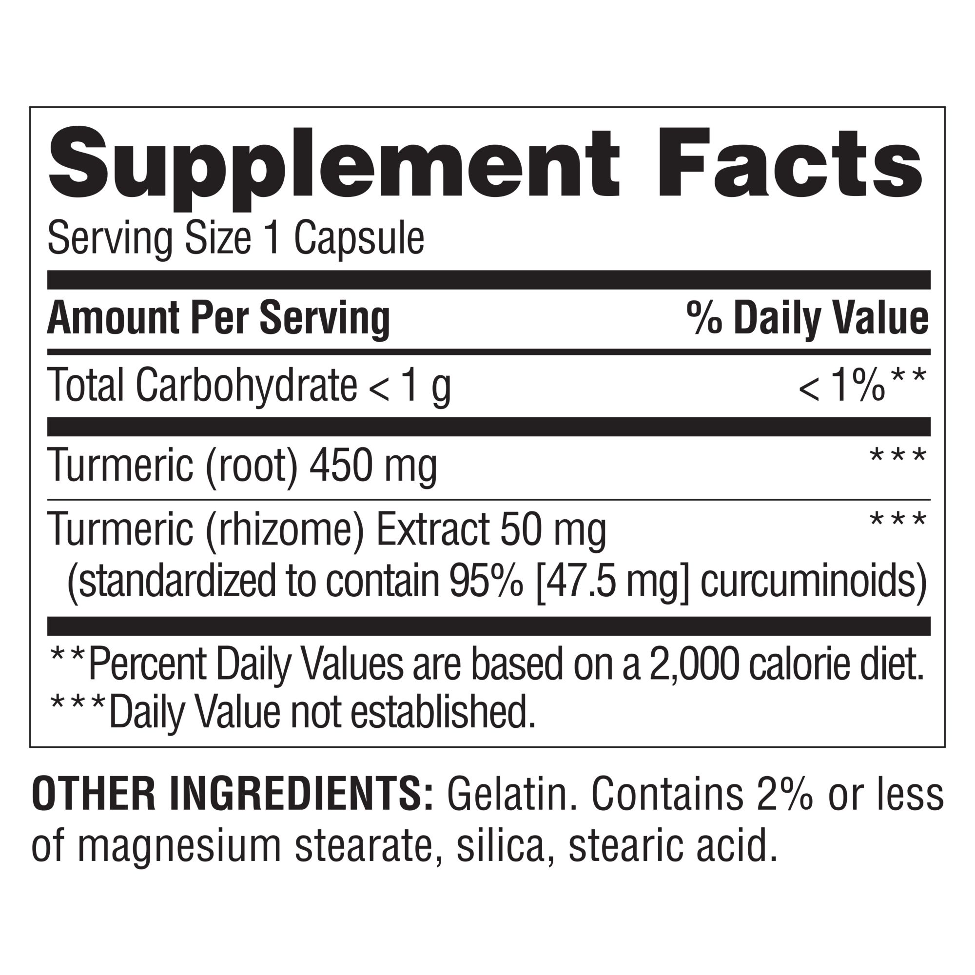 | Active Ingredients | Turmeric (Root) 450 mg **, Turmeric (Rhizome) Extract 50 mg ** (Standardized to Contain 95% [47.5 mg] Curcumins) |