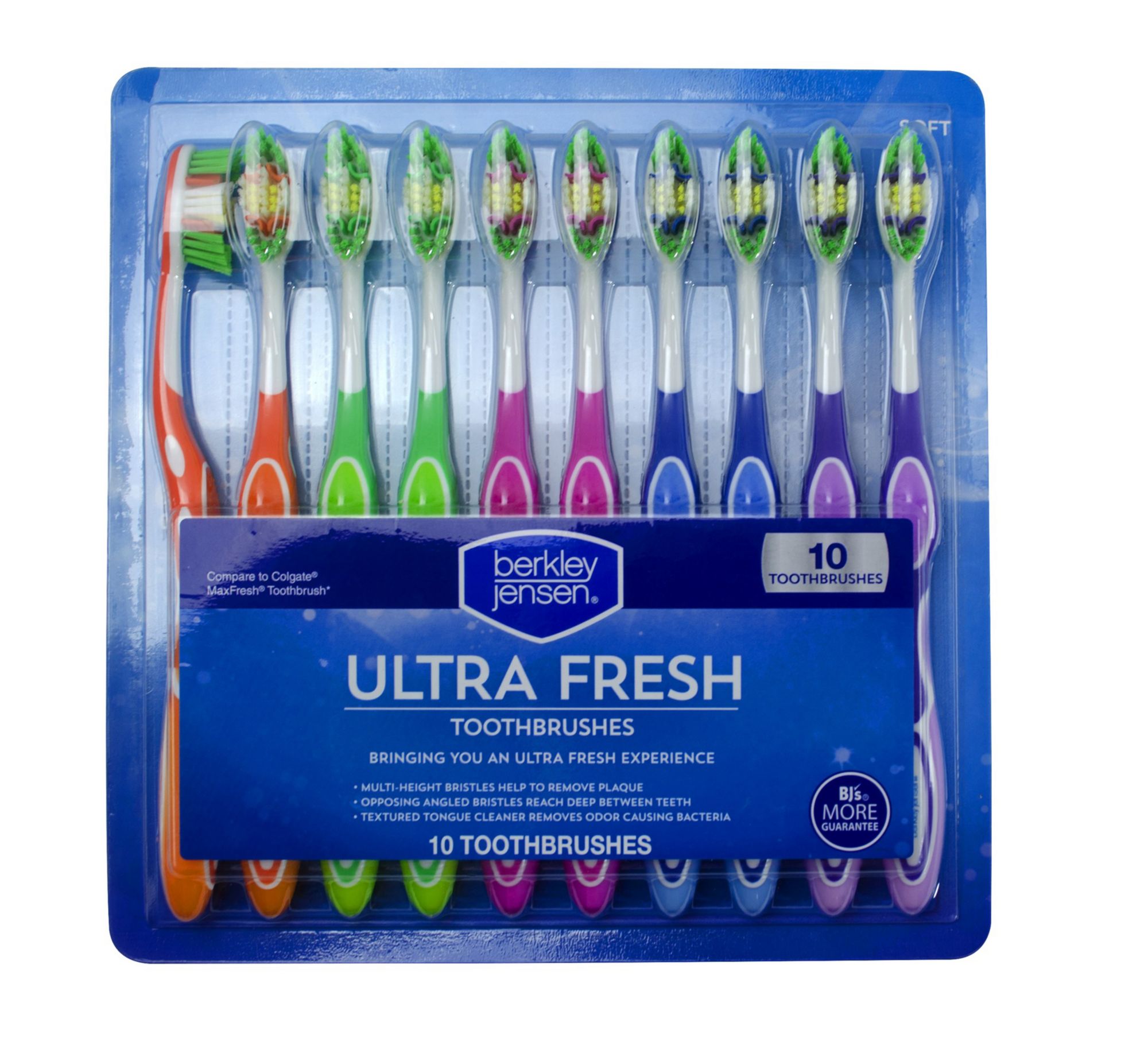 Keep your teeth clean with an ultra-fresh toothbrush from Berkley Jensen. Multi-height bristles help to remove plaque, while opposing angled bristles reach deep between teeth. The textured tongue-cleaner removes odor-causing bacteria for fresh breath.