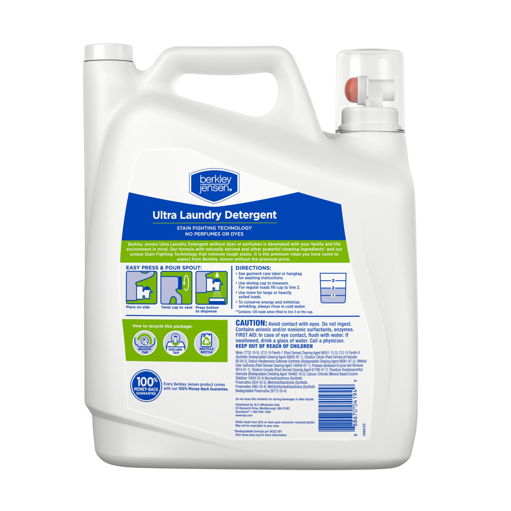 Berkley Jensen Liquid Laundry is free of perfumes and dyes, yet gives ultra cleaning power. Your clothes will come out of the laundry cleaner than ever, with tough stain-fighting technology that's still sensitive to skin.