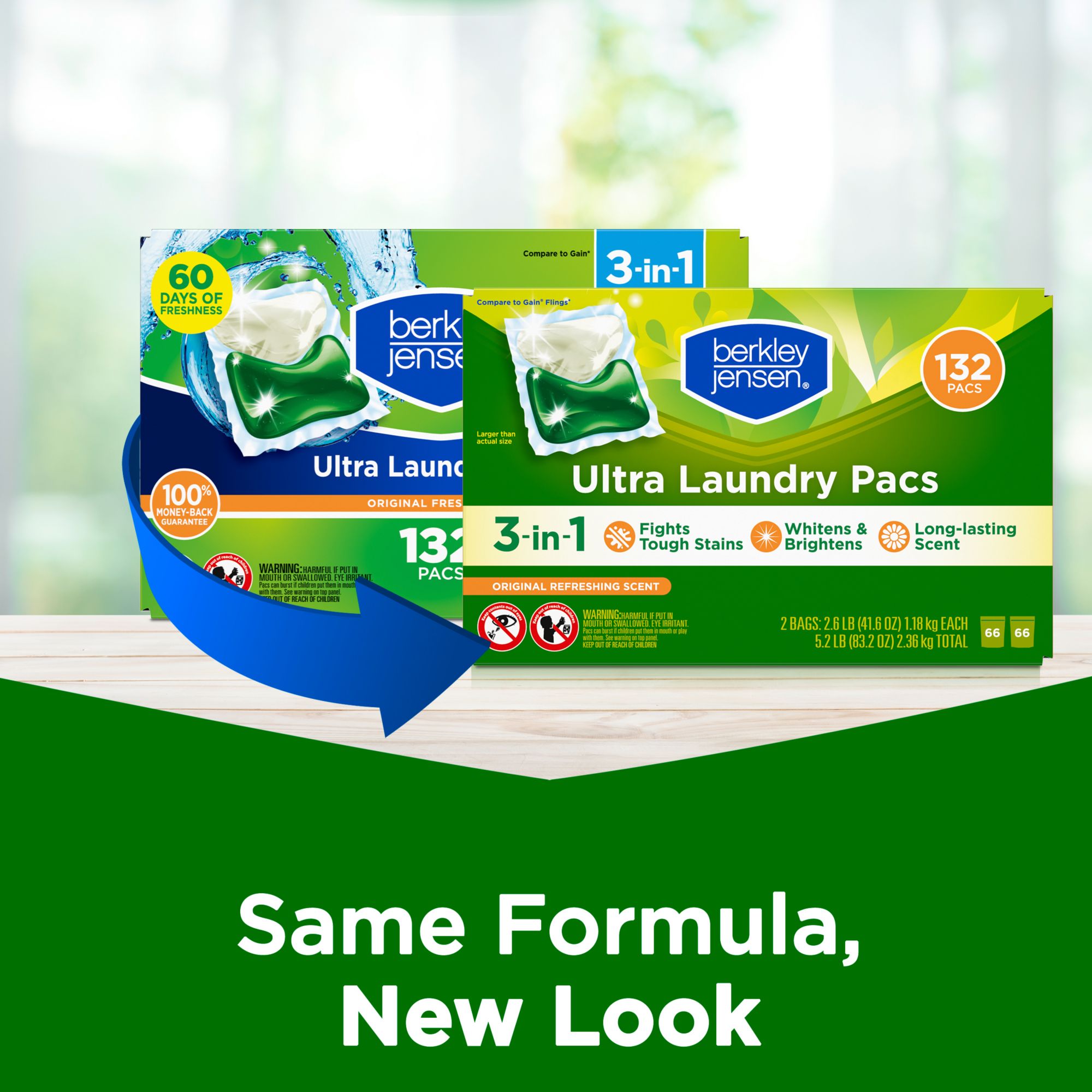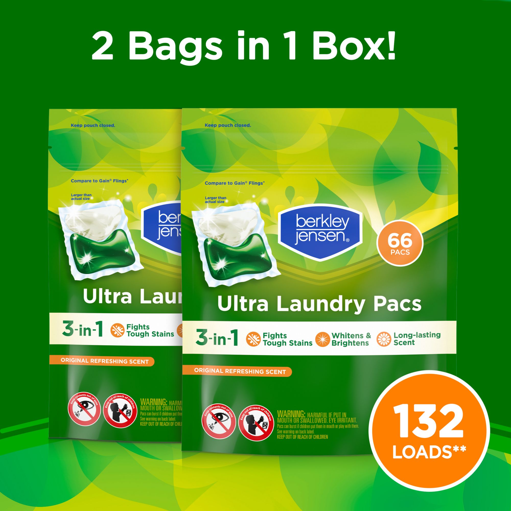 60 days of freshness Fights the toughest of stains in any water temperature Stain lifting enzymes fight tough dirt and stains and help prevent them from re-depositing Whitens and brightens your clothes Powerful clean in one step Works in all washing machines Keep out of reach of children Includes 132 laundry pacs