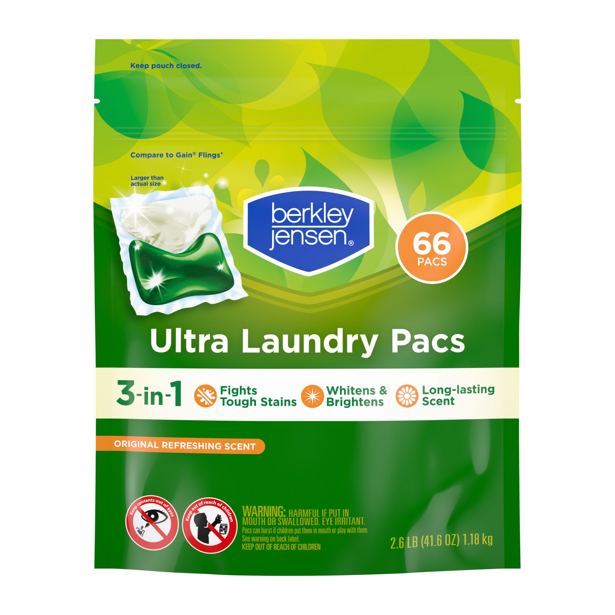 Berkley Jensen 3-in-1 Ultra Laundry Detergent Pacs are a convenient, dual-chambered, pre-measured dose of powerful laundry detergent. Developed with stain-fighting technology, the wash pac is made to fight even the toughest stains at any water temperature. Berkley Jensen's powerful formula, with stain lifting enzymes, fights tough dirt and stains and helps prevent them from re-depositing, to brighten, whiten and clean your clothes. You get a premium clean without the premium price and there are 60 days of freshness in every pac.