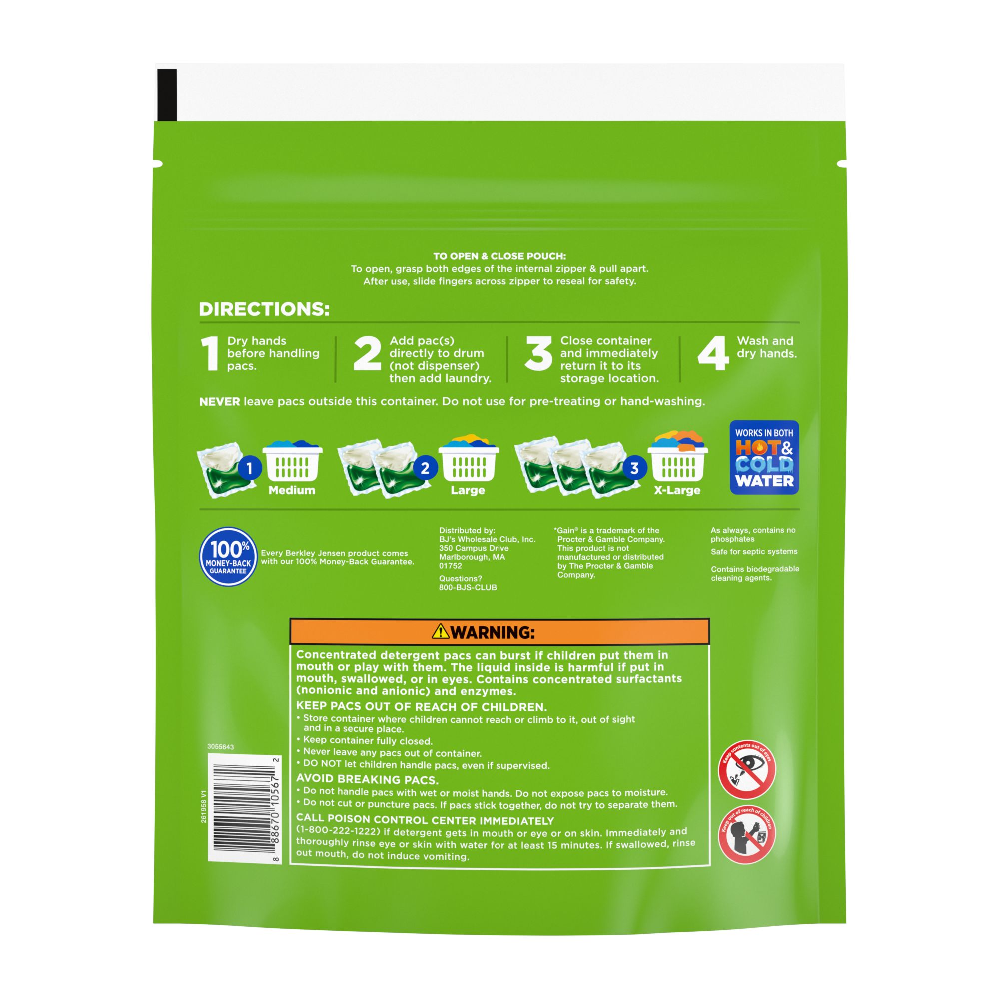 Concentrated detergent pacs can burst if children put them in their mouths or play with them The liquid inside is harmful if put in the mouth, swallowed, or in the eyes Contains concentrated surfactants (nonionic and anionic) and enzymes Keep pacs out of reach of children Store container where children cannot reach or climb to it, out of sight and in a secure place Keep container fully closed Never leave any pacs out of the container Do not let children handle pacs, even if supervised Avoid breaking pacs Do not handle pacs with wet or moist hands Do not expose pacs to moisture Do not cut or puncture pacs If pacs stick together, do not try to separate them; call the poison control center immediately at 1-800-222-1222 If detergent gets in mouth or eye or on the skin; immediately and thoroughly rinse eye or skin with water for at least 15 minutes If swallowed, rinse out mouth, do not induce vomiting