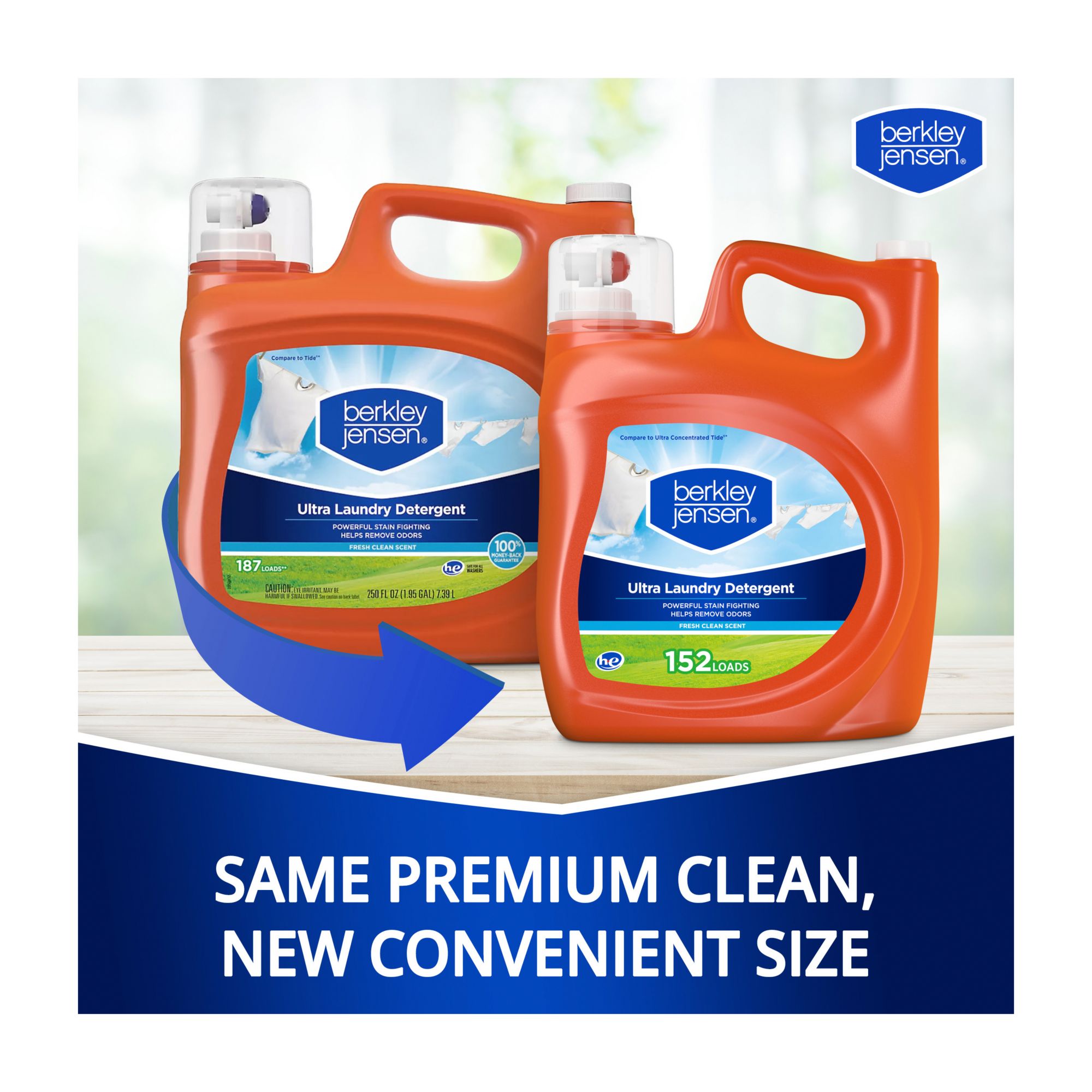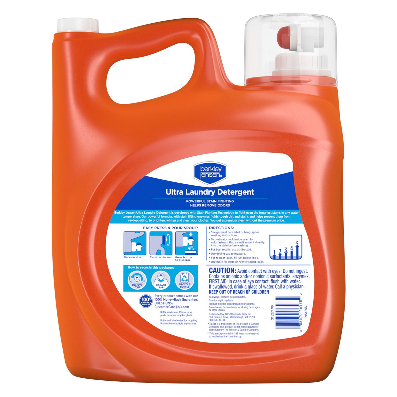 Exclusively at BJ's New convenient size Helps remove odors while using powerful stain fighting technology to combat dirt and tough stains with an anti-redeposition formula Brighten, whiten and clean your clothes with this easy-to-use liquid laundry detergent formulated to fight tough stains – even in cold water! Works in both HE compatible and non-HE washing machines Bottle is made from 25% or more post-consumer recycled plastic Every product has a satisfaction guarantee and comes with our 100% Money-Back Guarantee. Questions? Email CustomerCare@bjs.com Includes (1) Berkley Jensen Ultra Liquid Laundry Detergent, Fresh Clean Scent, 152 Loads, 200 fl. oz.