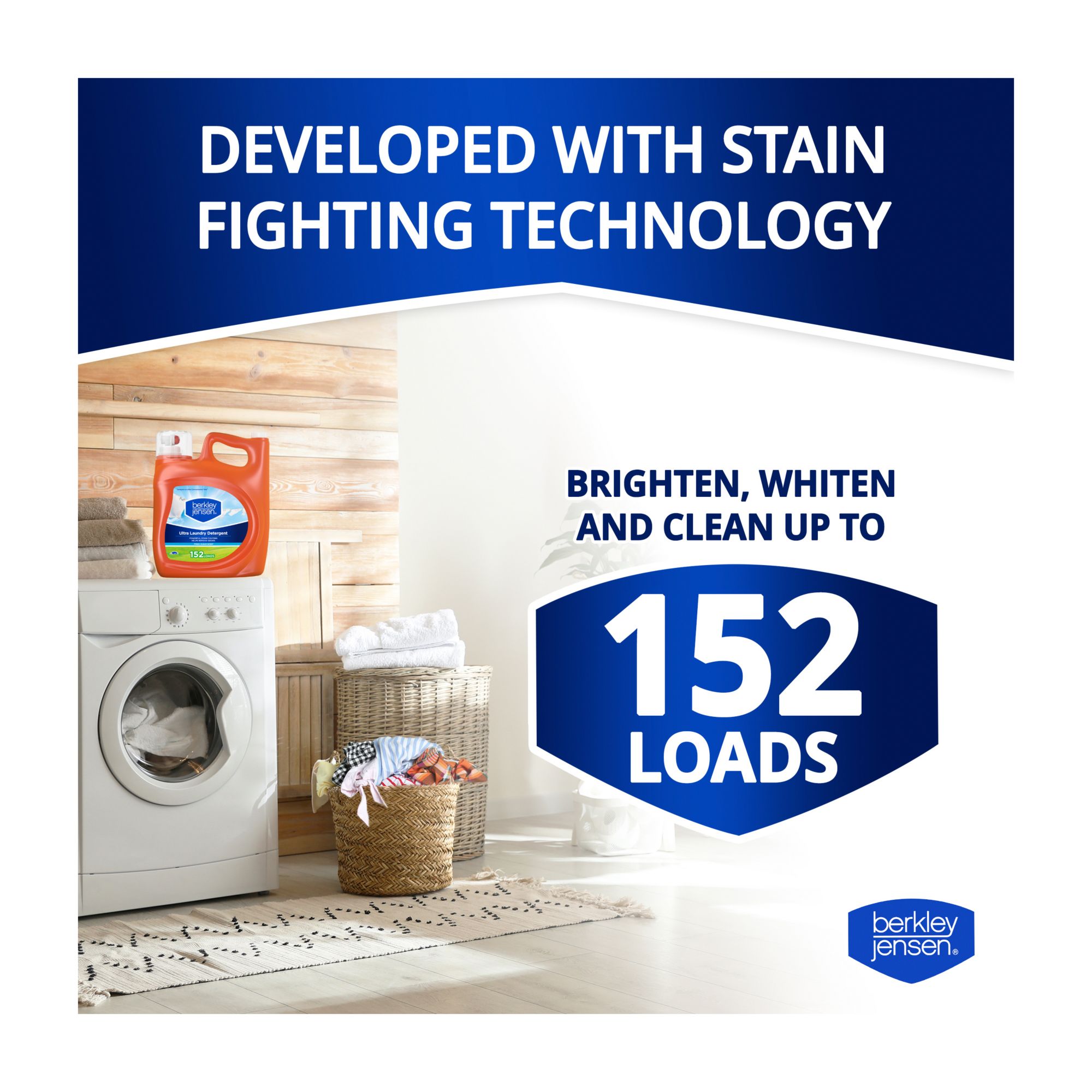 Experience the power of Berkley Jensen Ultra Liquid Laundry Detergent, Fresh Clean Scent, developed with Stain Fighting Technology to fight the toughest stains in any water temperature. Our powerful formula, with stain-lifting enzymes, fights tough dirt and stains. This liquid detergent helps prevent dirt and stains from re-depositing on the fabrics, to brighten, whiten and clean your clothes. This Berkley Jensen bottle comes with 200 fl. oz. of liquid detergent for up to 152 loads, measured to just below line 1 on the fill cup. You get a premium clean without the premium price. Complete your laundry routine with Berkley Jensen Liquid Fabric Softener and Dryer Sheets!