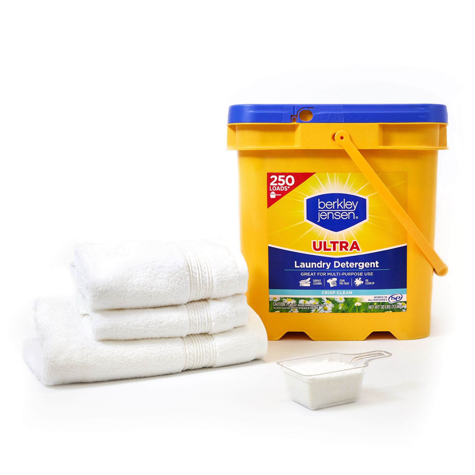 Exclusively at BJ's Great for multipurpose use - surface cleaning and oil cleanup Attacks stains Works in all machines Includes one bucket of Berkley Jensen powder laundry detergent with scoop, 30 lbs.