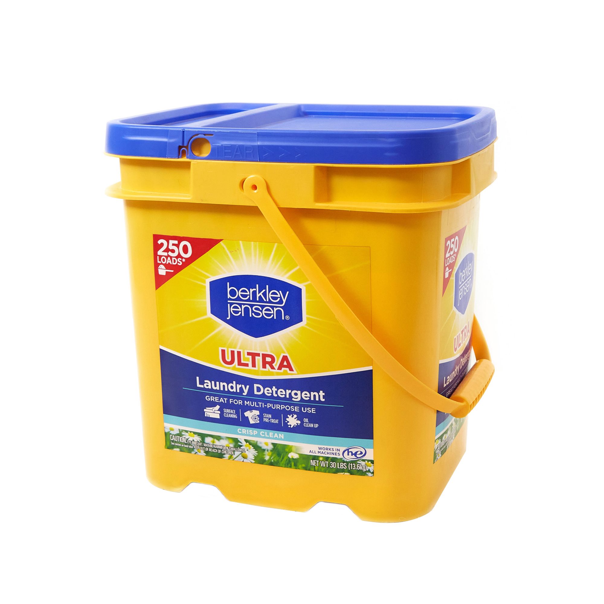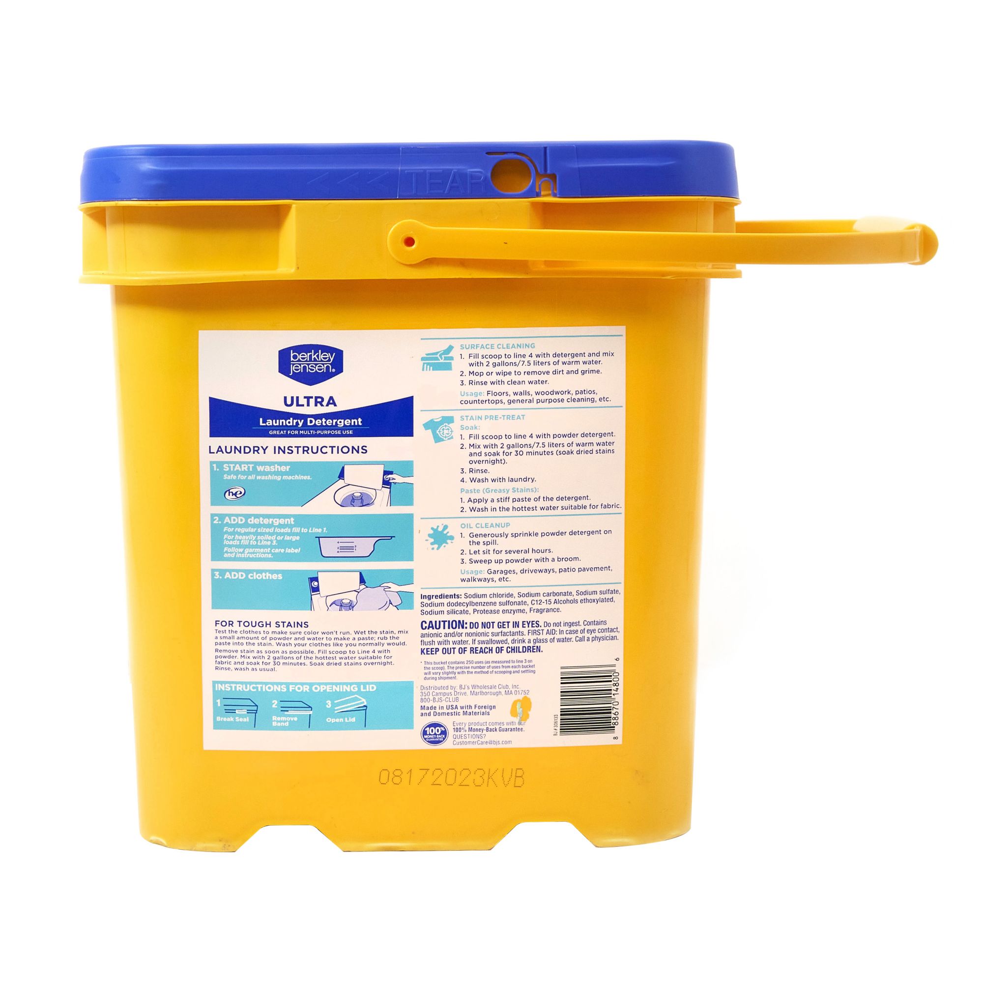 Exclusively at BJ's Great for multipurpose use - surface cleaning and oil cleanup Attacks stains Works in all machines Includes one bucket of Berkley Jensen powder laundry detergent with scoop, 30 lbs.