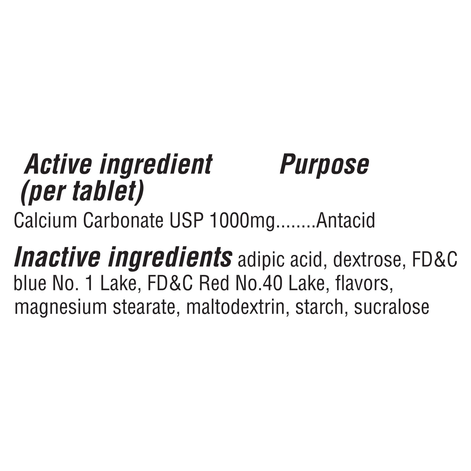Ingredients: Calcium Carbonate USP 1000mg, Adipic Acid, Dextrose, FD&C Blue No. 1 Lake, FD&C Red No. 40 Lake, Flavors, Magnesium Stearate, Maltodextrin, Starch, Sucralose