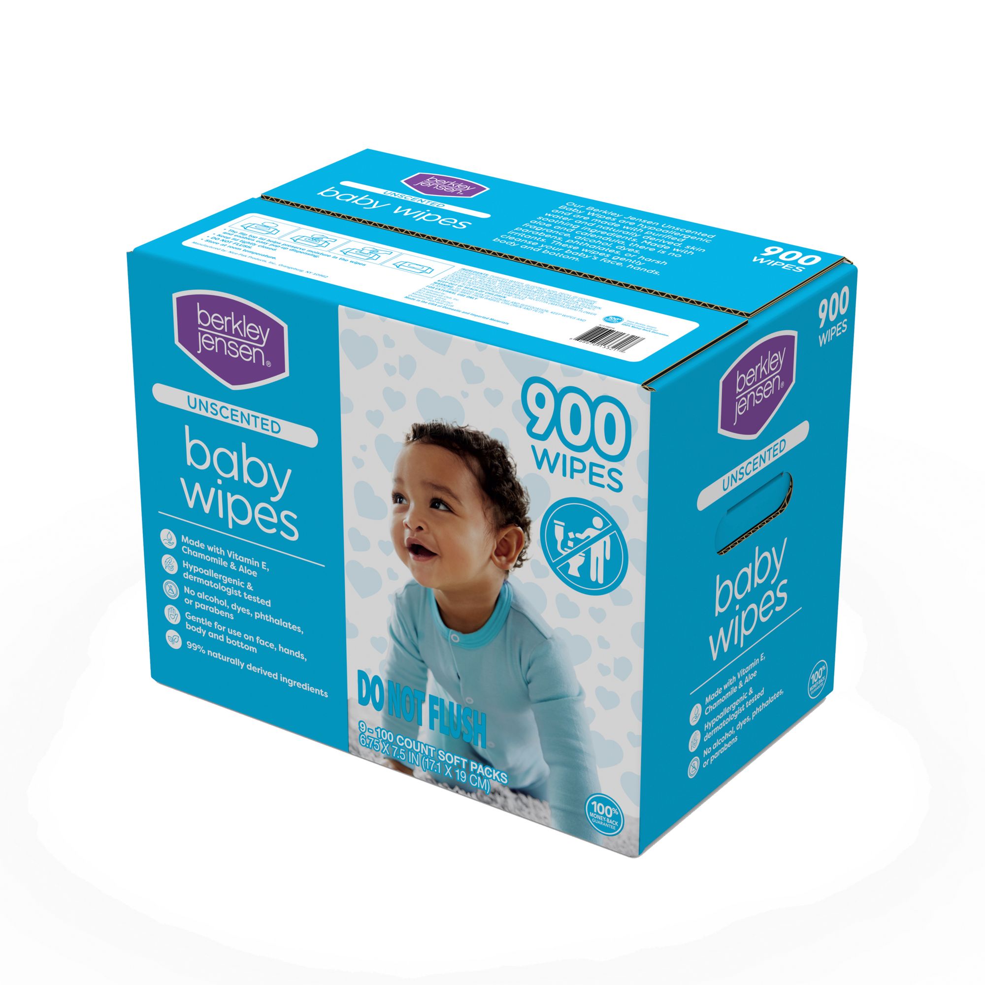 Includes unscented baby wipes, 9 pk./100 ct. each