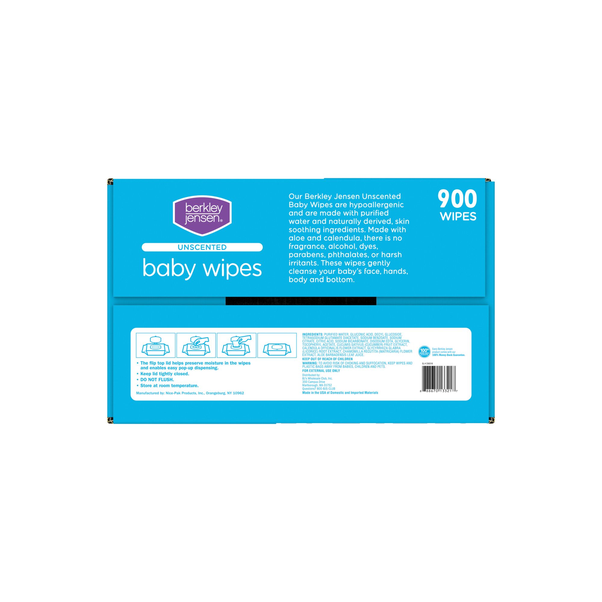 Berkley Jensen Unscented Baby Wipes are hypoallergenic, and made with purified water and naturally derived, skin soothing ingredients. Containing aloe and calendula, there is no fragrance, alcohol, dyes, parabens, phthalates, or harsh irritants. These wipes gently cleanse your baby’s face, hands, body and bottom.