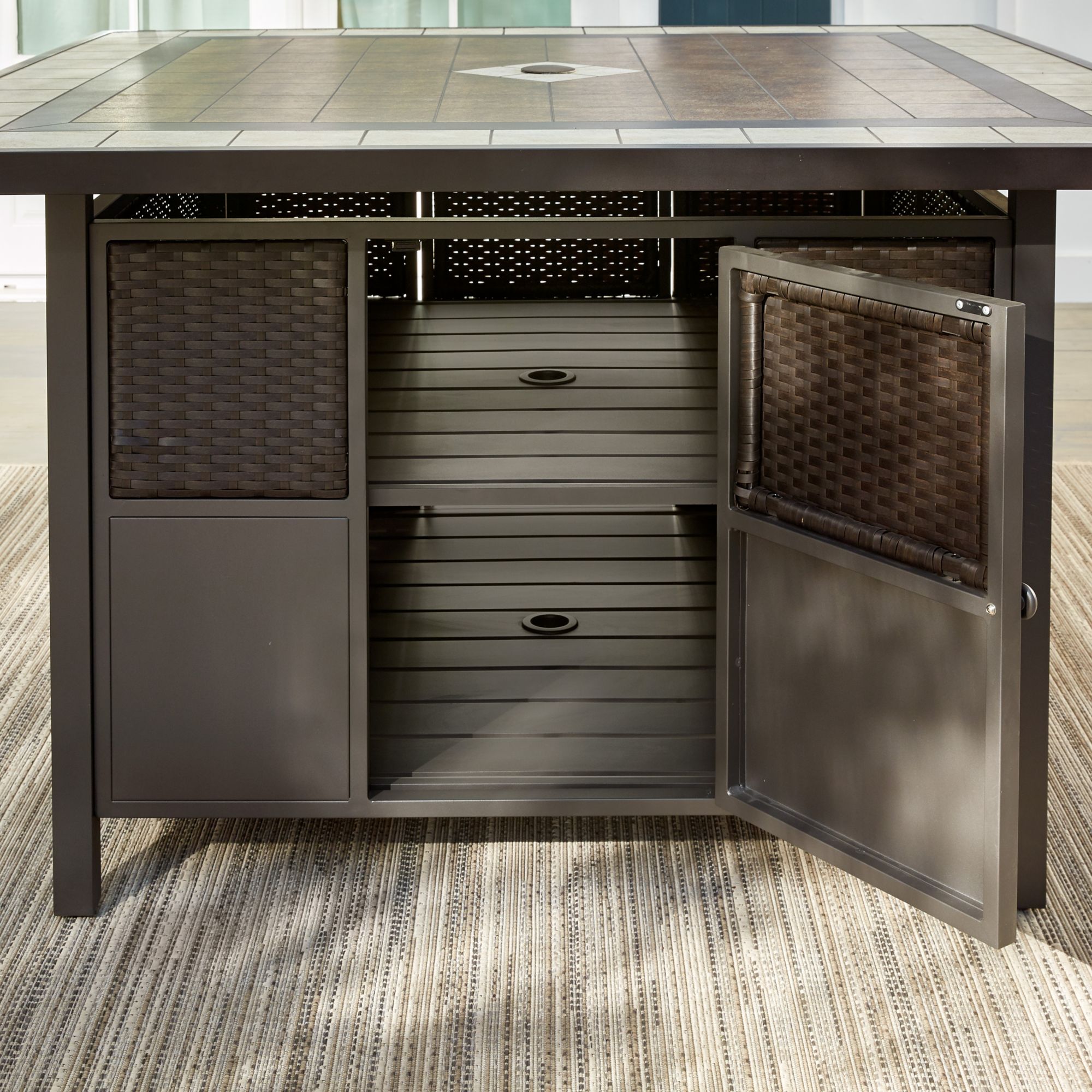 This nine-piece high dining set with table storage from Berkley Jensen features an all-aluminum non-rust make. This set comes with all-motion swivels high rocking chairs, aluminum engraved faux stone tabletop, with built-in storage.