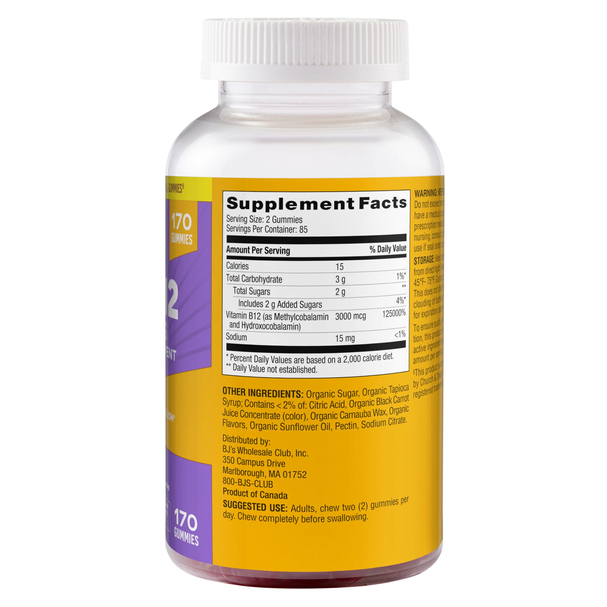 The Berkley Jensen Vitamin B12 3,000mcg Gummy 170 ct. is a delicious, raspberry-flavored, vegetarian gummy. It's organic, gluten free, and contains 3,000mcg Vitamin B12 to support the nerve system and cardiovascular health. B12 also plays a role in the formation of red blood cells and aids in the conversion of food to energy.