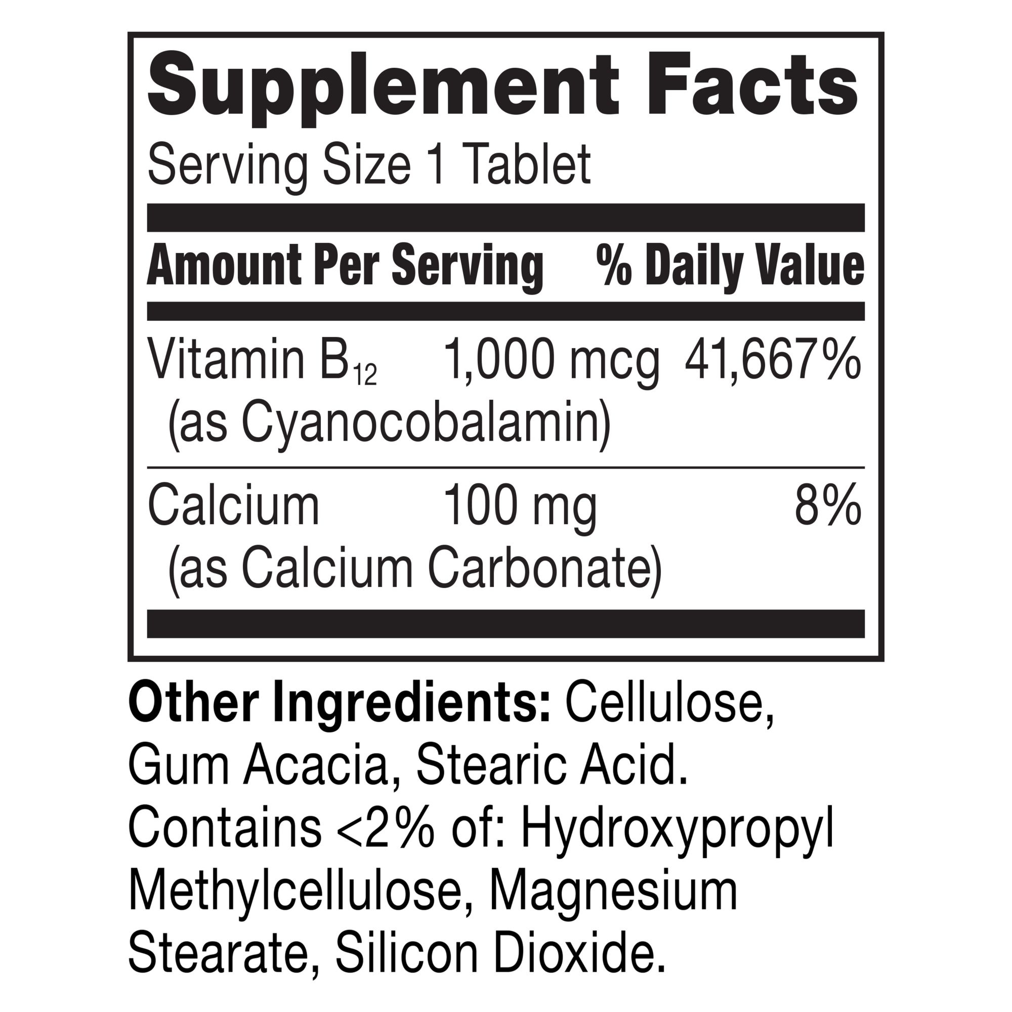 Ingredients: Vitamin B-12 (as Cyanocobalamin), Calcium (as Calcium Carbonate). Other Ingredients: Cellulose, Gum Acacia, Stearic Acid. Contains <2% of: Hydroxypropyl Methylcellulose, Magnesium Stearate, Silicon Dioxide.