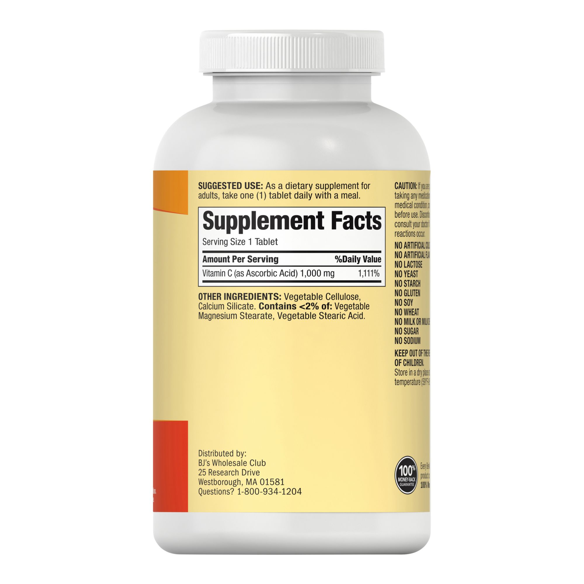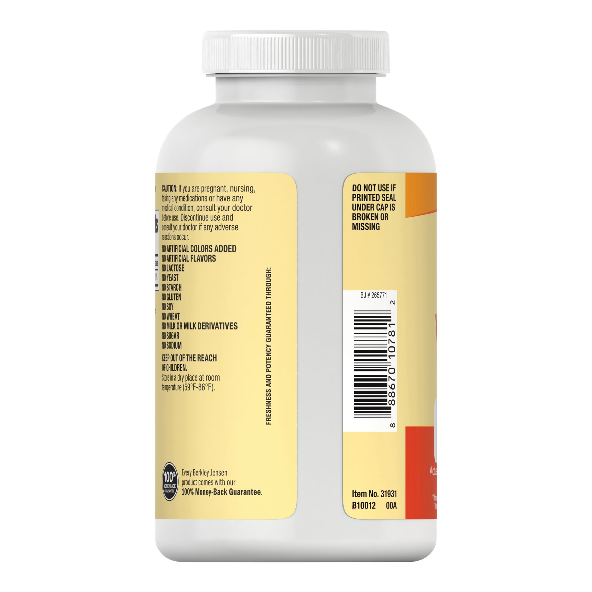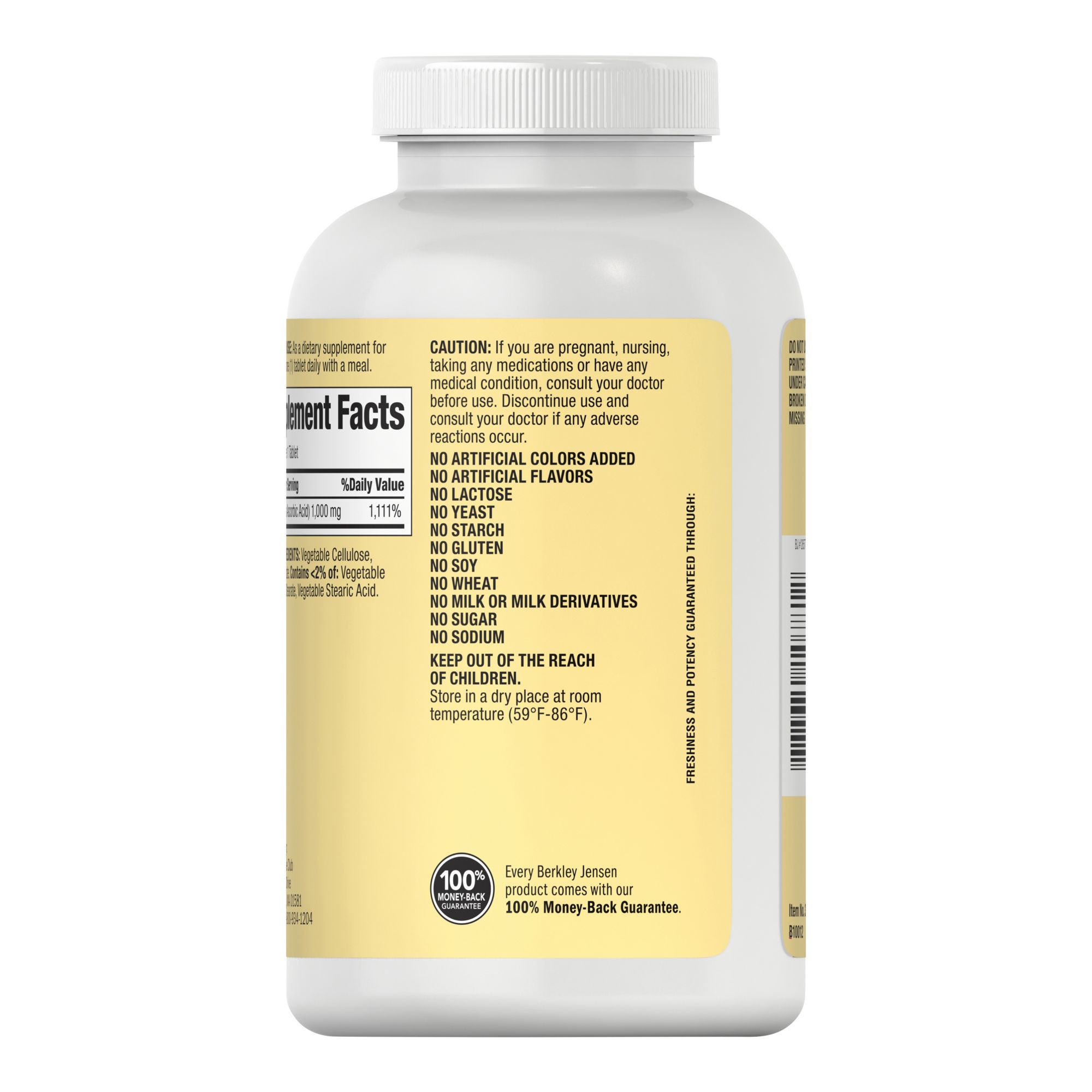 Berkley Jensen vitamin C is 1,000mg of vitaminic C that will help support immune health non-GMO. No sugar, no starch, no milk, no lactose, no soy, no gluten, no wheat, no yeast, no fish. Sodium free. Suitable for vegetarians.