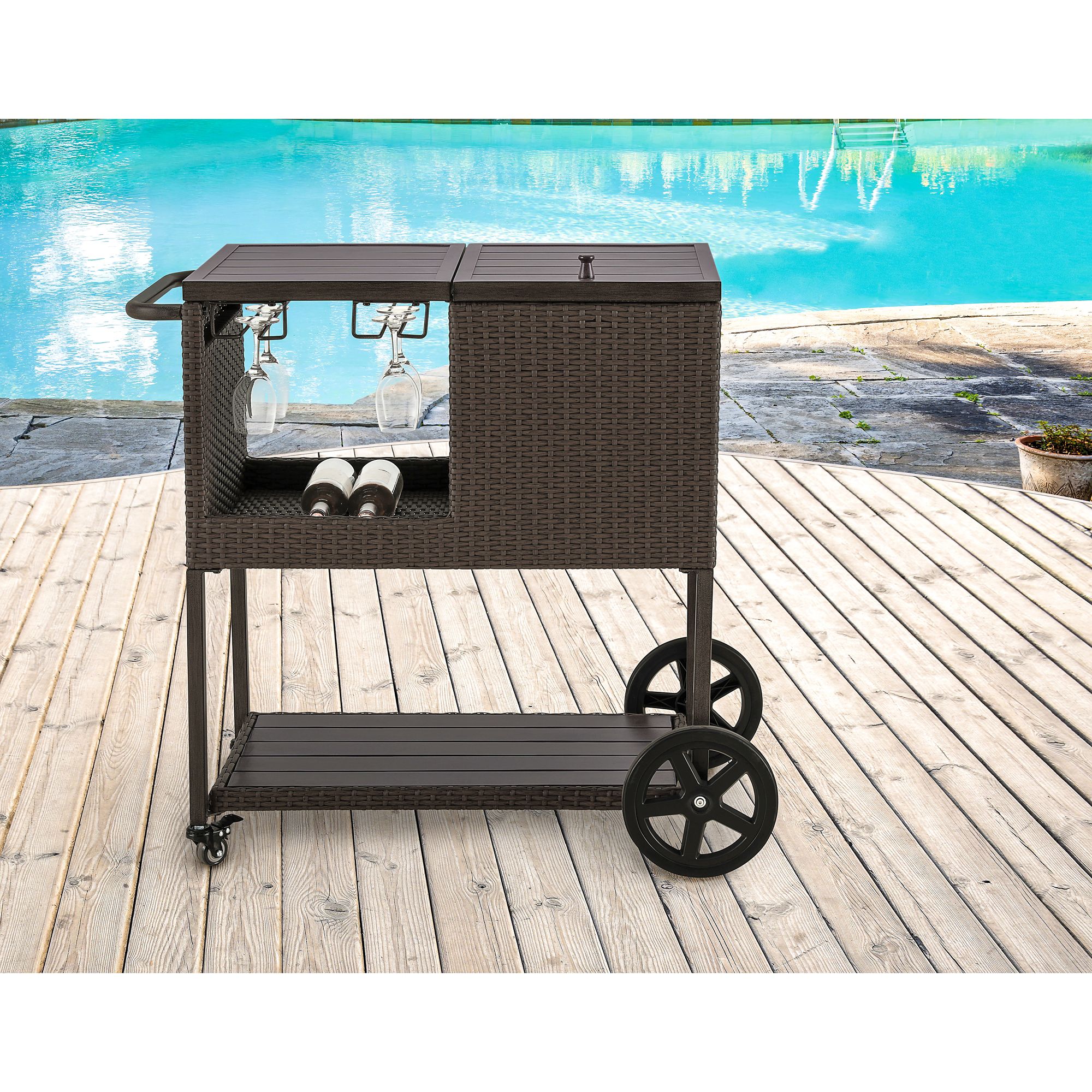 The Berkley Jensen Wicker Bar Cart is great for backyard parties and events. This Berkley Jensen wicker bar cart provides you the ultimate in party needs with key features including built in steel cooler, wine rack, extra large bottom storage shelf for bottles and a slat top for cocktail preparation. Multi-directional wheels make the cart easy to maneuver and push. Enjoy those summer nights outside on your patio and never have to go inside for beverages or ice.