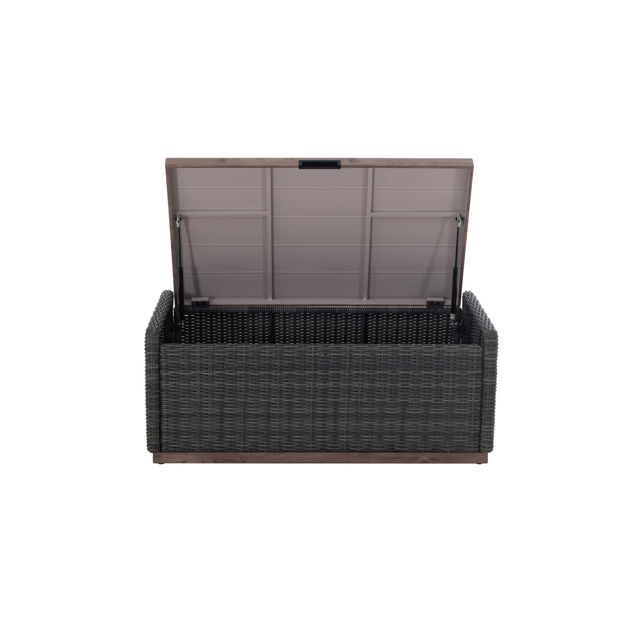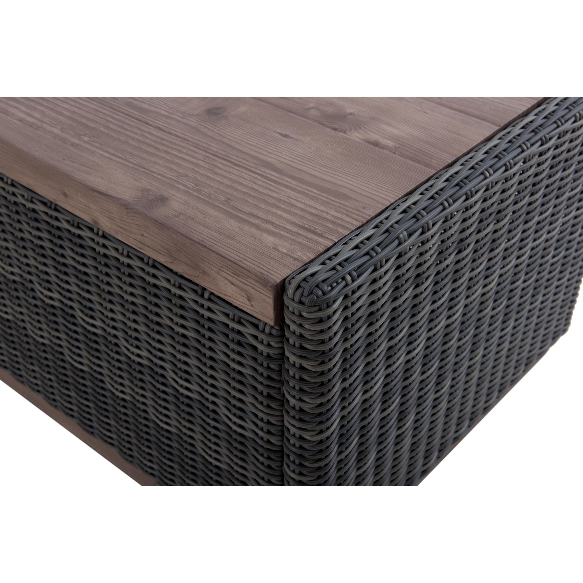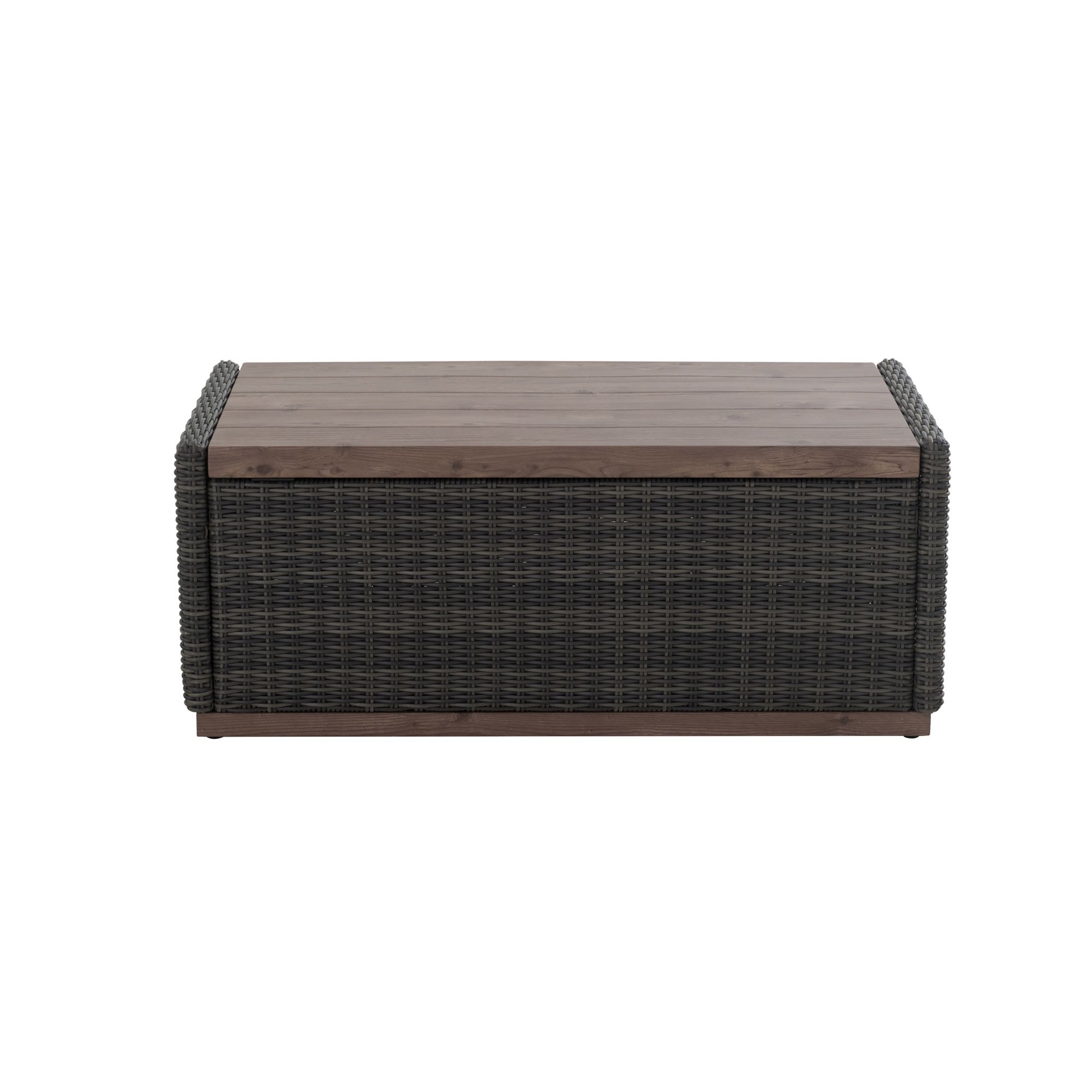 This versatile storage coffee table looks beautiful in any outdoor setting. The rich brown mixed with gray tones are hand-wove with a decorative wood finish combine splendidly with the all-weather resin wicker. The table has ample storage for blankets, kids’ toys, cushions and more. The air spring and pneumatic rods allow for smooth opening and closing.