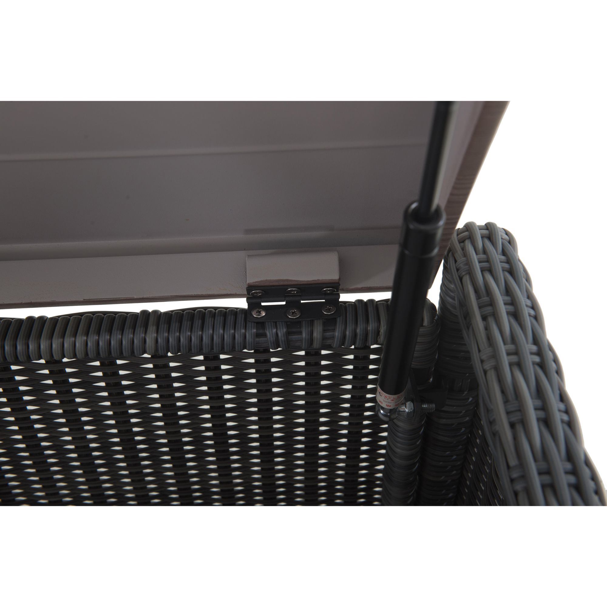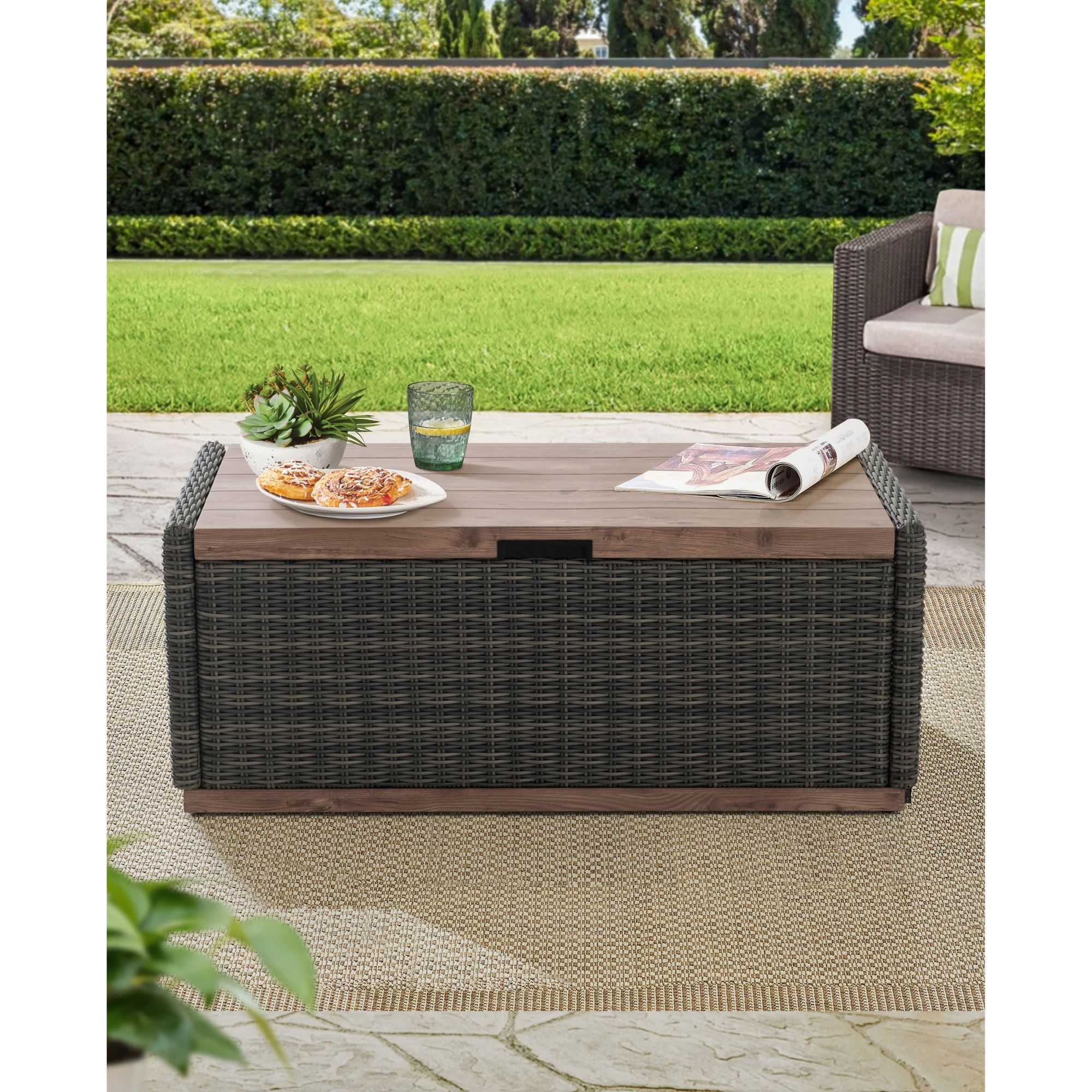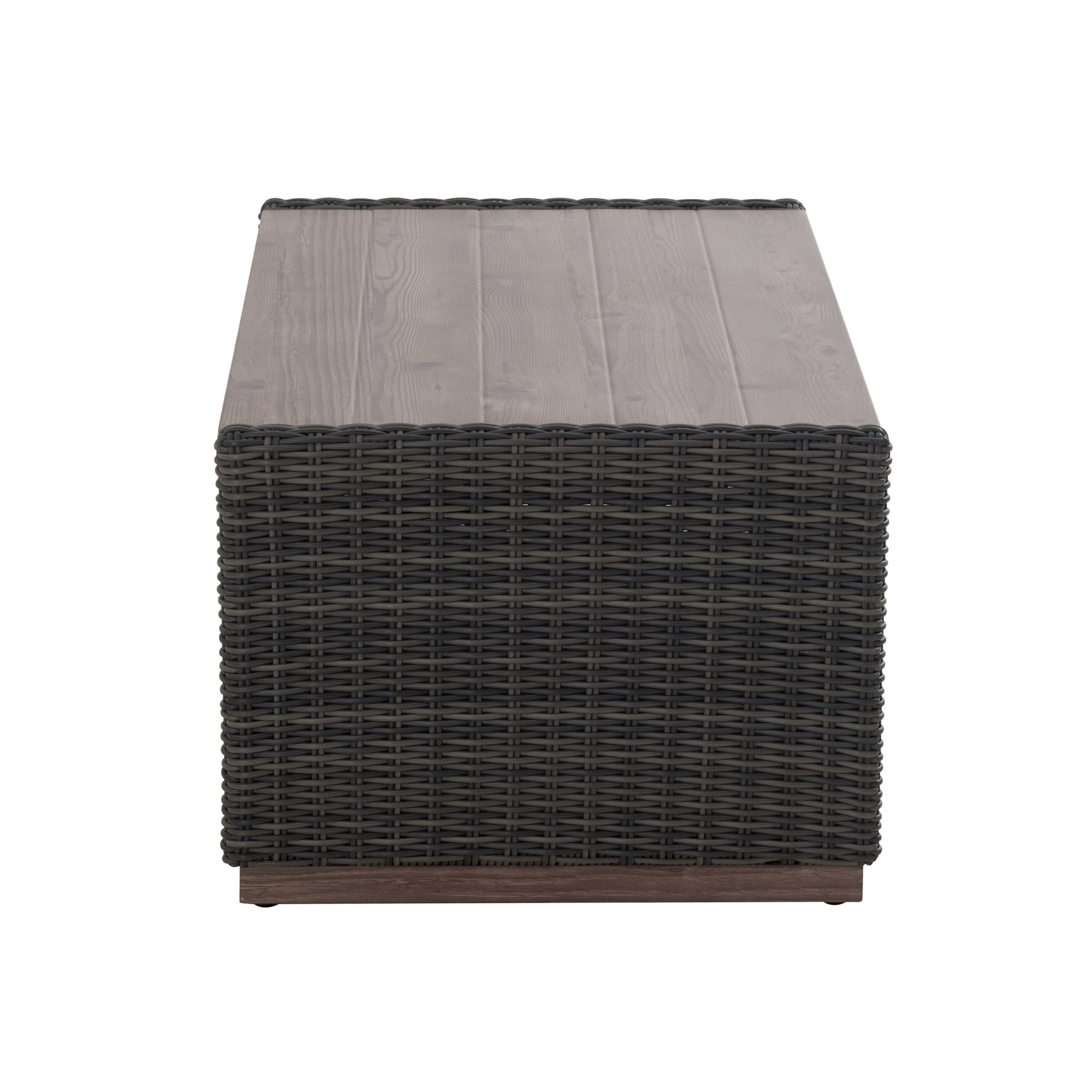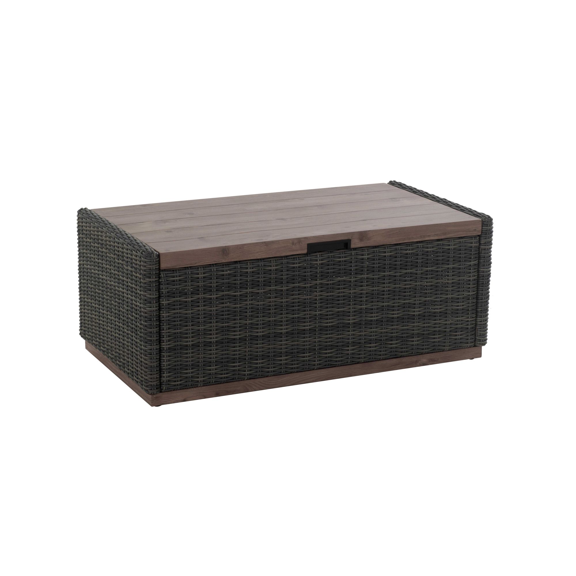 This versatile storage coffee table looks beautiful in any outdoor setting. The rich brown mixed with gray tones are hand-wove with a decorative wood finish combine splendidly with the all-weather resin wicker. The table has ample storage for blankets, kids’ toys, cushions and more. The air spring and pneumatic rods allow for smooth opening and closing.