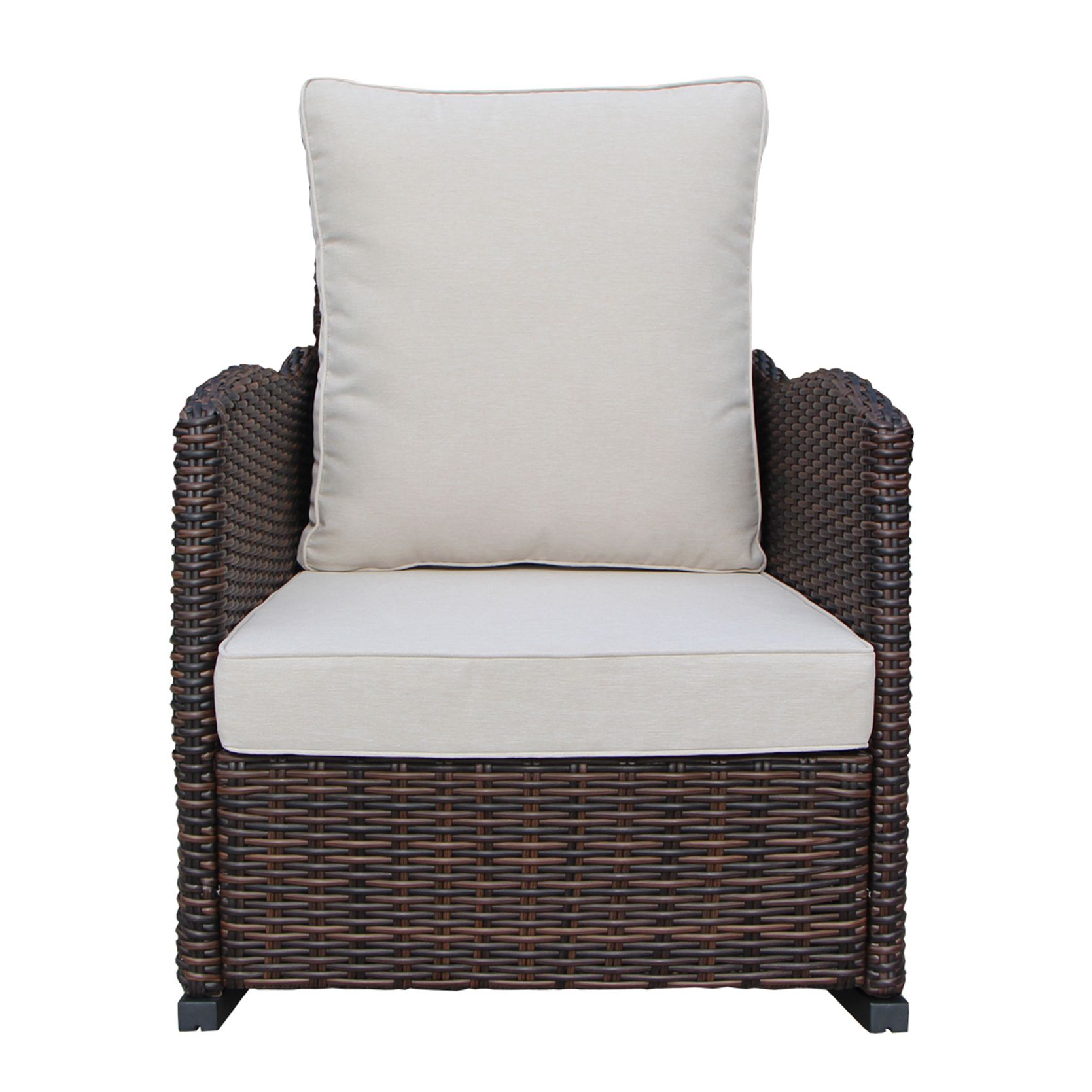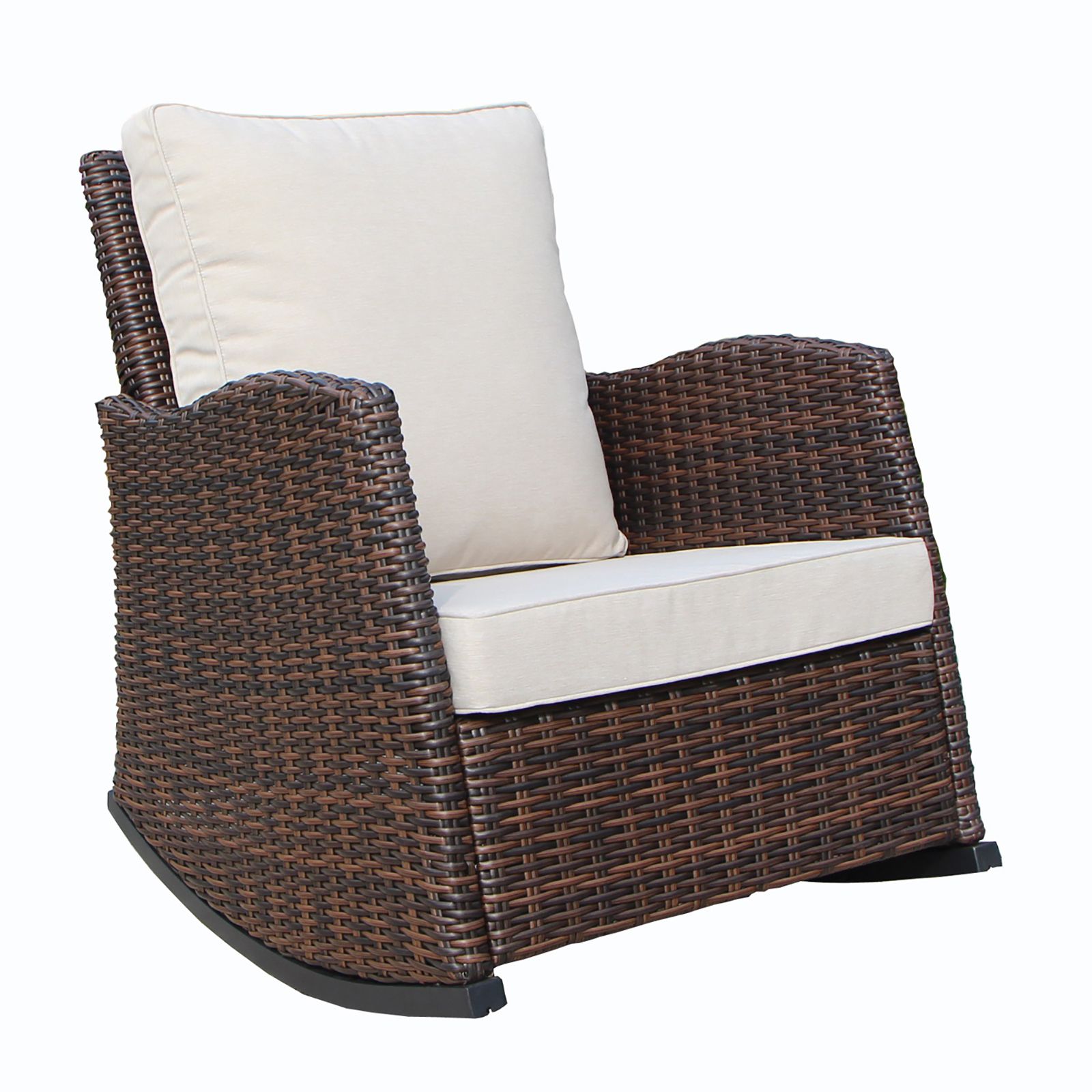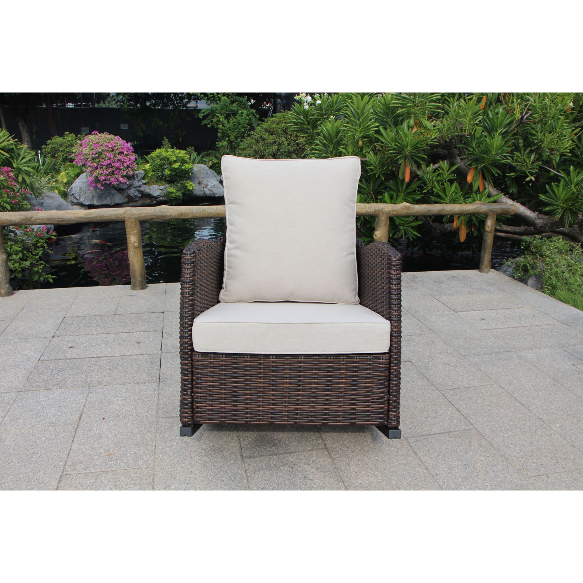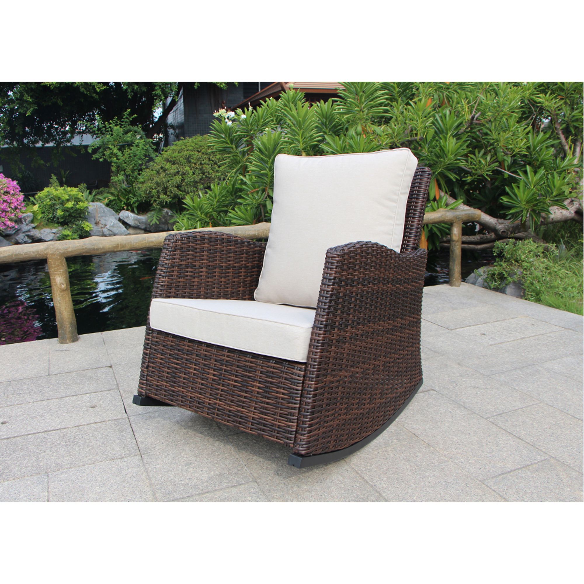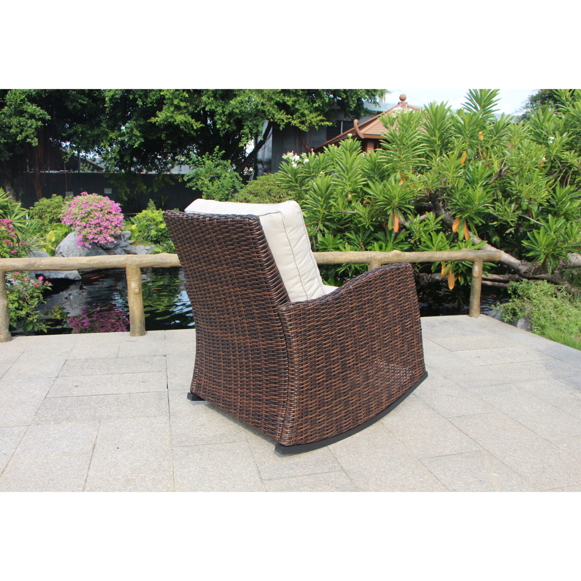 Dark brown all-weather UV-resistant PE wicker Handwoven on powder-coated rust-resistant aluminum frames Lightweight but robust Flat packed for easy assembly Includes wicker rocking chair, aluminum frame and cushion Warranty: 2 years