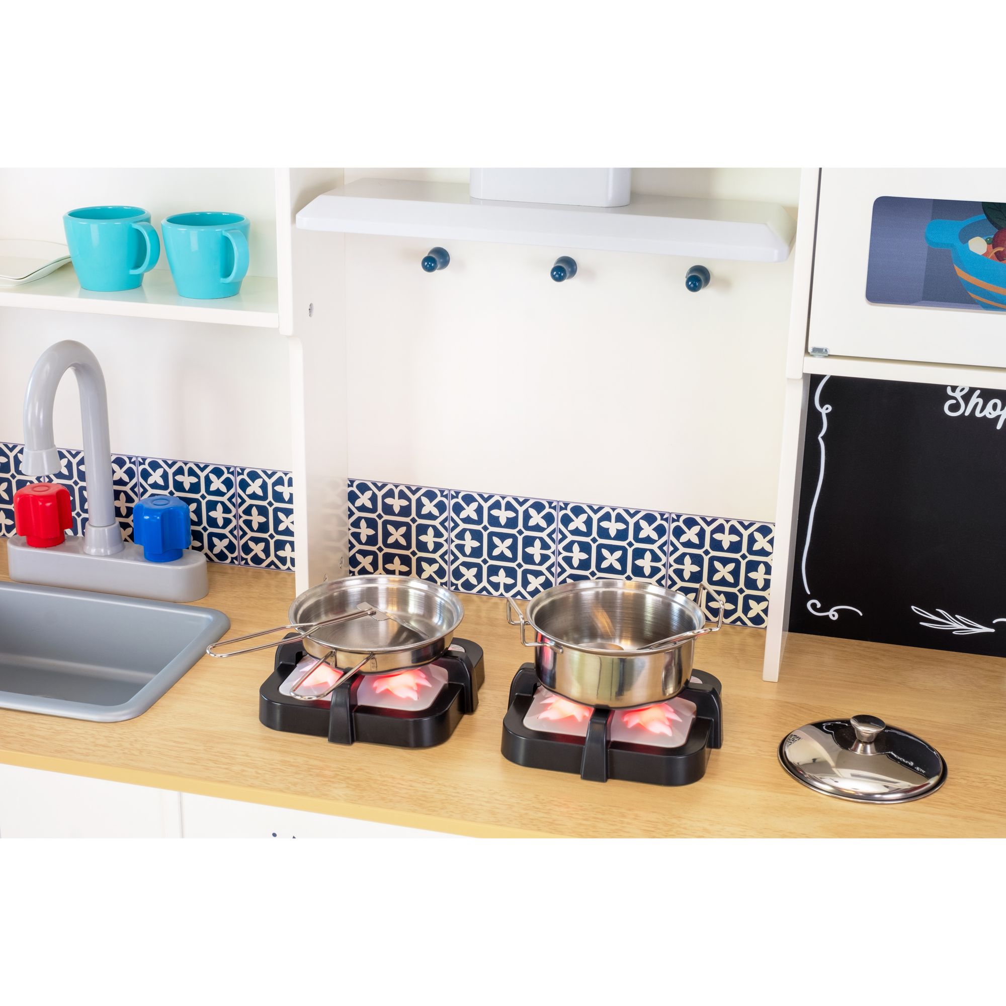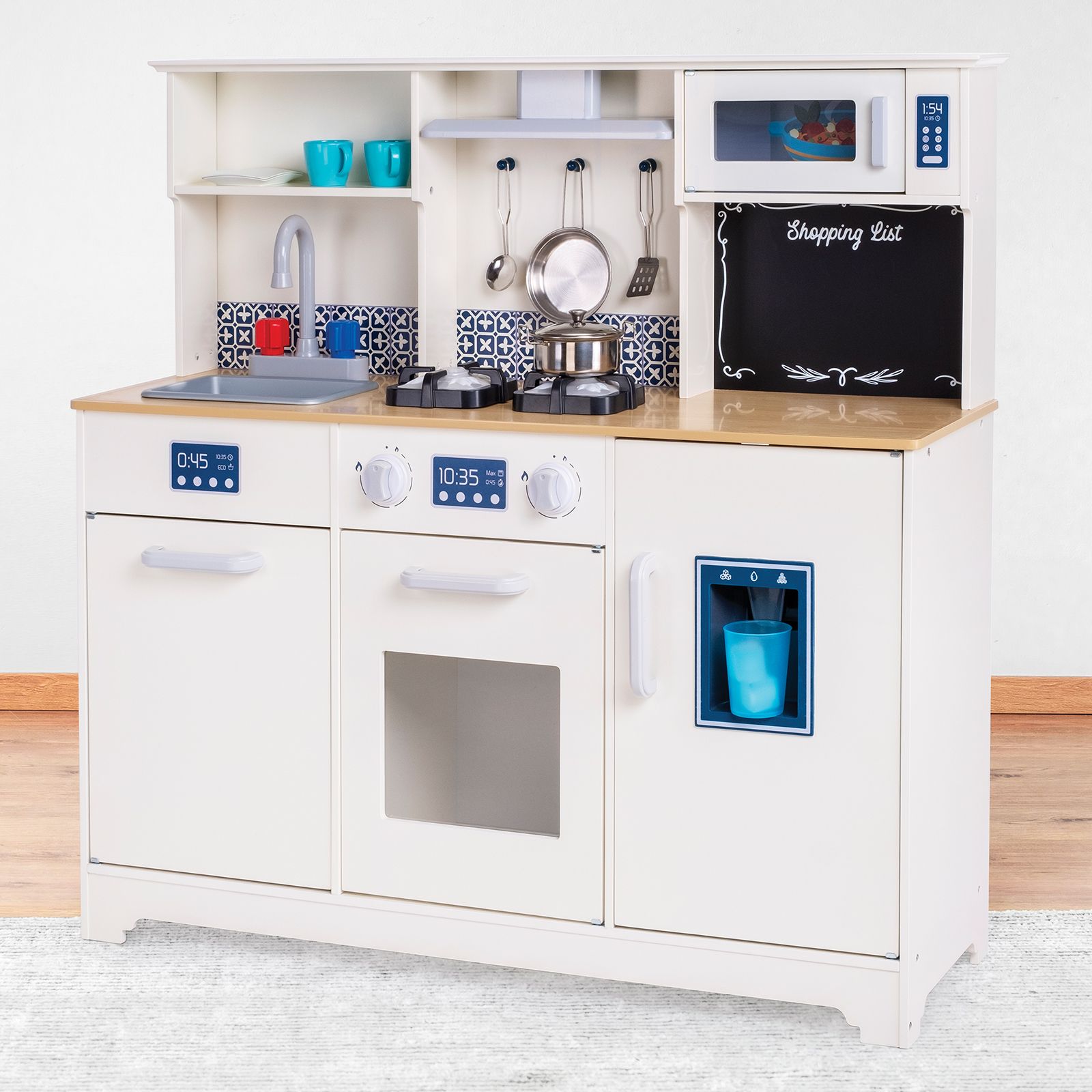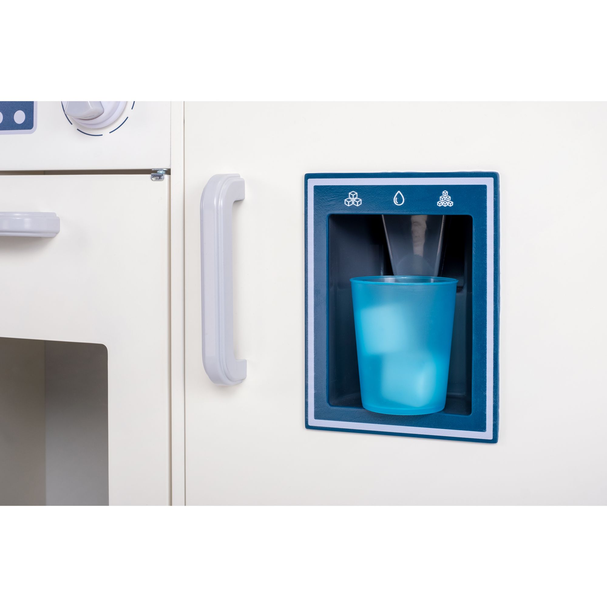Includes two light and sound burners, taps and faucet, sink, oven, fridge, dishwasher, chalkboard, microwave, extractor, a dispensing play ice maker with two ice cubes and a cup, two coffee cups, two plates, frying pan, spatula, saucepan with lid, and spoon