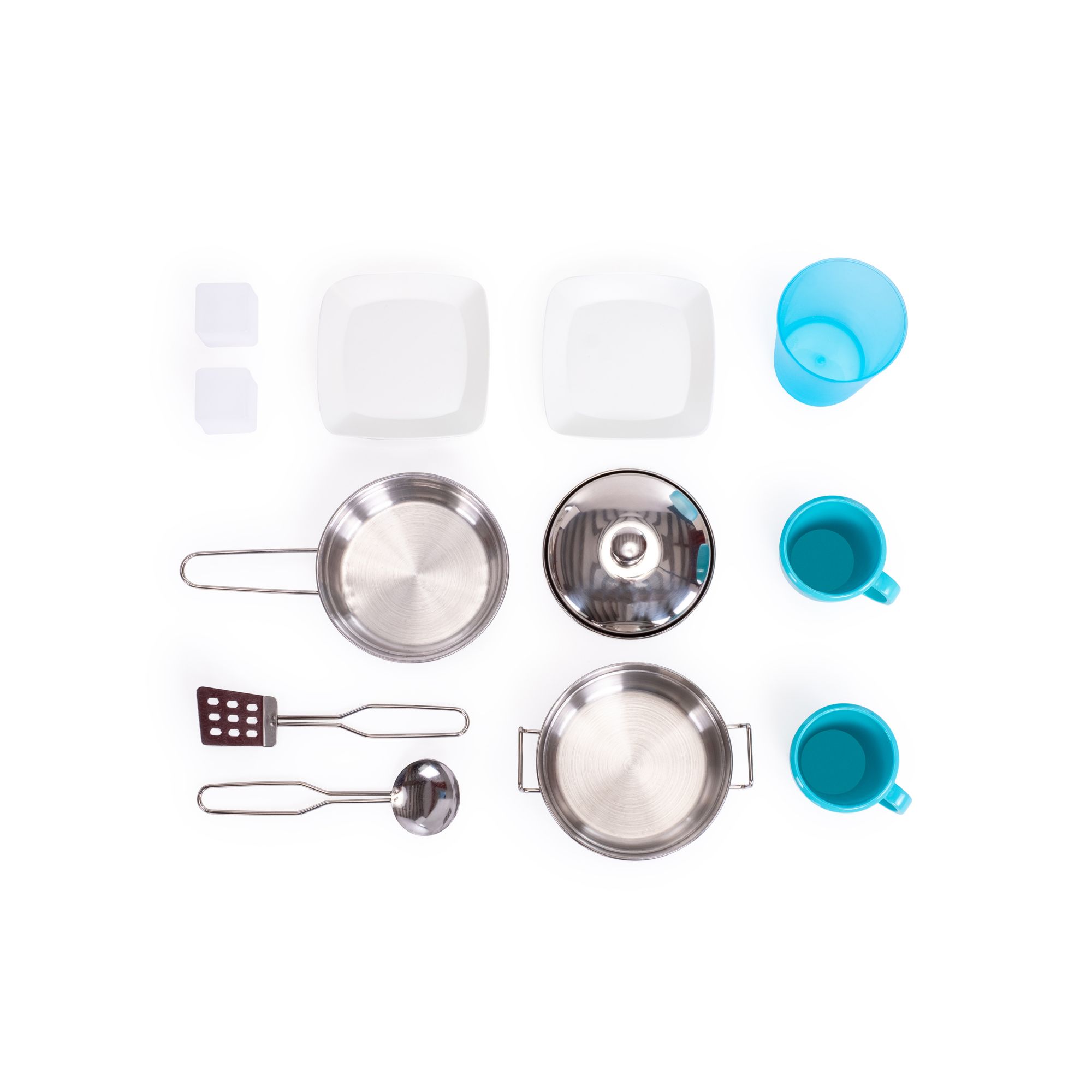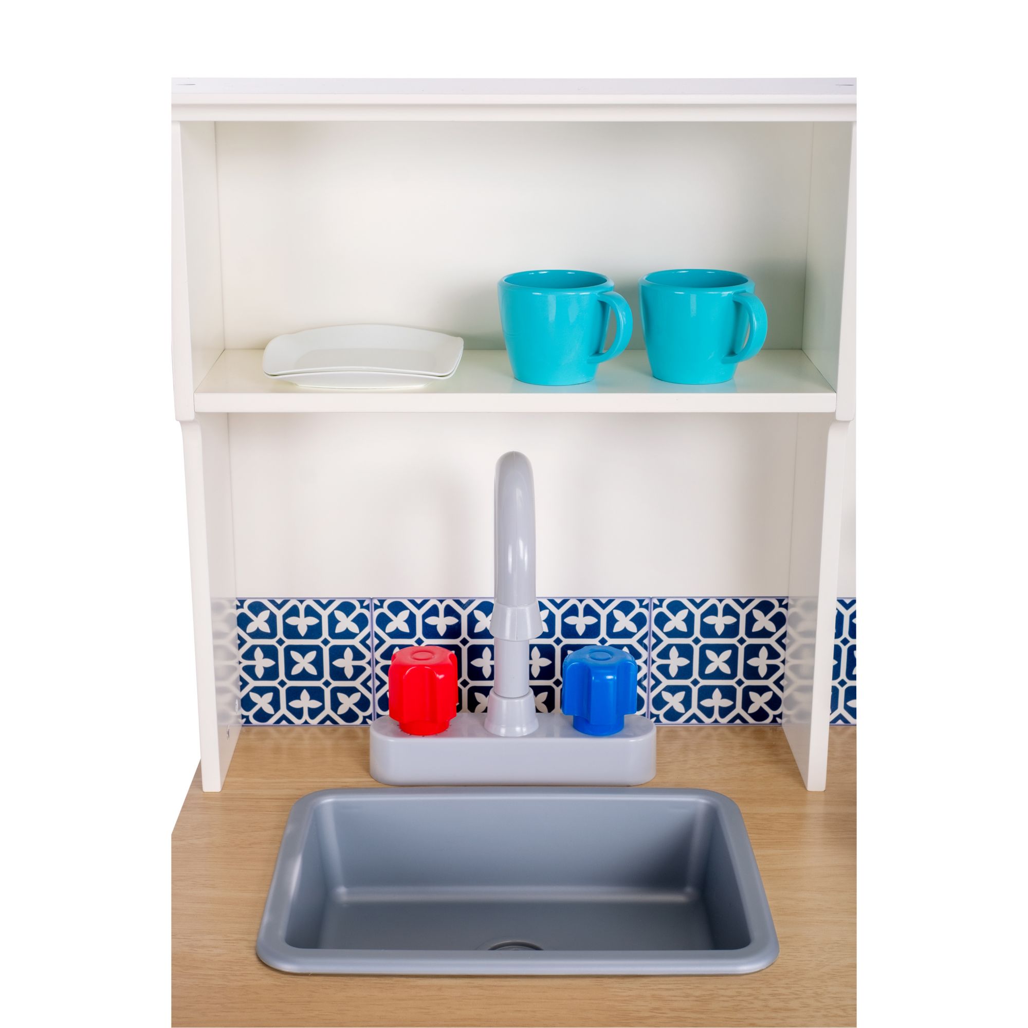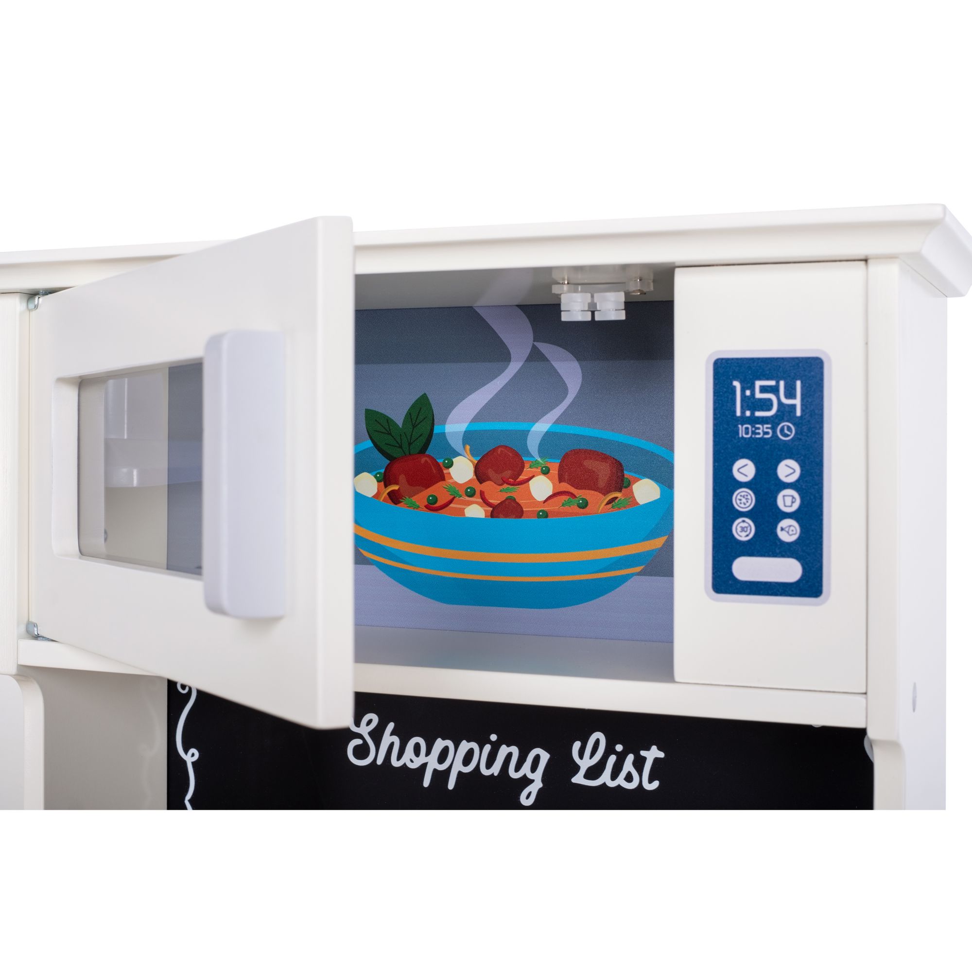 Includes two light and sound burners, taps and faucet, sink, oven, fridge, dishwasher, chalkboard, microwave, extractor, a dispensing play ice maker with two ice cubes and a cup, two coffee cups, two plates, frying pan, spatula, saucepan with lid, and spoon