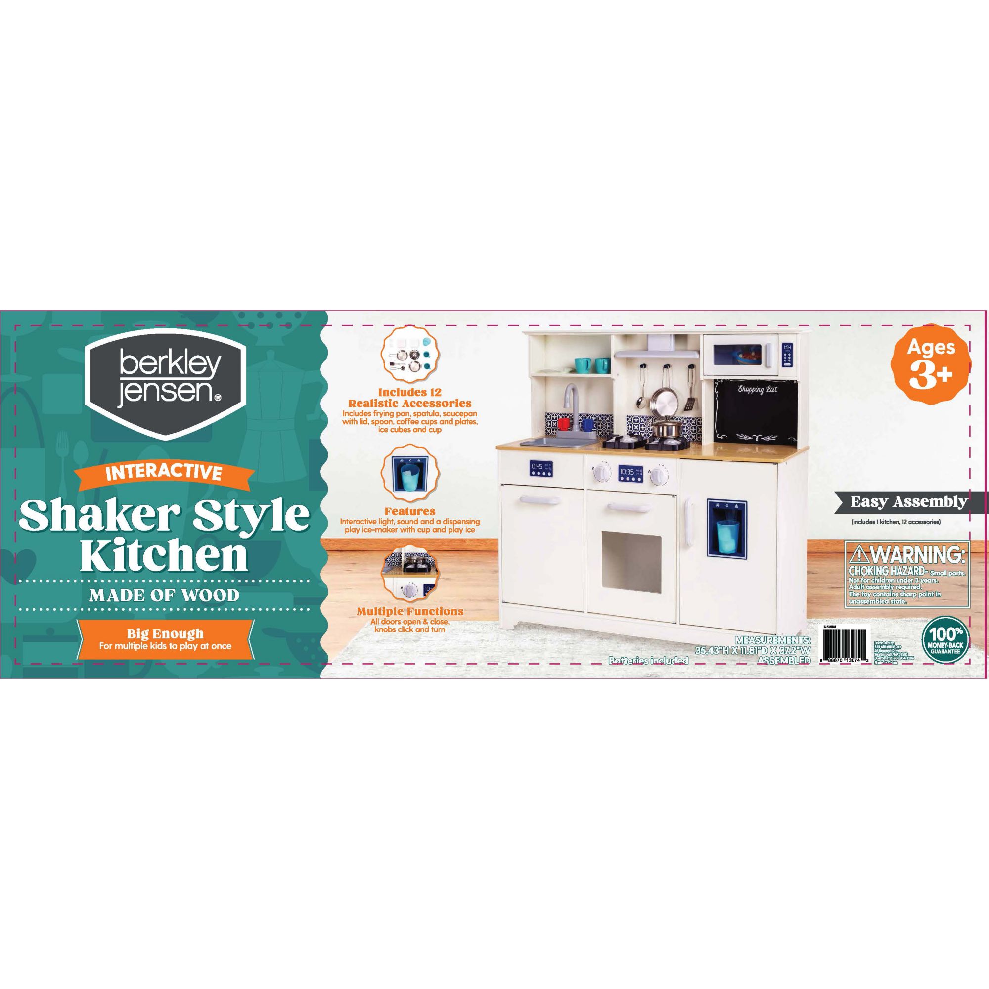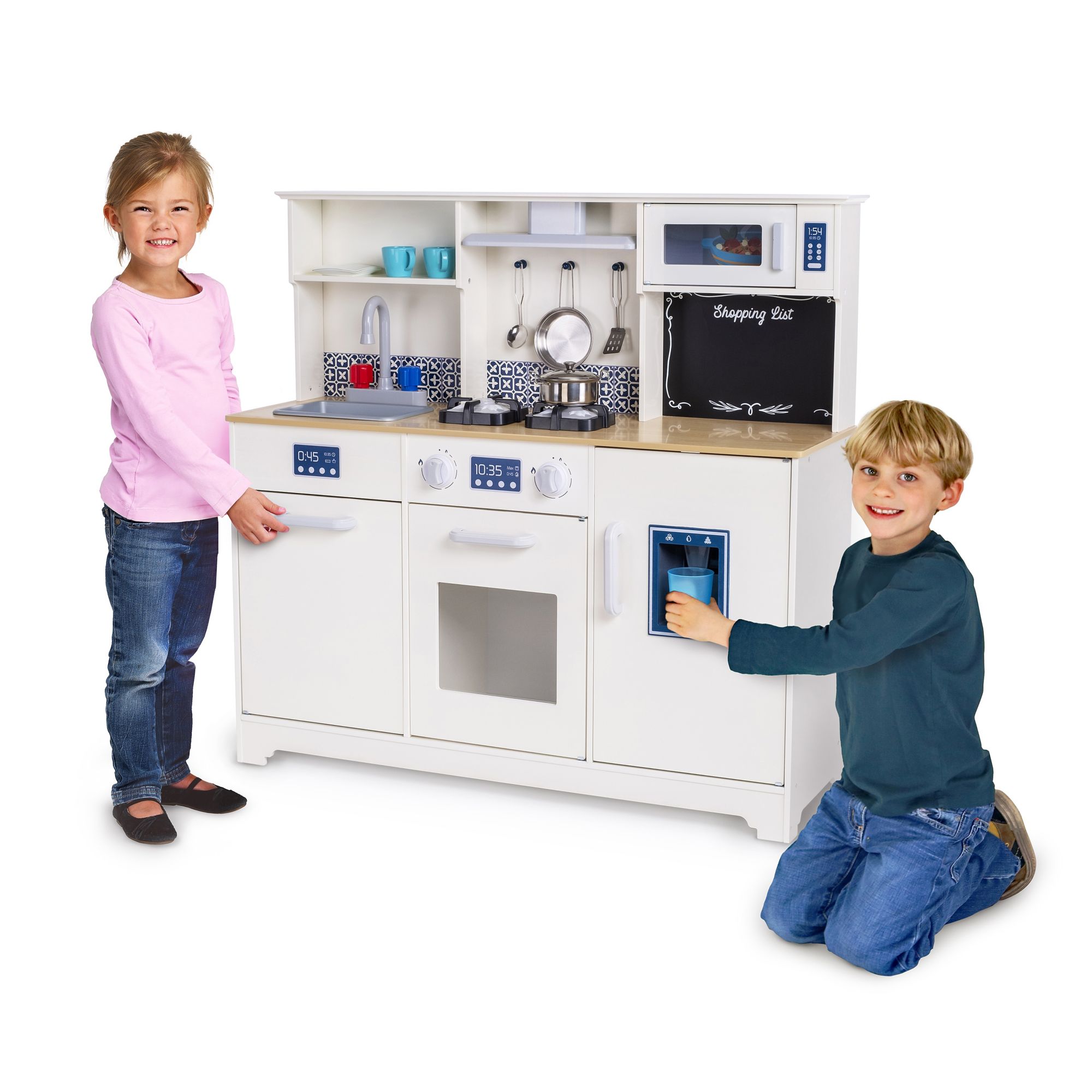 Cook up some fun with this beautiful wooden kitchen set that comes packed with accessories and light and sound features. With its huge size and elegant design, this stylish kitchen offers incredible value for your money coming complete with five realistic stainless steel accessories: frying pan, spatula, saucepan with lid, and spoon. The kitchen set includes two coffee cups, two plates, taps and faucet, two lights, and two light and sound burners. Other features include a refrigerator, dispensing play ice-maker with cup, play ice, an oven with a window, a cupboard, a microwave, a control panel with two turning and clicking dials, a sink, a storage shelf, and three hanging hooks for the pots and pans. With its durable design and sturdy construction, this wonderful kitchen will inspire creativity, imagination, sharing, and active play. Perfect for boys and girls ages 3 – 8 years.