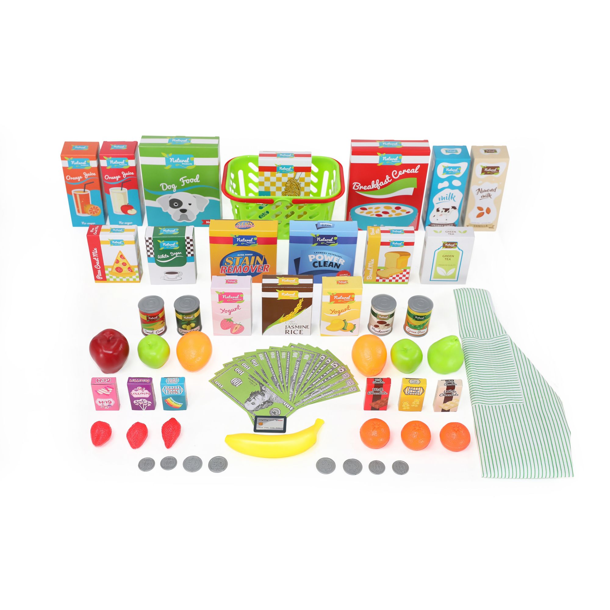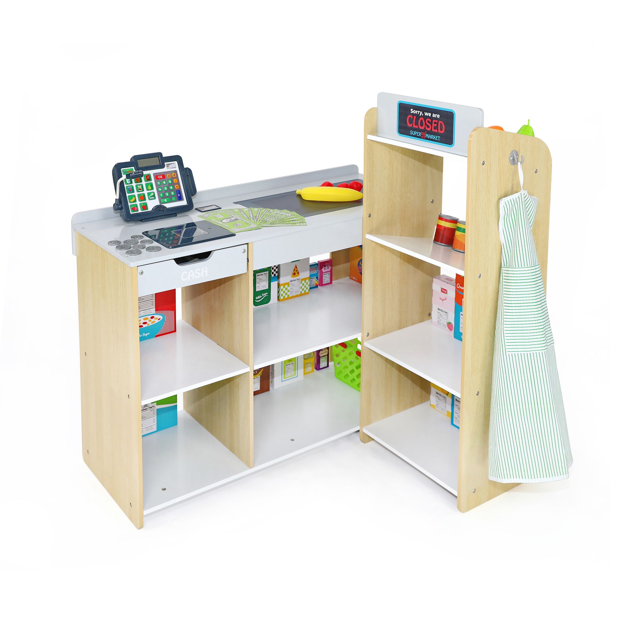 22 cardboard food boxes, 4 cans, 13 fruit pieces, a store card, full set of play money and coins, an apron and a chalk board