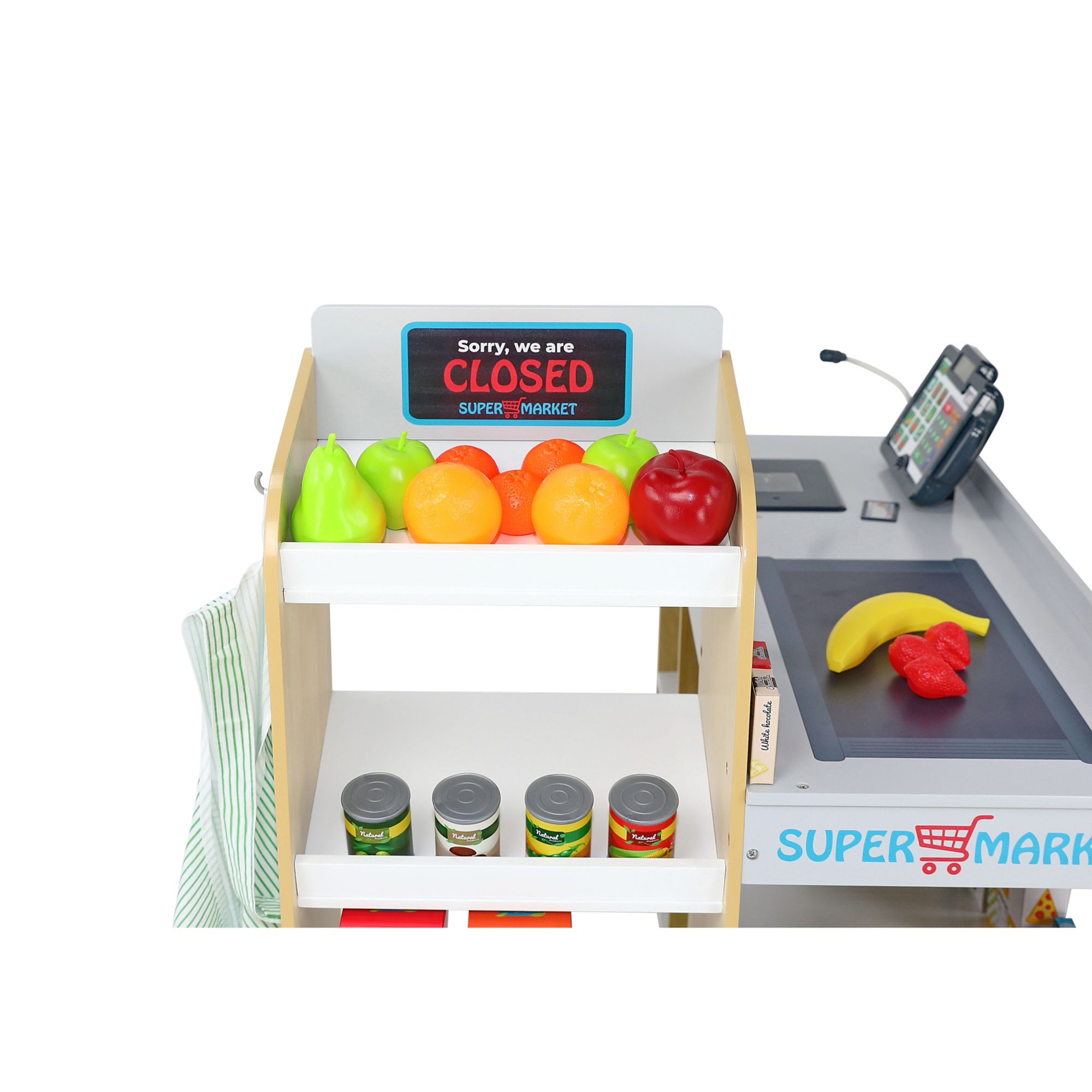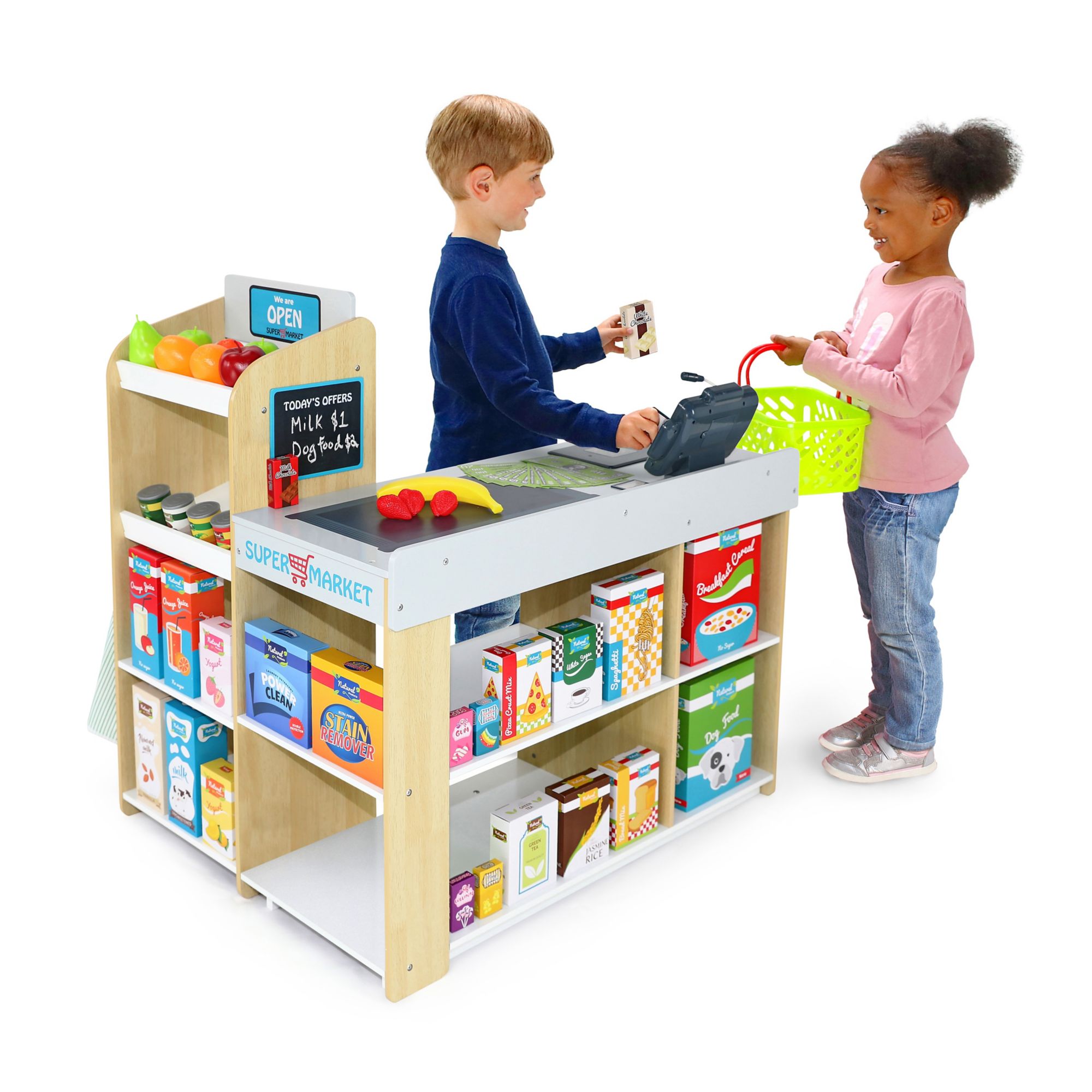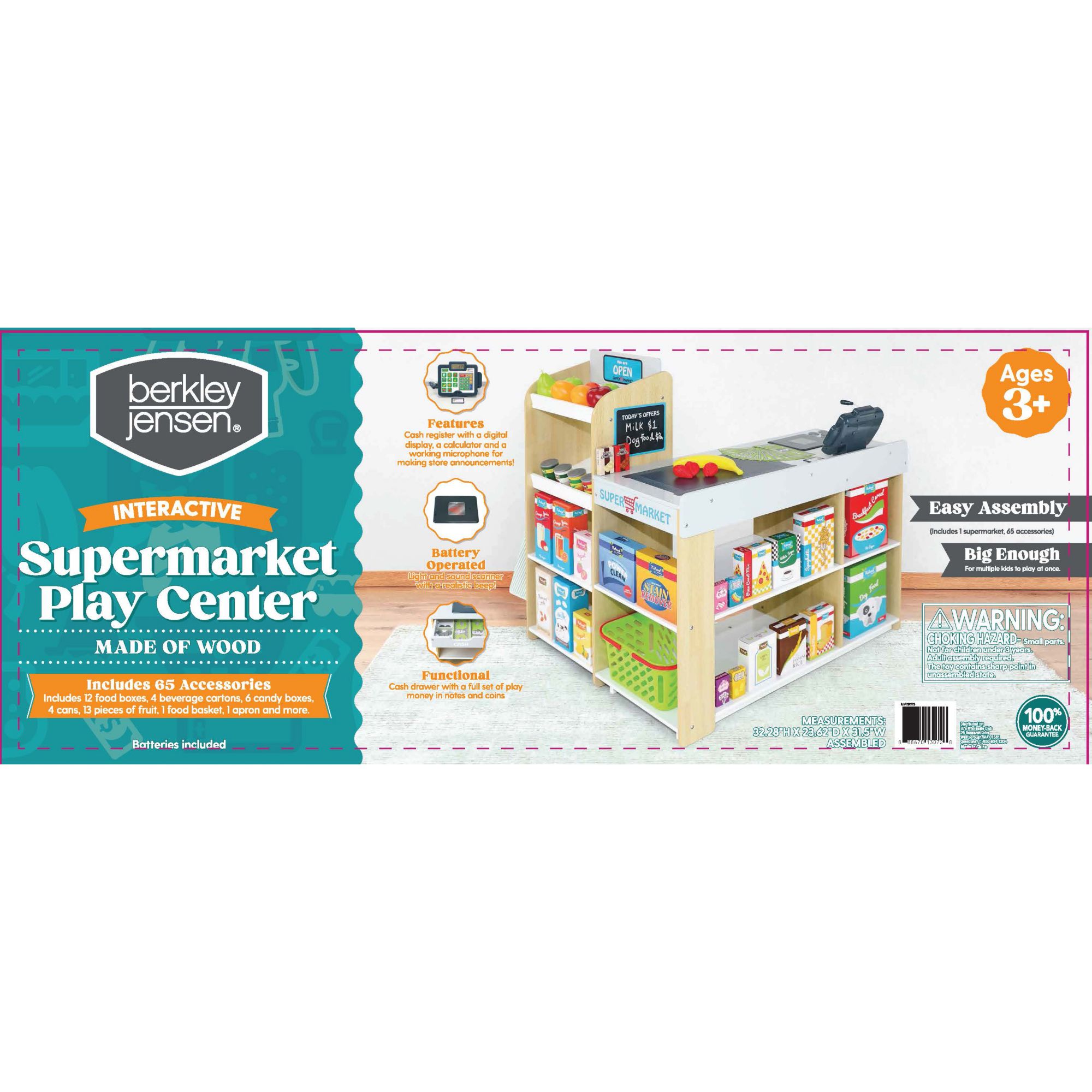 The Berkley Jensen wooden supermarket play center is comprised of 65 fully detailed accessories and realistic battery-operated features. The set includes a cash register with a digital display, a calculator, and a working microphone for making store announcements. The set also includes a light and sound scanner with a realistic beep. Boys and girls can enjoy hours of shopping and role-play fun. Built to last from high-quality materials. Item also includes a cash drawer with plenty of play money in both notes and coins, 12 food boxes, four beverage cartons, six candy boxes, four cans, 13 pieces of fruit, and an Apron. Perfect for both boys and girls this item inspires imagination and active play and helps encourage friendship and sharing. This item is sure to be a family favorite for years to come.