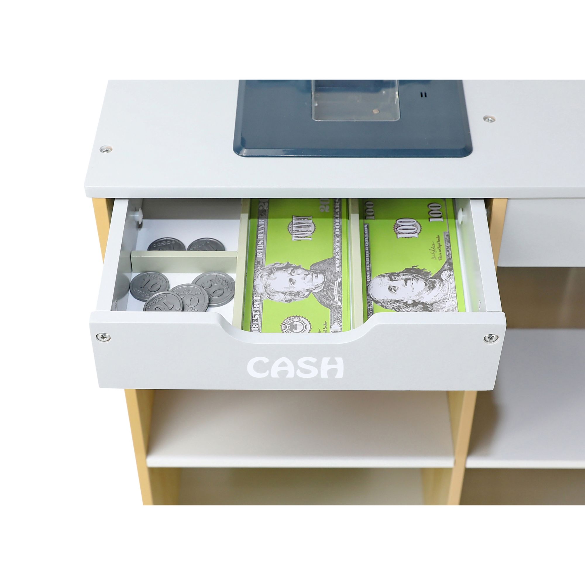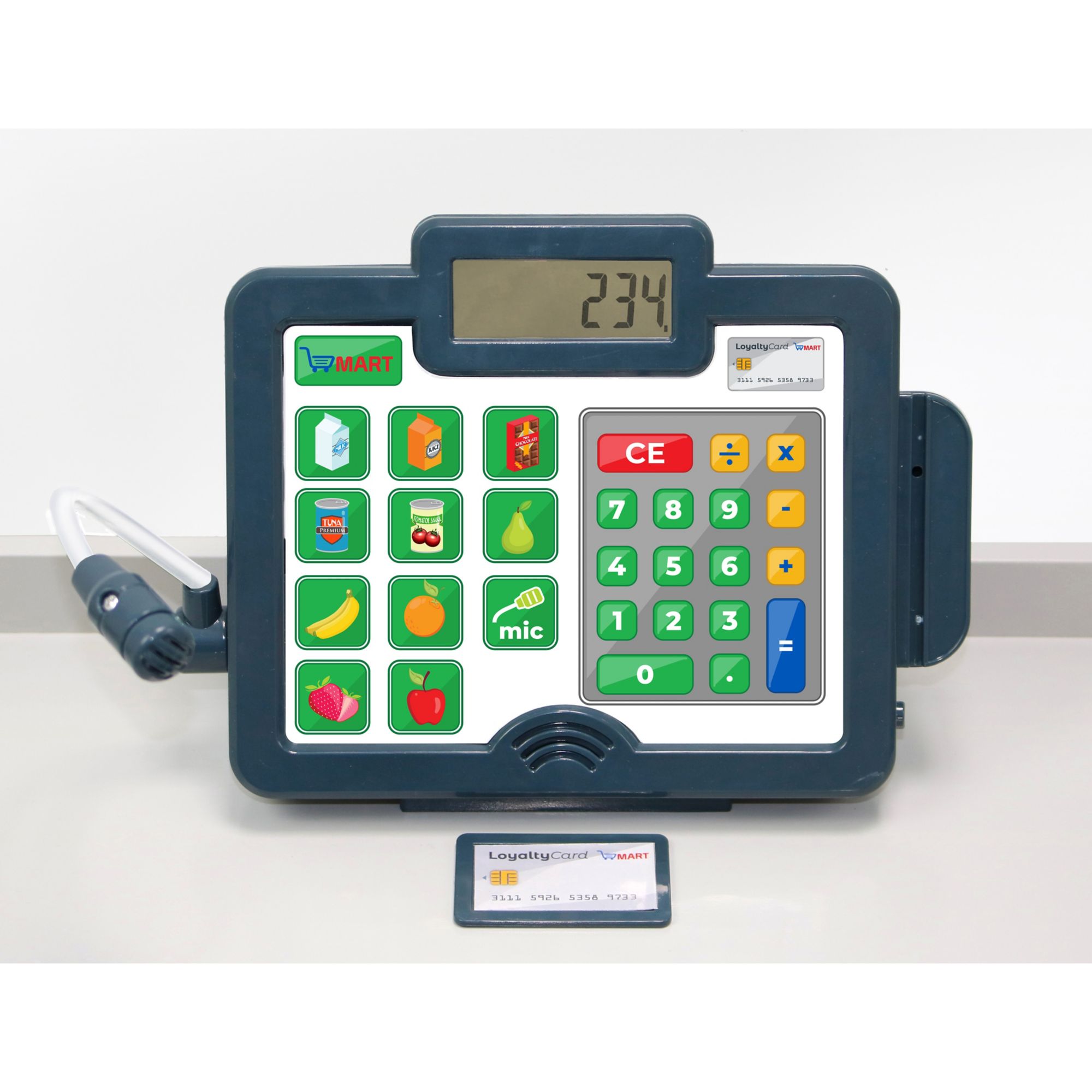 Realistic supermarket with electronic cash register, calculator and working microphone