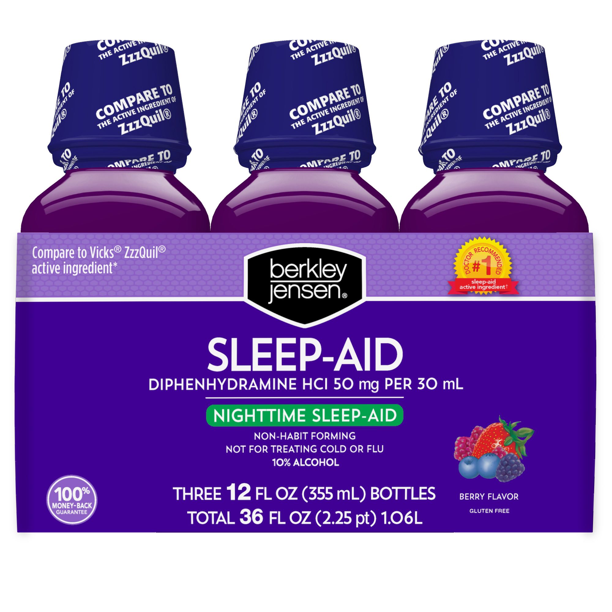 The active ingredient in Night Time Sleep-Aid Liquid, berry flavor, is diphenhydramine HCl 50 mg per 30 mL, the #1 doctor recommended sleep-aid active ingredient. Non-habit forming, night time sleep-aid liquid relieves occasional sleeplessness. This product is gluten free and made with 10% alcohol. Not for treating cold or flu.