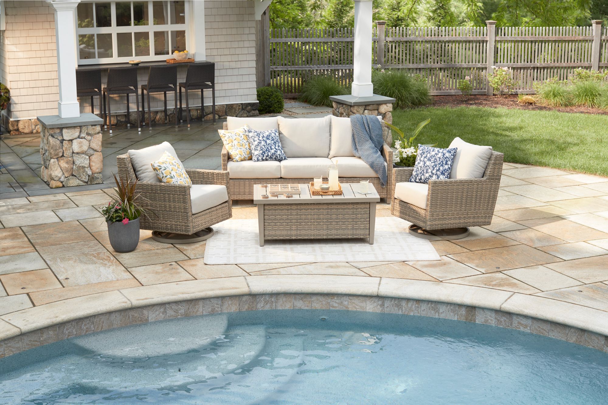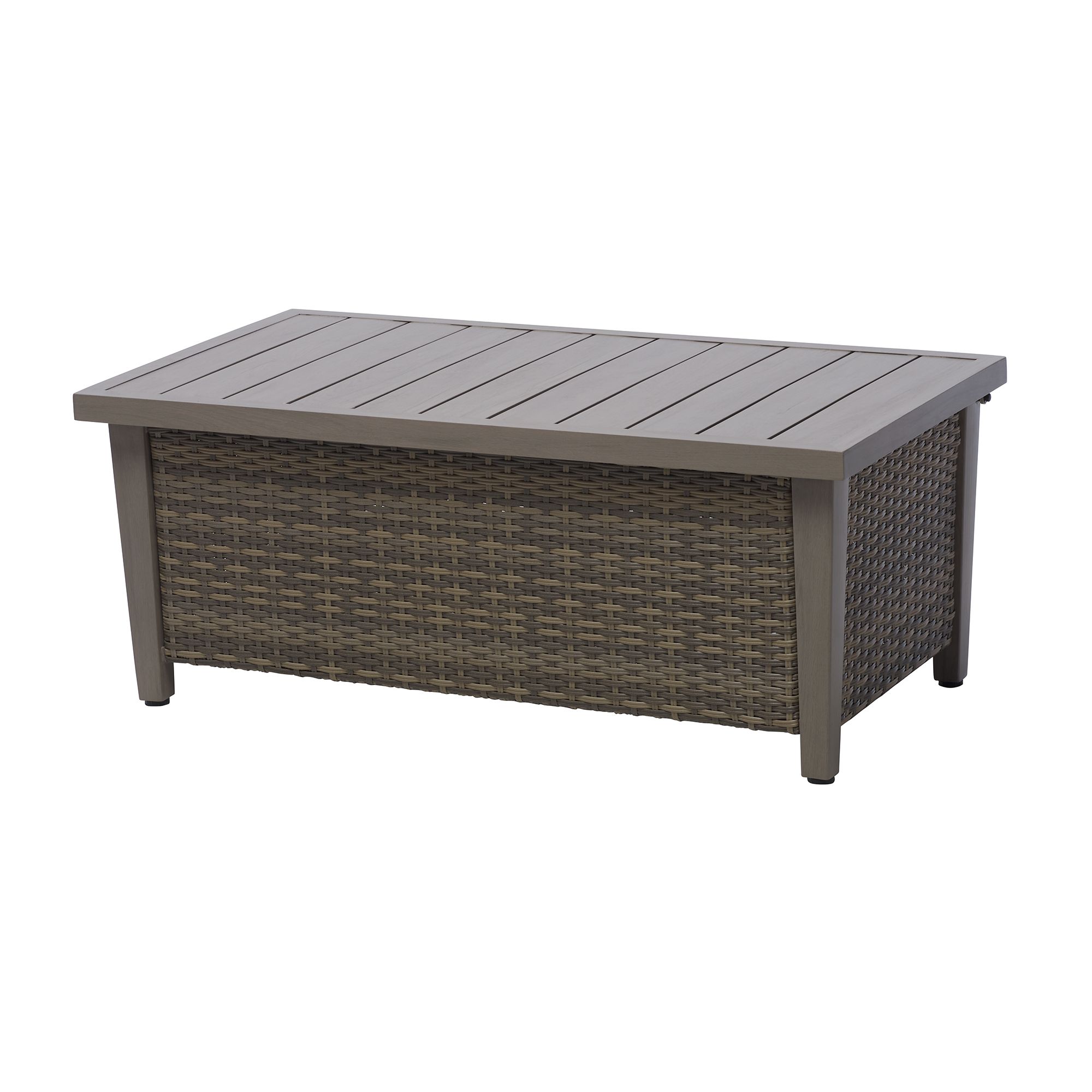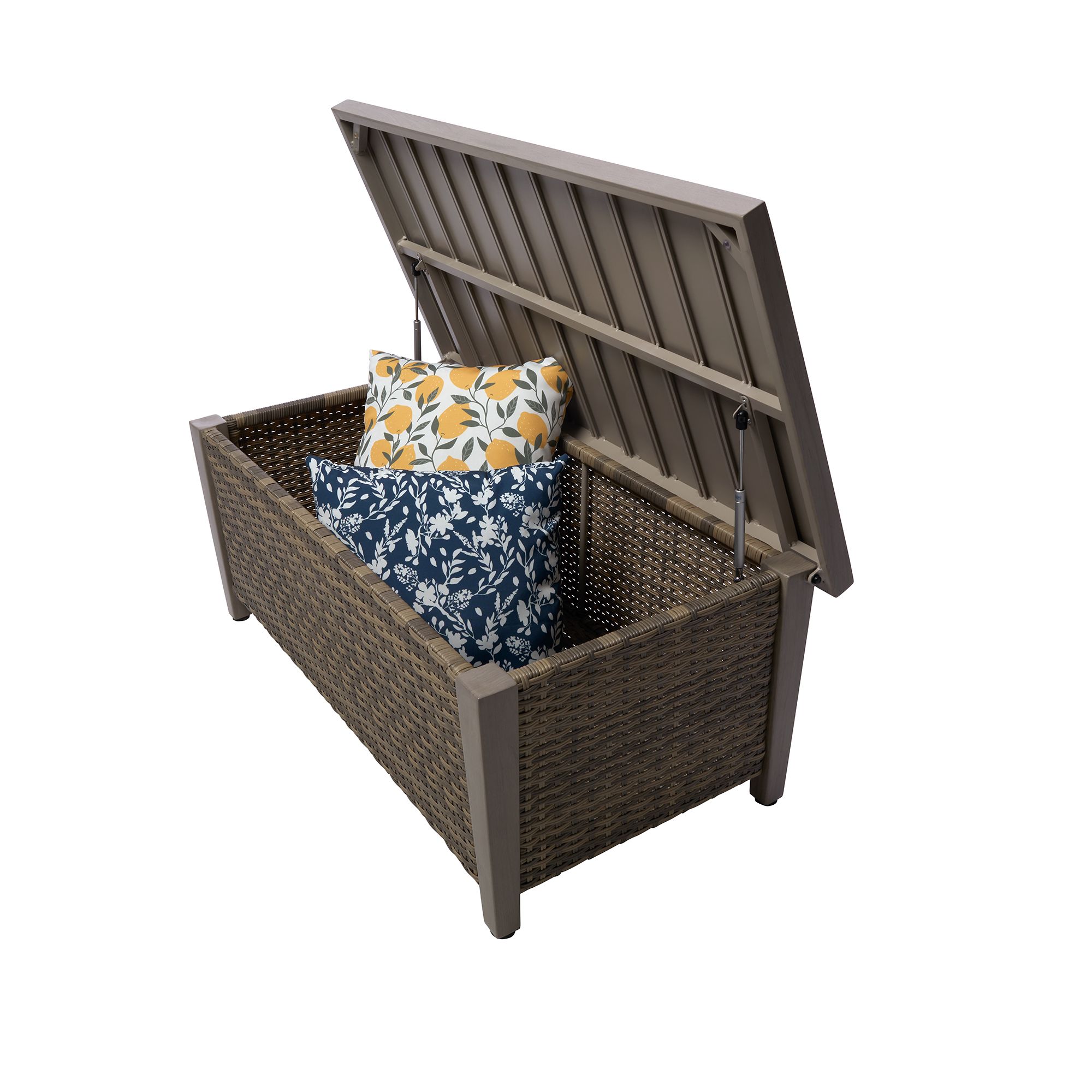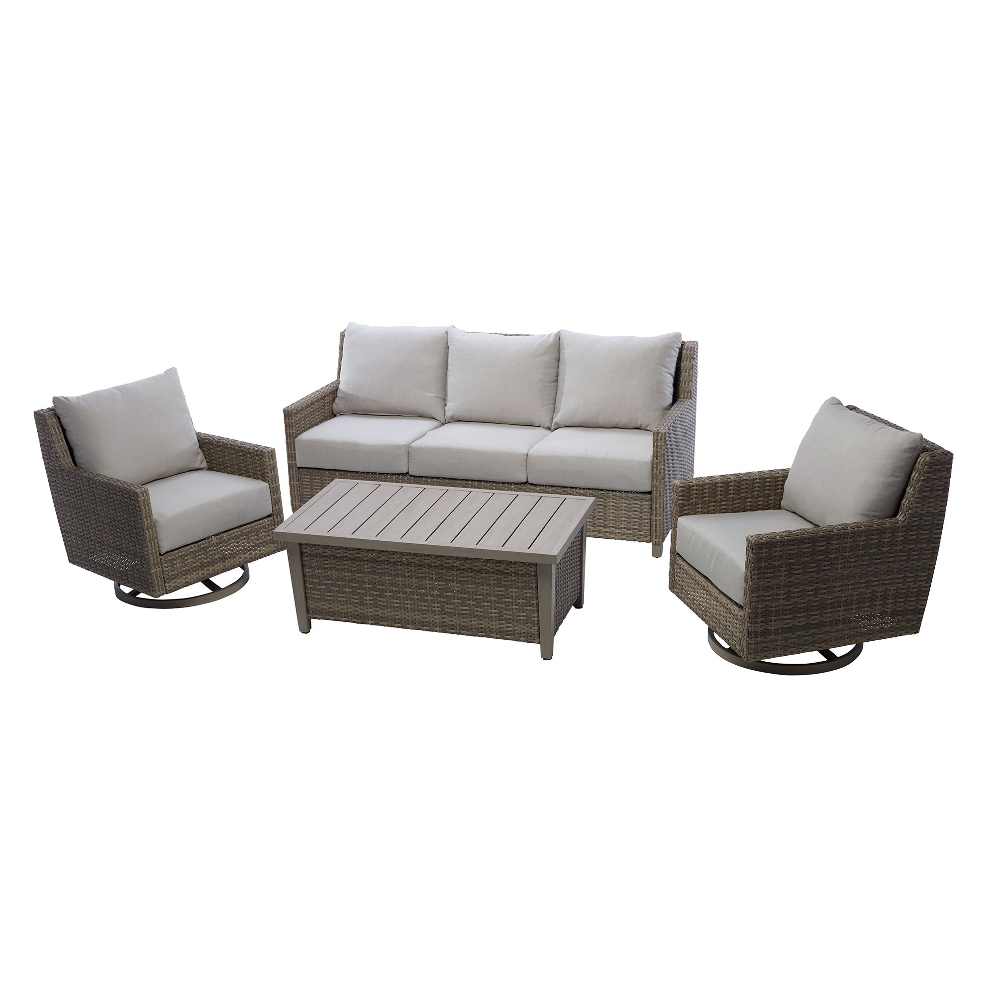 The Berkley Jensen Bristol four-piece all-weather hand-woven wicker conversation set has all-aluminum non-rust frames with two motion club chairs, a sofa, and a slat top table. The acrylic cushion fabric is UV-protected and perfect for outdoor use. The slat-top coffee table lifts open for storage. Protective furniture cover is included.