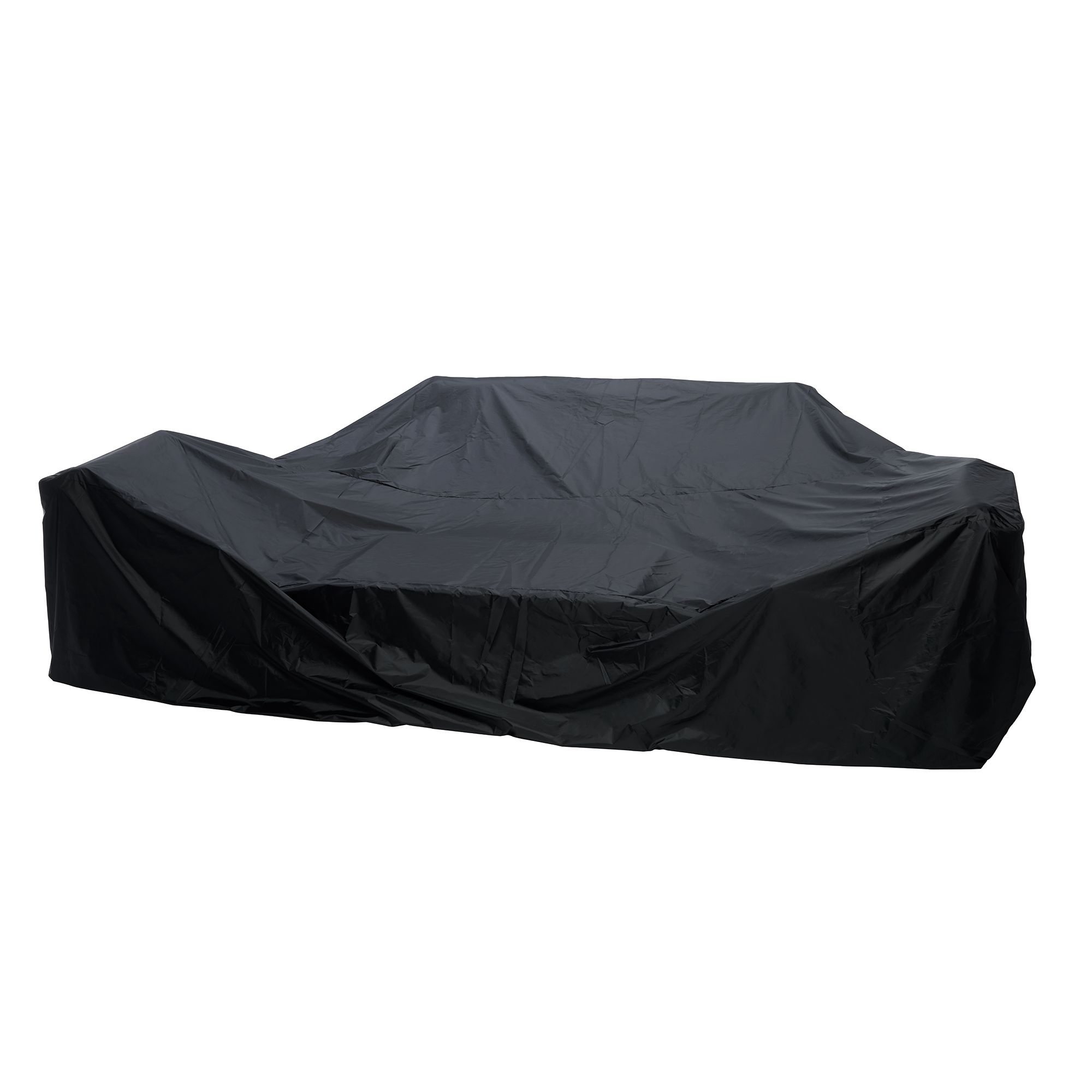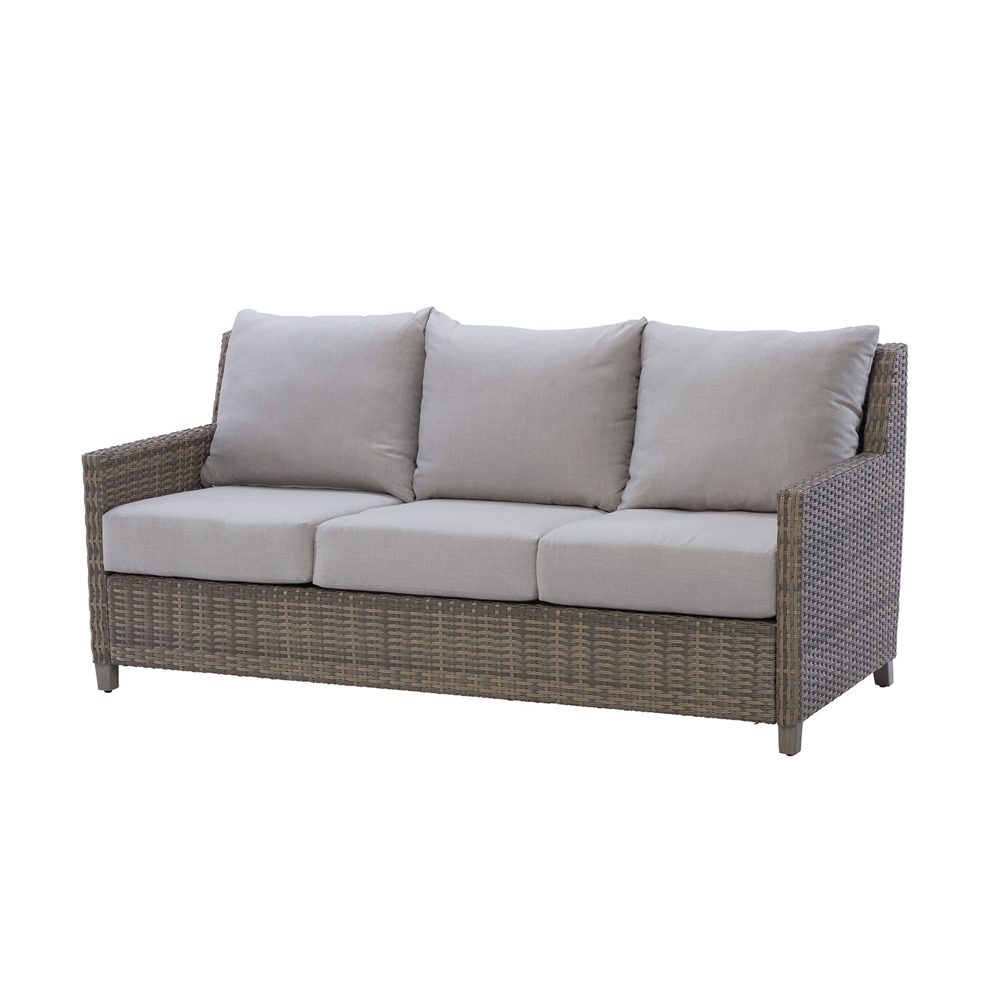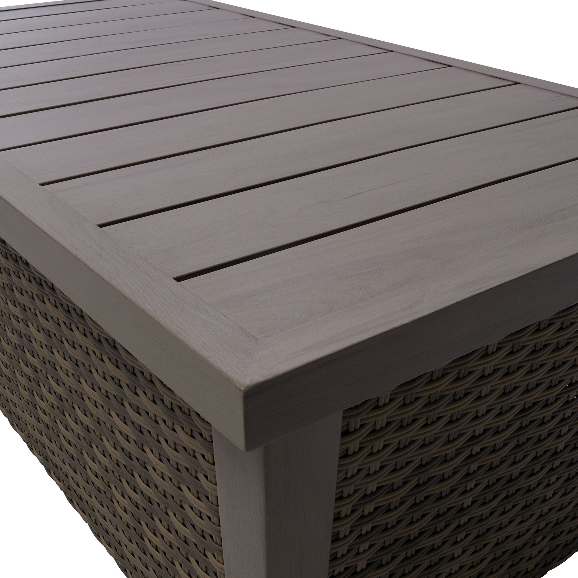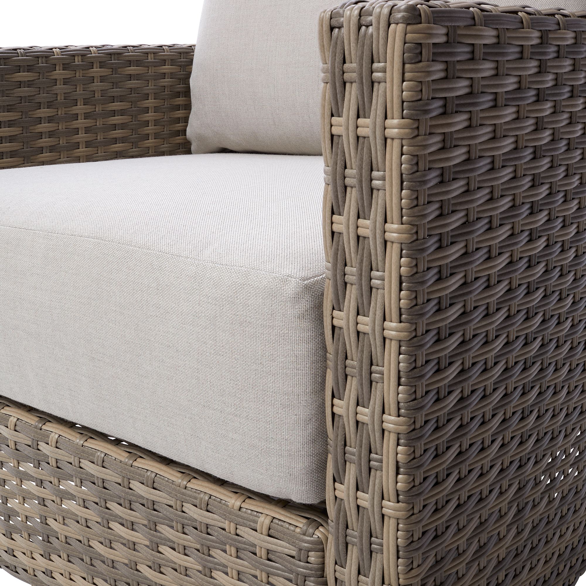 The Berkley Jensen Bristol four-piece all-weather hand-woven wicker conversation set has all-aluminum non-rust frames with two motion club chairs, a sofa, and a slat top table. The acrylic cushion fabric is UV-protected and perfect for outdoor use. The slat-top coffee table lifts open for storage. Protective furniture cover is included.