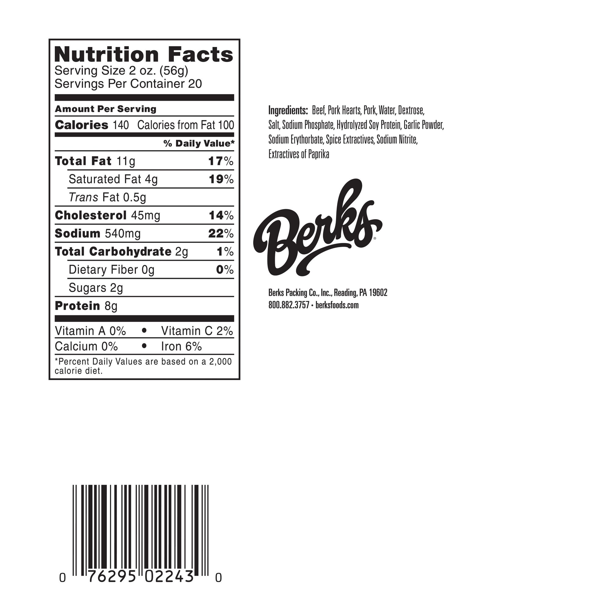 Berks garlic ring bologna is made from a proprietary blend of seasonings and lean cuts of 100% domestic fresh beef and pork. The same old-world recipe Berk's has been using for 85 years for a delicious flavor. Plain variety is available in whole piece. Great for lunch, snacks, or tasty hors d’oeuvres.