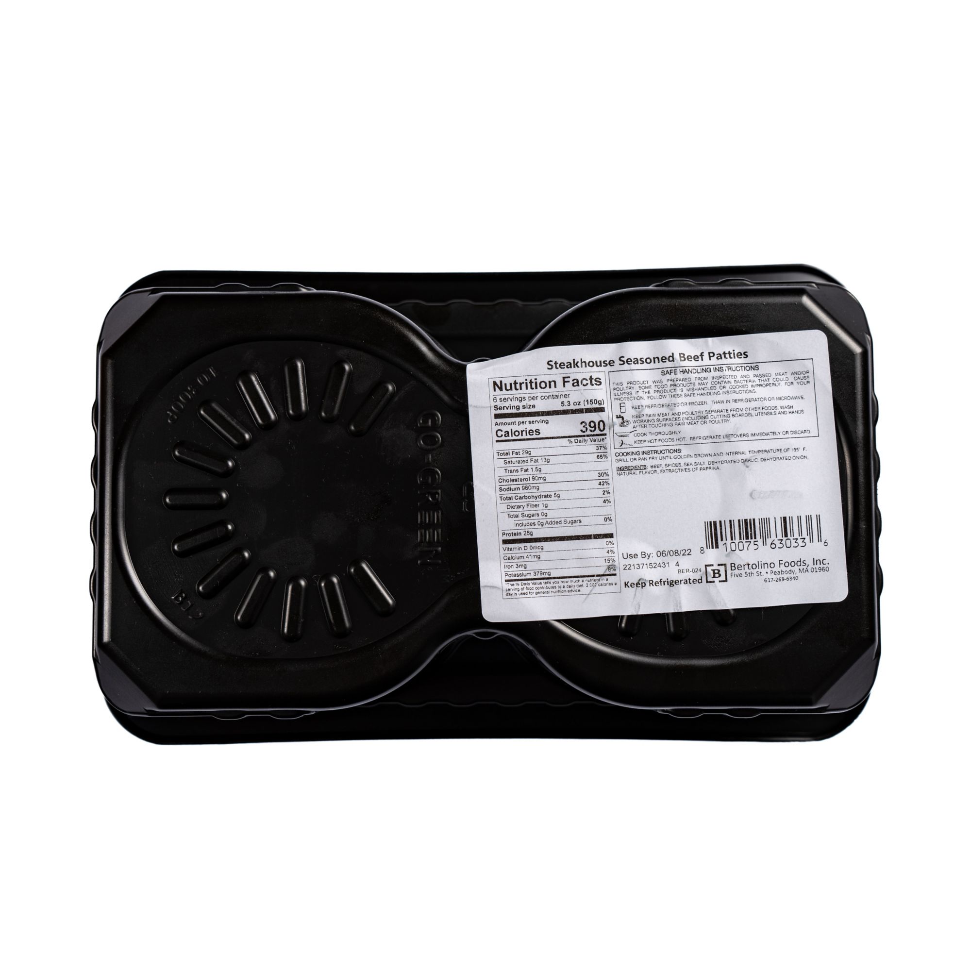 Bertolino Foods Steakhouse Seasoned Beef Patties are perfectly seasoned with steakhouse style spices. Pop these beef patties directly on the grill and serve, no extra seasoning needed. Bertolino Foods does not use any binders or fillers, so you are getting only premium ingredients. Try them today!