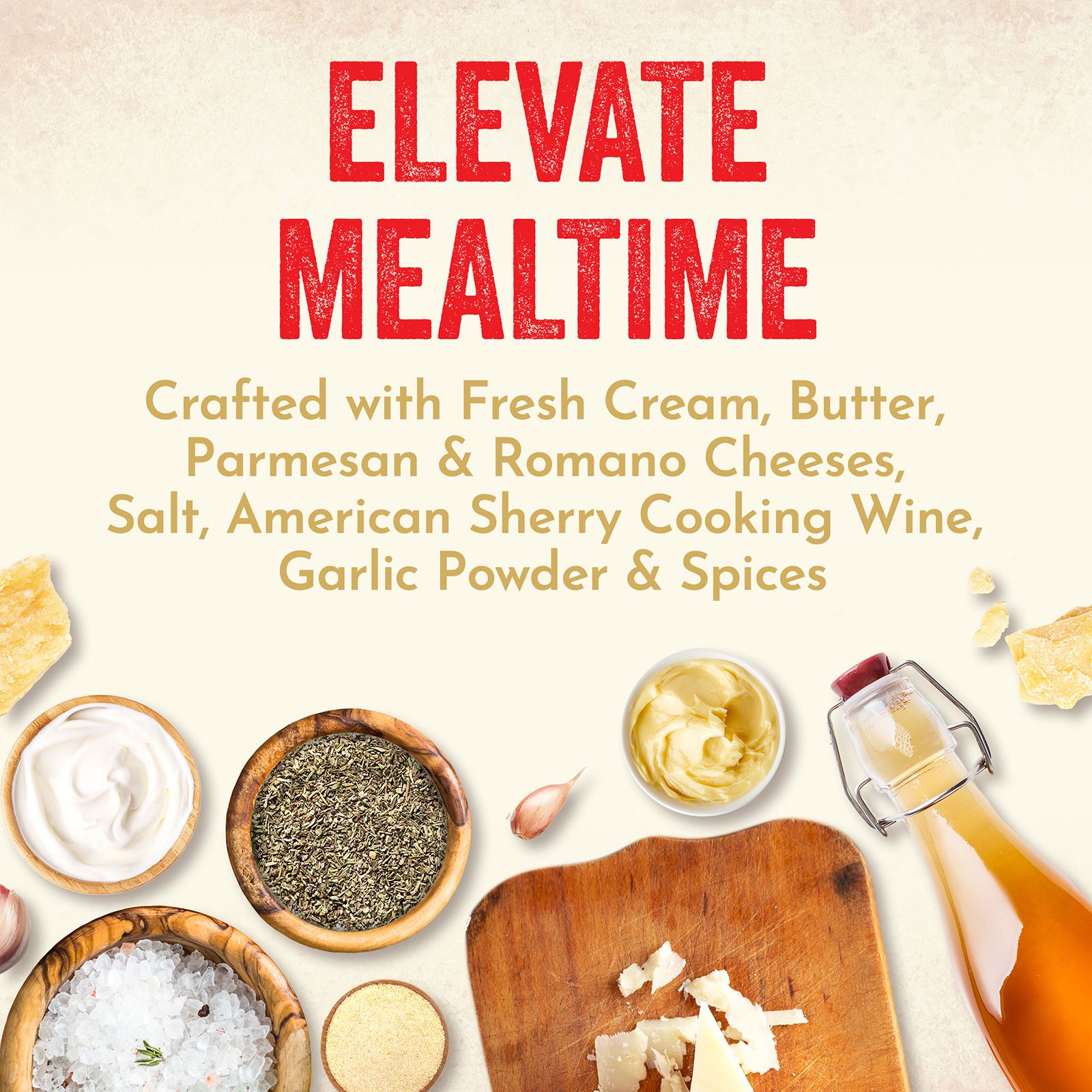 Ingredients: Water, Heavy Cream, Butter (Sweet Cream, Salt), Parmesan Cheese (Pasteurized Part-Skim Milk, Cheese Cultures, Salt, Enzymes), Soybean Oil, Modified Corn Starch, Enzyme Modified Egg Yolk (Egg Yolk, Salt, Enzyme), Romano Cheese Made From Cow’S Milk (Pasteurized Part-Skim Milk, Cheese Cultures, Salt, Enzymes), Salt, American Sherry Cooking Wine (Wine, Grape Alcohol, Salt, Potassium Metabisulfite [Preservative]).