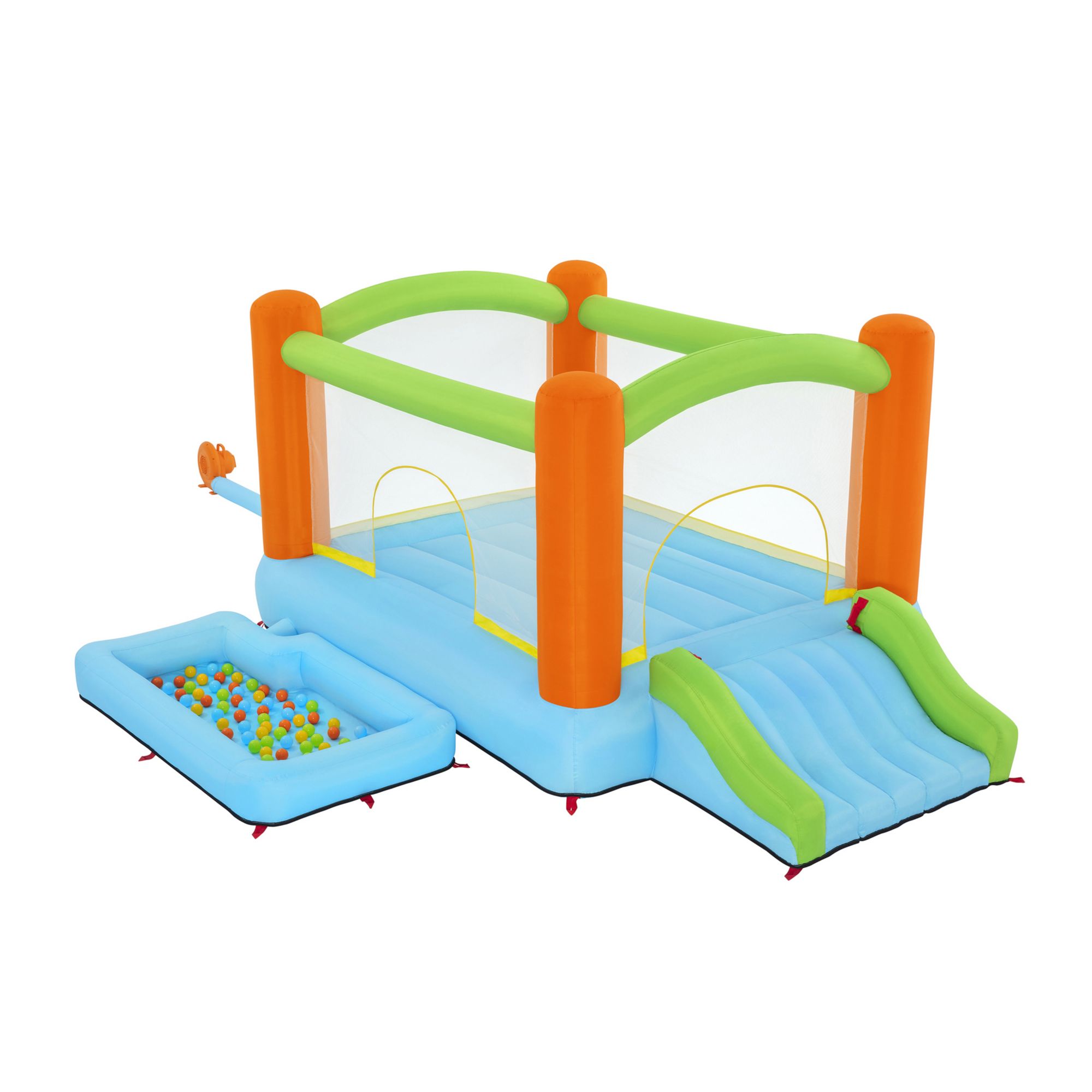 Includes bouncer, blower, repair kit, storage bag, 16 bouncer stakes, two blower stakes and 75 play balls