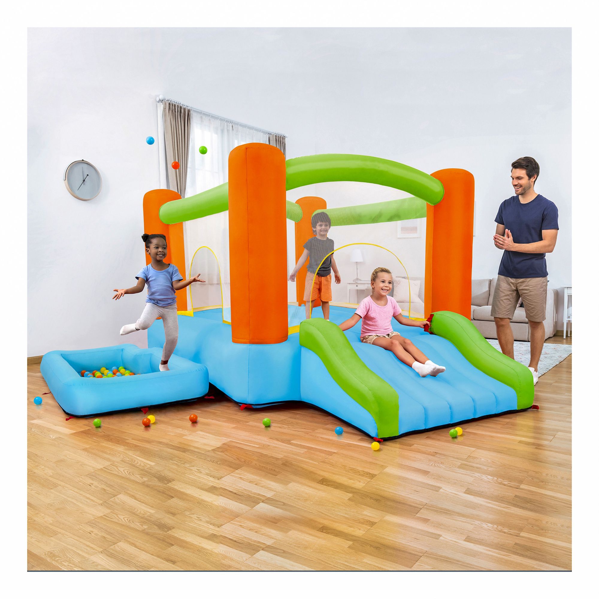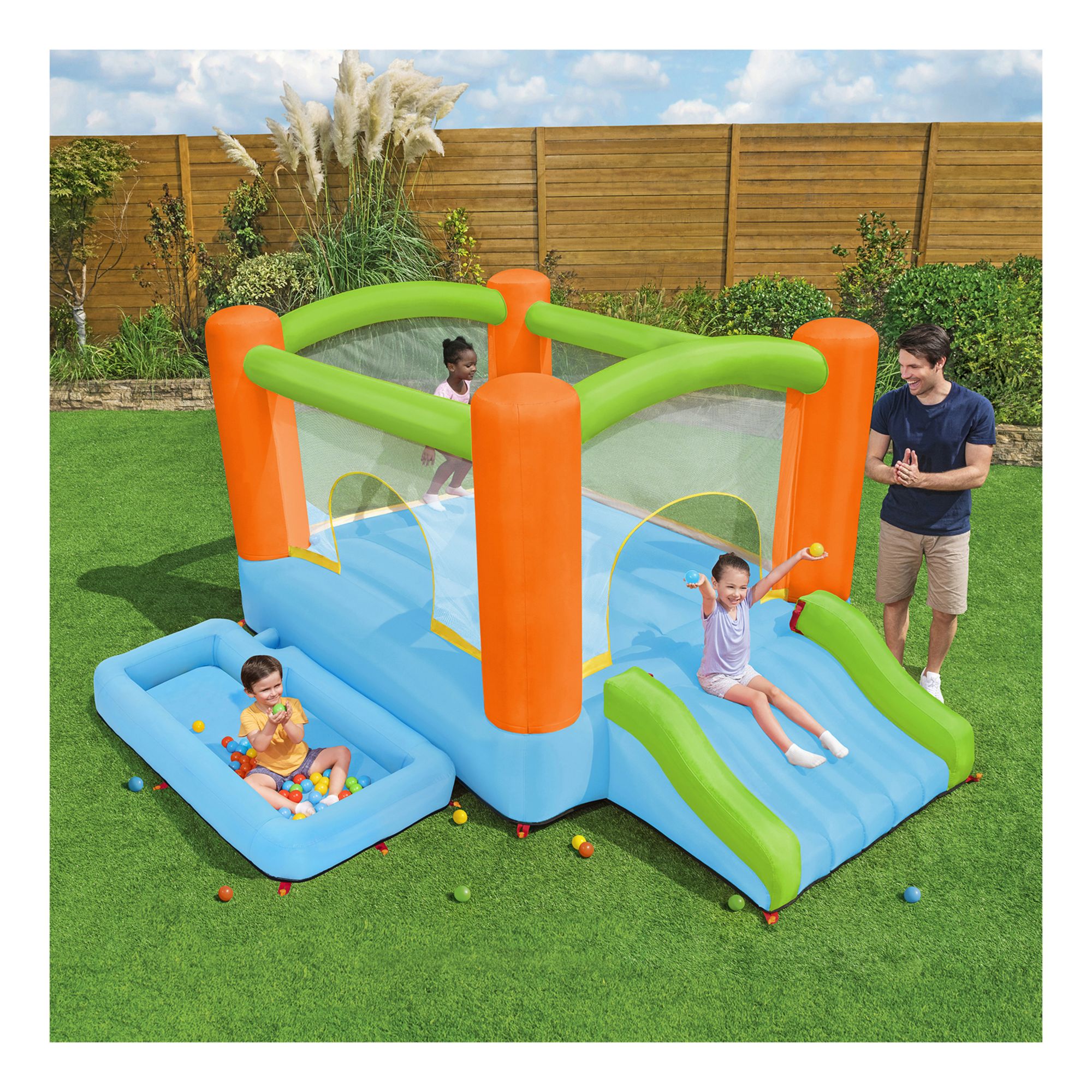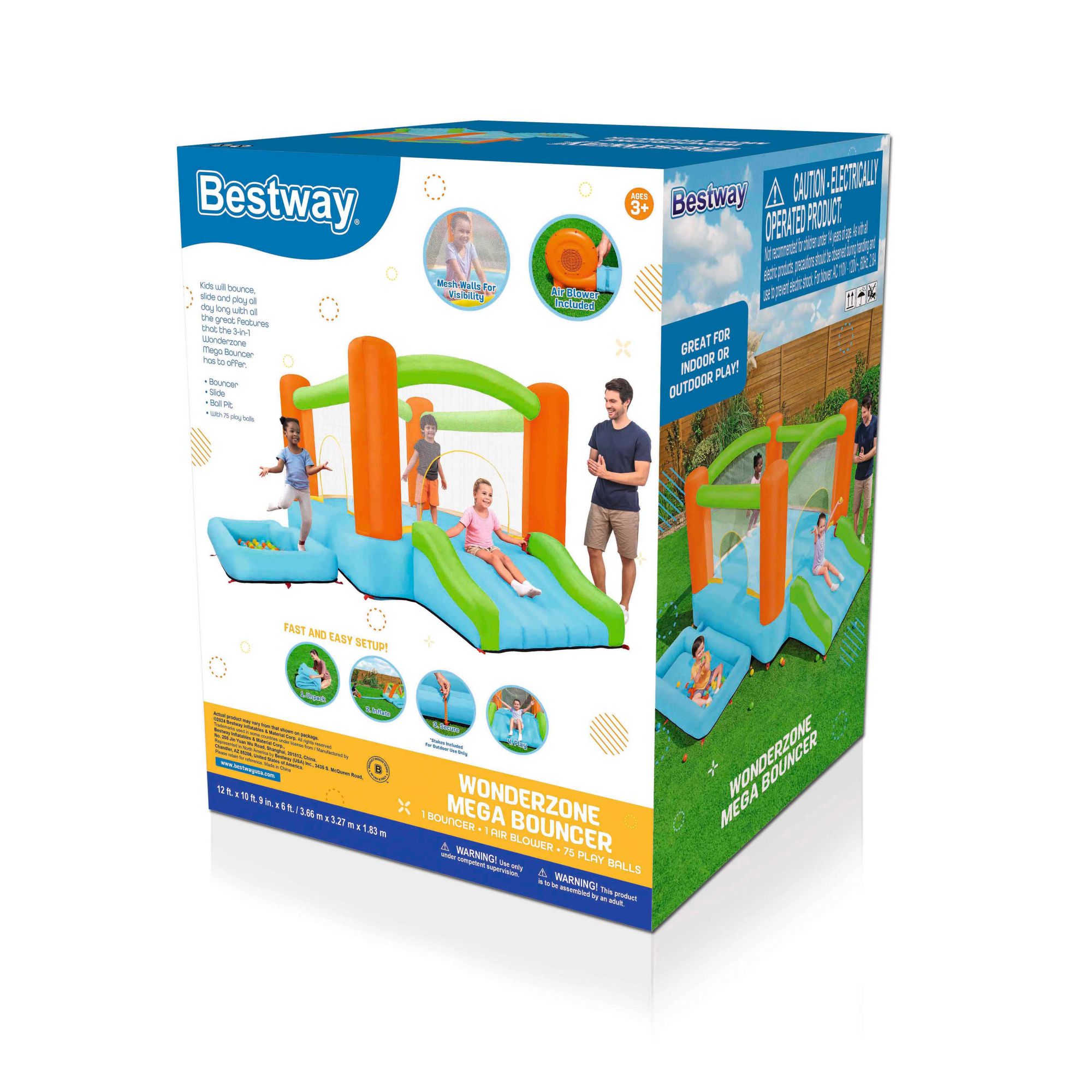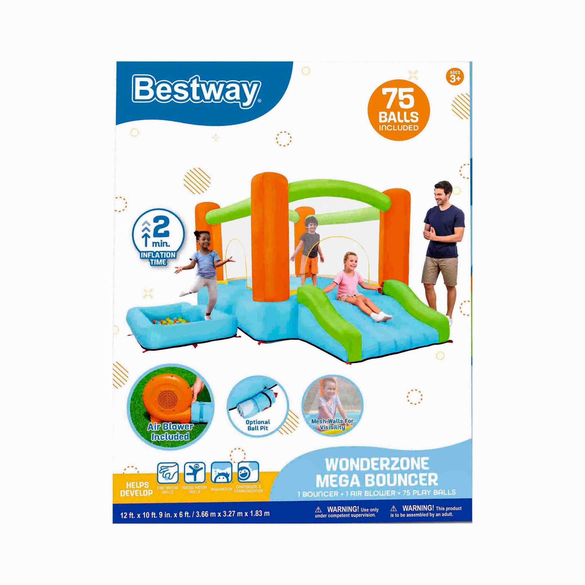 The Bestway Wonderzone Mega Bouncer is this summer's next craze. Parents will love the quick inflation and security features - the included blower inflates the park in less than 2 minutes, and the bounce house is also surrounded by a mesh wall for visibility at all times. Kids will love having a bounce park in their own backyard to play with their friends all day long. They'll have a blast jumping in the large bouncing space, gliding down the extra-wide slide or playing in the attached ball pit. With 75 play balls included, there's no shortage of fun with the Wonderzone Mega Bouncer.
