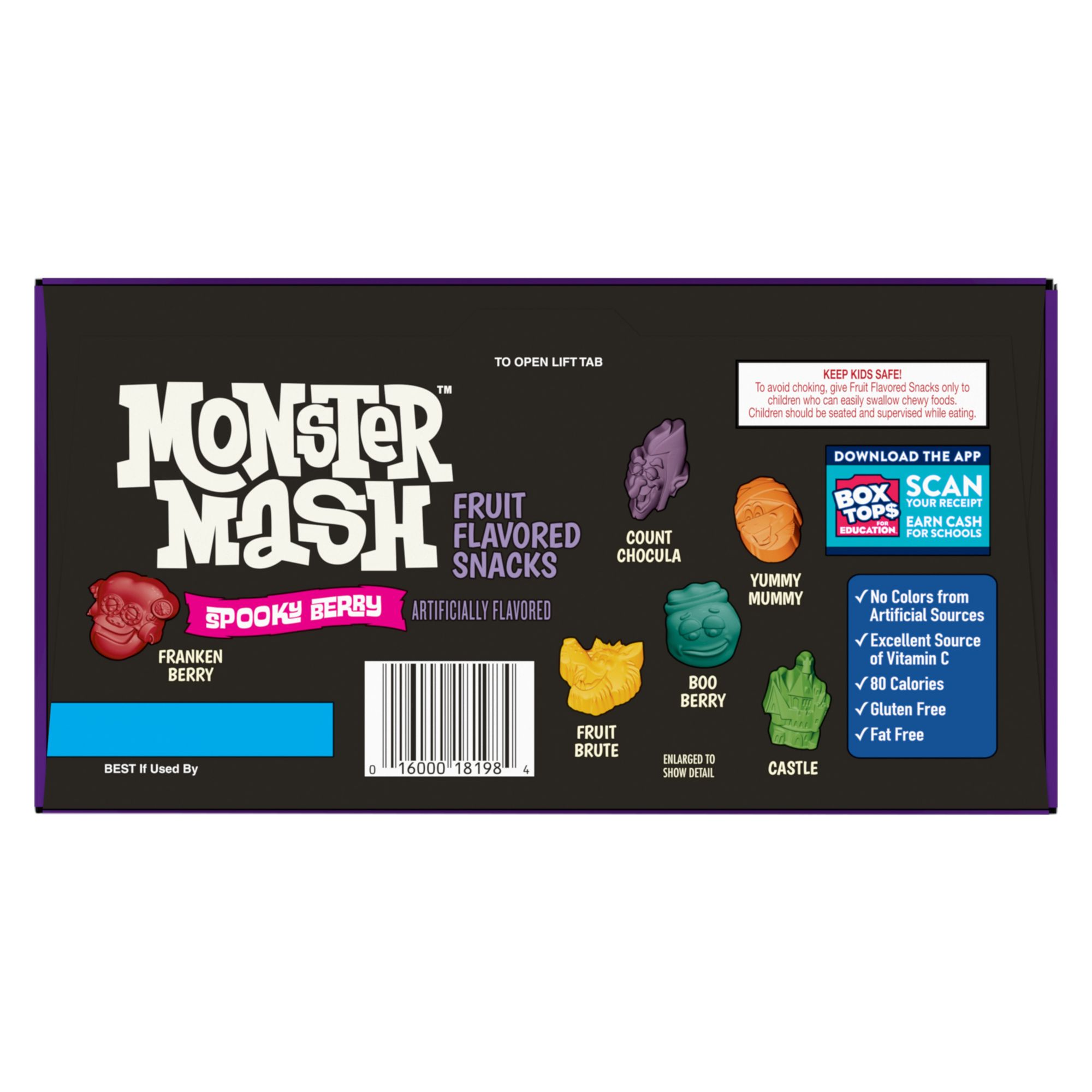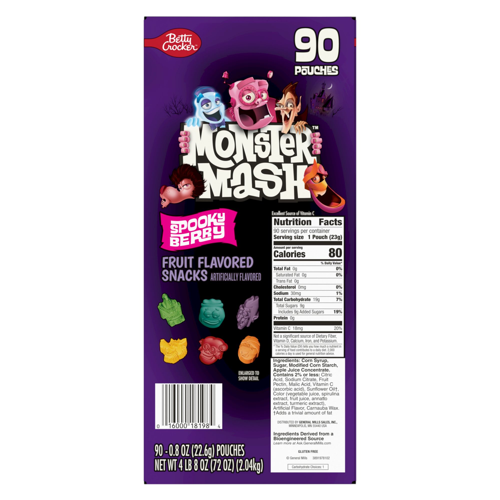Betty Crocker Monster Fruit Snacks are a Halloween favorite. This package contains 90 Fruit pouches with Spooky Berry shapes for endless fun. There are six fun Shapes: Castle, Boo Berry, Count Chocula, Franken Berry, Yummy Mummy, and Fruit Brute. Betty Crocker has been bringing magic to kids through their favorite character-shaped fruit snacks for 20+ years. Kids of all ages will love these naturally flavored, gluten-free gummy treats. Feel good about snacking, with no artificial flavors or colors, just 80 calories, and fat-free. They're also an excellent source of vitamin C. Betty Crocker Monster Fruit Snacks is proud to support schools and teachers as an official participating product.