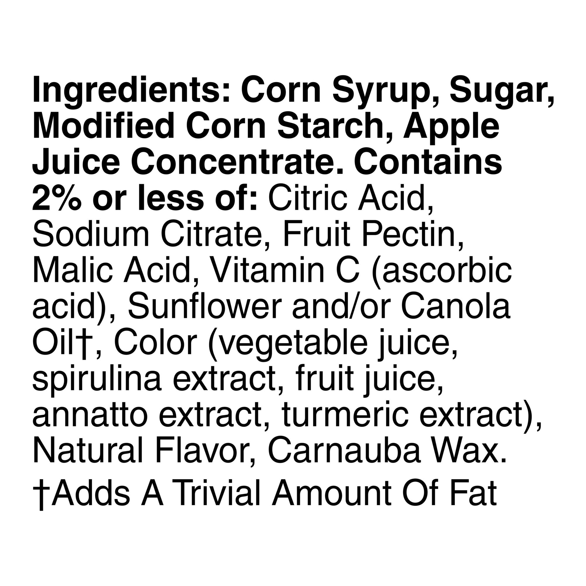 Ingredients: Corn Syrup, Sugar, Modified Corn Starch, Apple Juice Concentrate. Contains 2% Or Less Of: Citric Acid, Pectin, Sodium Citrate, Malic Acid, Vitamin C (Ascorbic Acid), Sunflower Oil, Color (Vegetable Juice, Spirulina Extract, Fruit Juice, Annatto Extract, Turmeric Extract), Natural Flavor, Caranuba Wax.