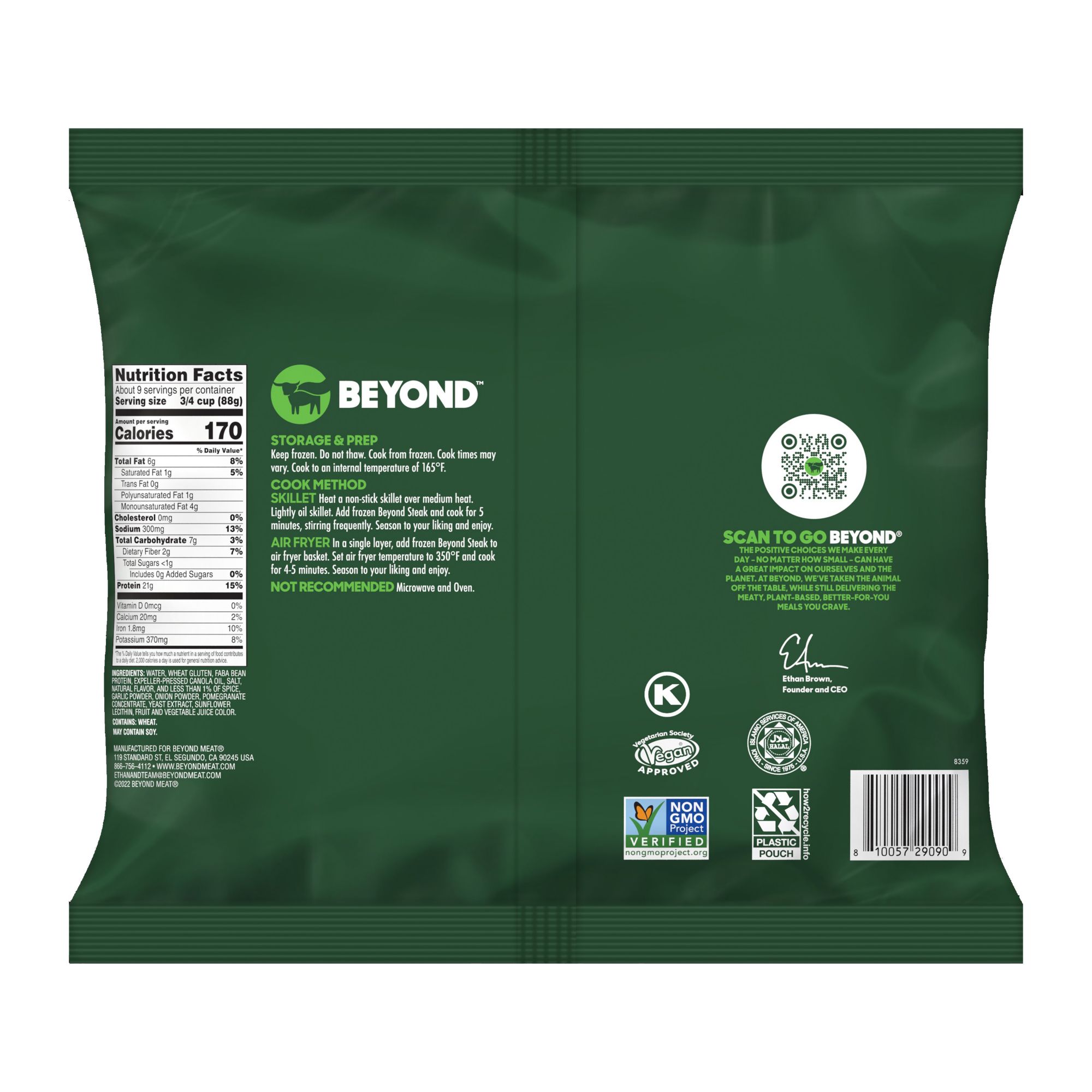 Beyond Steak is tender, juicy, and seared to perfection. Made from simple plant-based ingredients, like faba beans and wheat, these plant-based seared steak tips are a good source of protein with 21 grams of plant-based protein per serving. Stored frozen in a convenient resealable bag, Beyond Steak cooks in five minutes via skillet or air fryer and adds delicious flavor to your favorite dishes, from fajitas and quesadillas to stir fries, sandwiches and salads. Beyond Steak has no GMOs and no added soy, antibiotics or hormones. The positive choices we make every day - no matter how small - can have a great impact on ourselves and the planet. At Beyond, they've taken the animal off the table, while still delivering the meaty, plant-based, better-for-you meals you crave. We have a wide assortment of refrigerated and frozen plant-based meat such as burgers, ground beef, sausages, chicken and now steak.