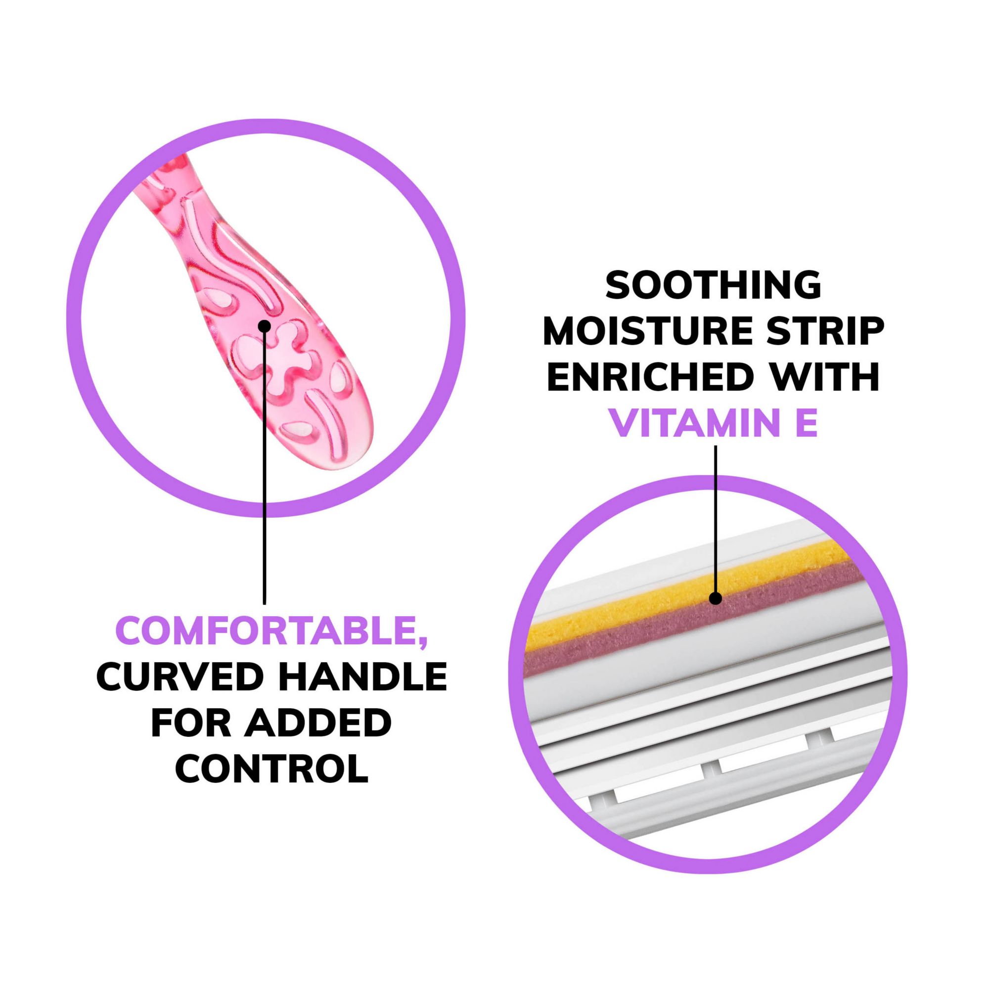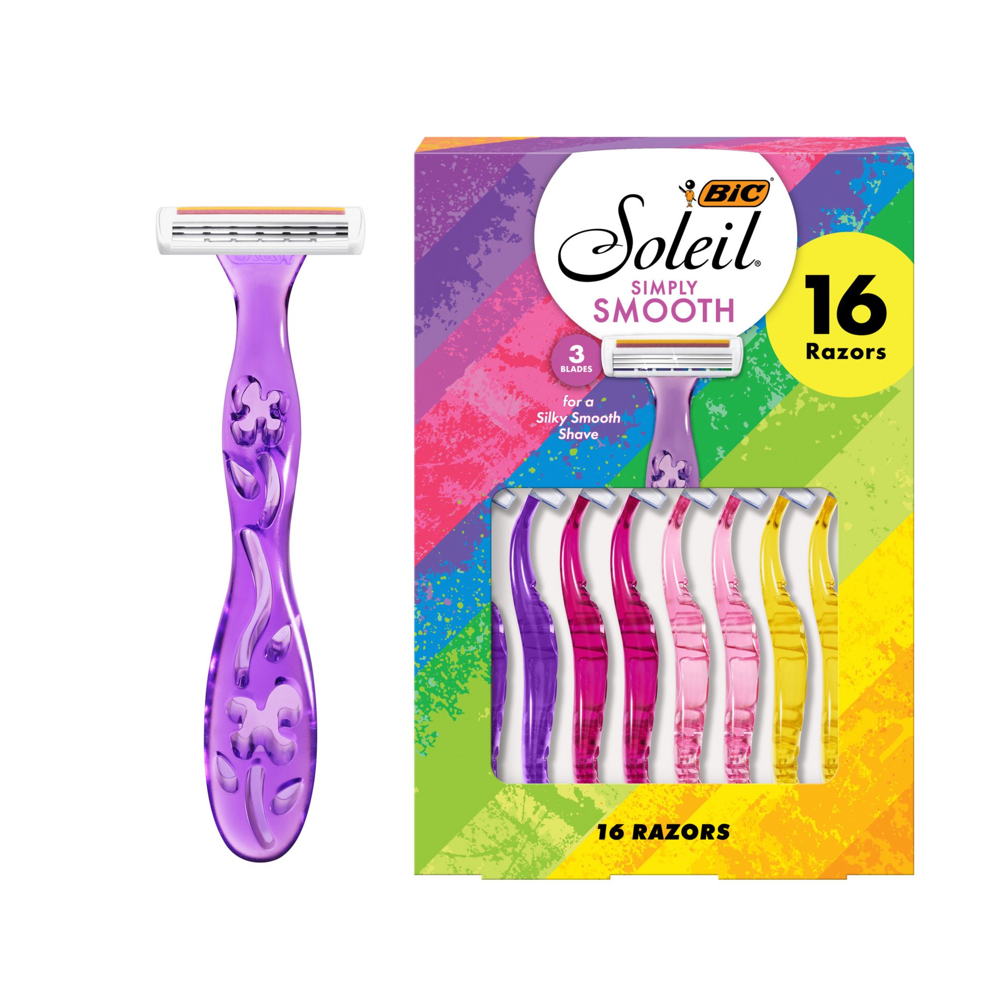 Achieve a flawlessly smooth shave with BIC Simply Soleil Women's Disposable Razors. These female disposable razors feature three blades that deliver a simply smoother shave (vs. BIC Silky Touch). The contoured handle helps you keep a good grip on the razor for added control. This bic razor for women features a Soothing Moisture Strip enriched with Vitamin E for enhanced glide and a close, comfortable shave. These disposable razors slip easily inside a gym bag or toiletry kit for quick, convenient touch-ups. Each bundle includes sixteen women's razors with translucent, assorted-colored handles featuring floral designs to add a pop of fun and excitement to your shaving experience.