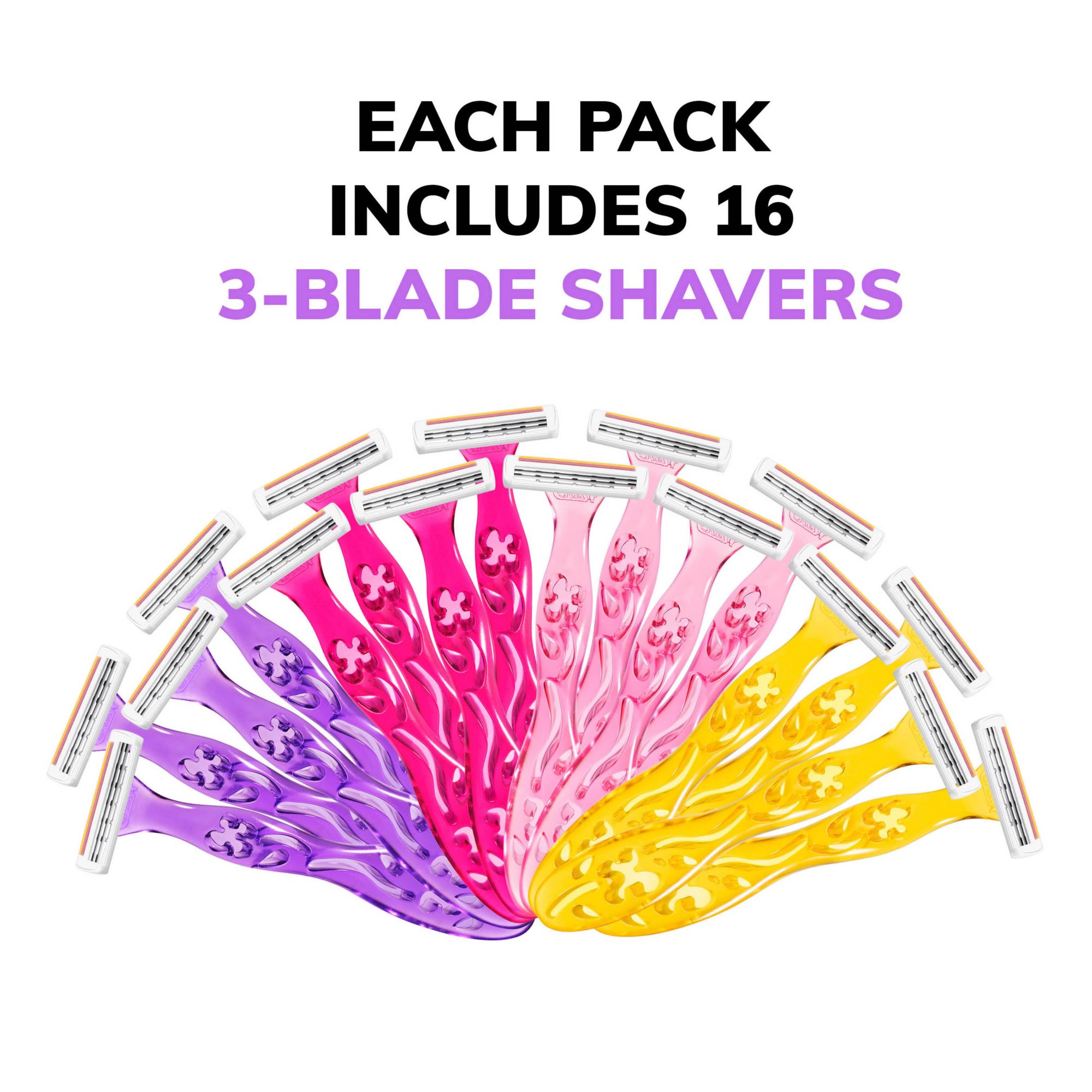 Included in this BIC Soleil Simply Smooth Disposable Razor Bundle are 16 Assorted Bright Colored 3-Blade Razors for Women