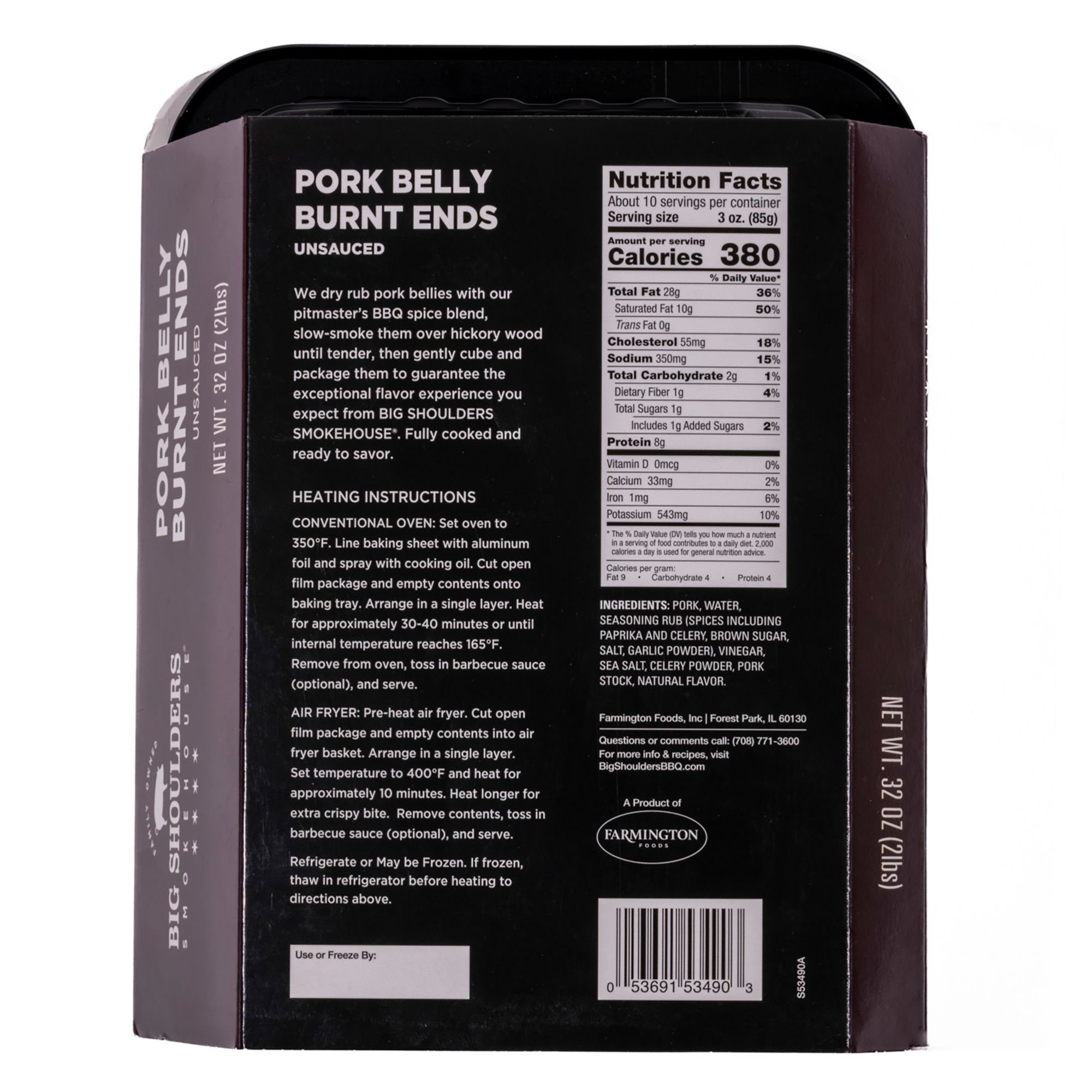 Big Shoulders Smokehouse offers a ready-to-cook pork belly burnt ends. They dry rub pork bellies with their pitmaster's BBQ spice blend, slow-smoke them over hickory wood until tender, then gently cube and package them to guarantee the exceptional flavor experience you expect from Big Shoulders Smokehouse. Fully cooked and ready to savor.
