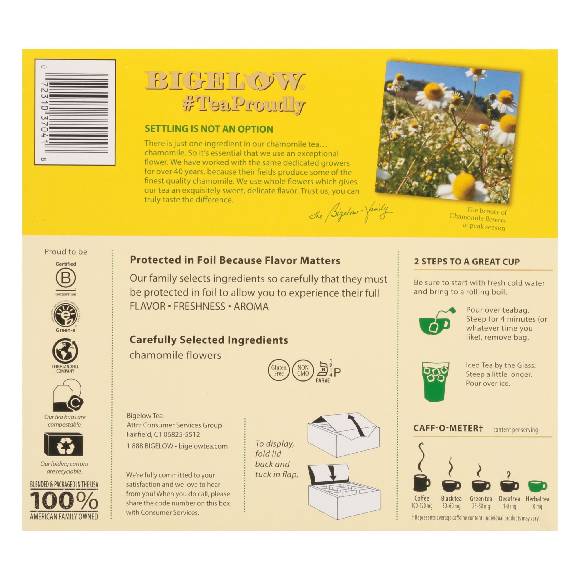 Chamomile is good for you, both soothing and relaxing. No better way to wind down. What makes Bigelow tea taste so special is that they use the whole chamomile flower, carefully picked so you get a much sweeter, rounder, flavorful experience…enjoy!