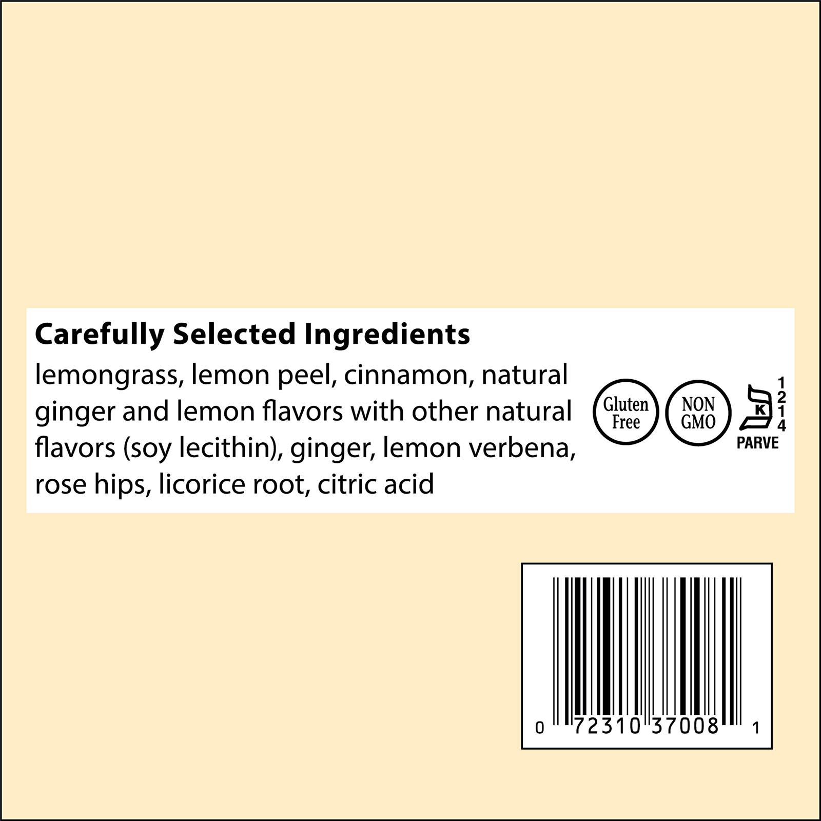 Ingredients: lemongrass, lemon peel, cinnamon, natural ginger and lemon flavors with other natural flavors (soy lecithin), ginger, lemon verbena, rose hips, licorice root, citric acid