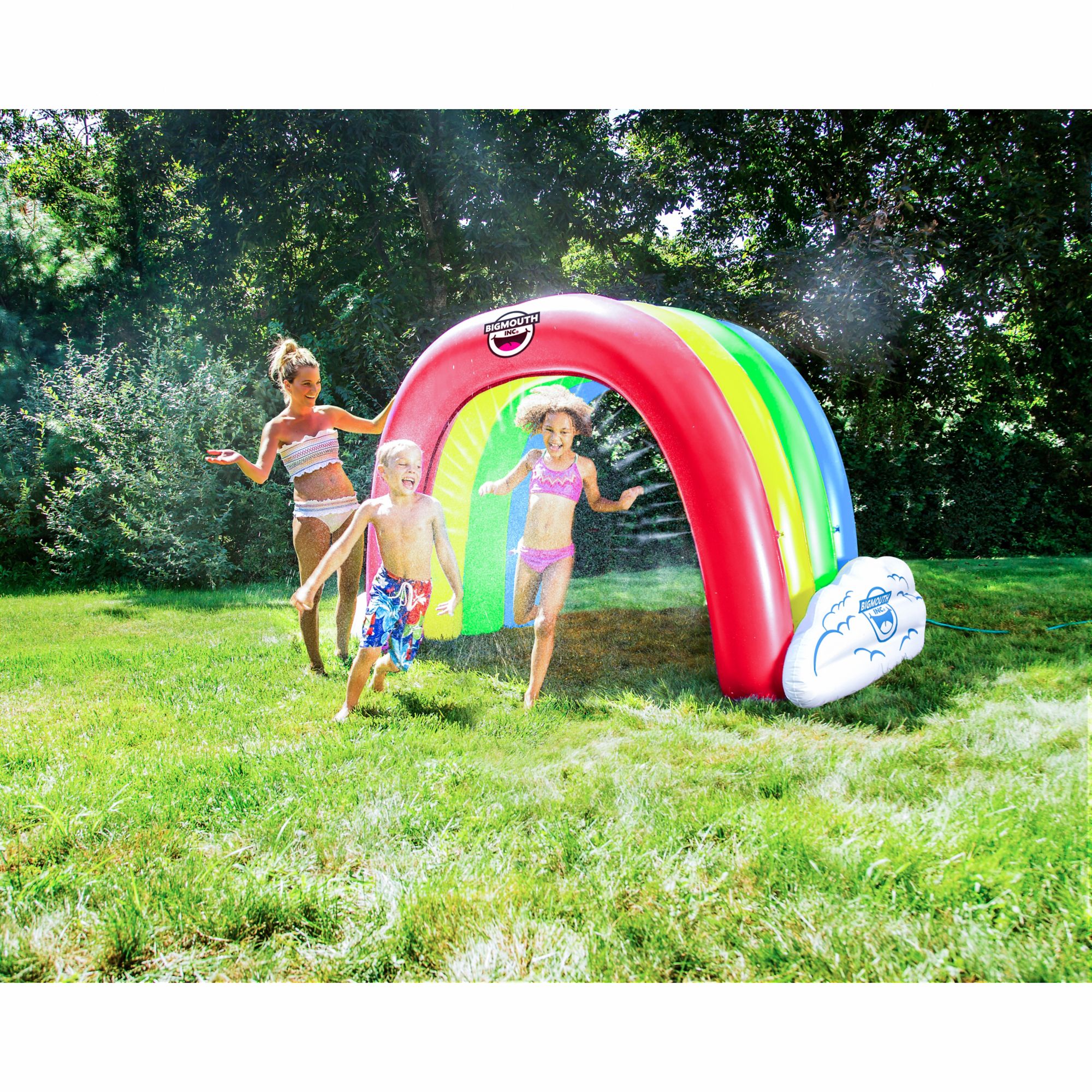 Forget running through your old lawn sprinkler and bring maximum fun to your yard with the BigMouth Giant Inflateable Rainbow Tunnel Sprinkler. This inflateable yard sprinkler is just what your backyard party is missing and is super simple to set up and use. Just inflate it and connect a standard garden hose. Turn on the water and you are ready to go. Go big with this 6' inflatable tunnel sprinkler, and run through the tunnel's dual surround splash soak zones as they simultaneously spray water in 180° direction. It's easy to inflate and works with a standard garden hose so all you have to do it fill it up with air, stake it down, twist on the hose and run happily through the rainbow rain.