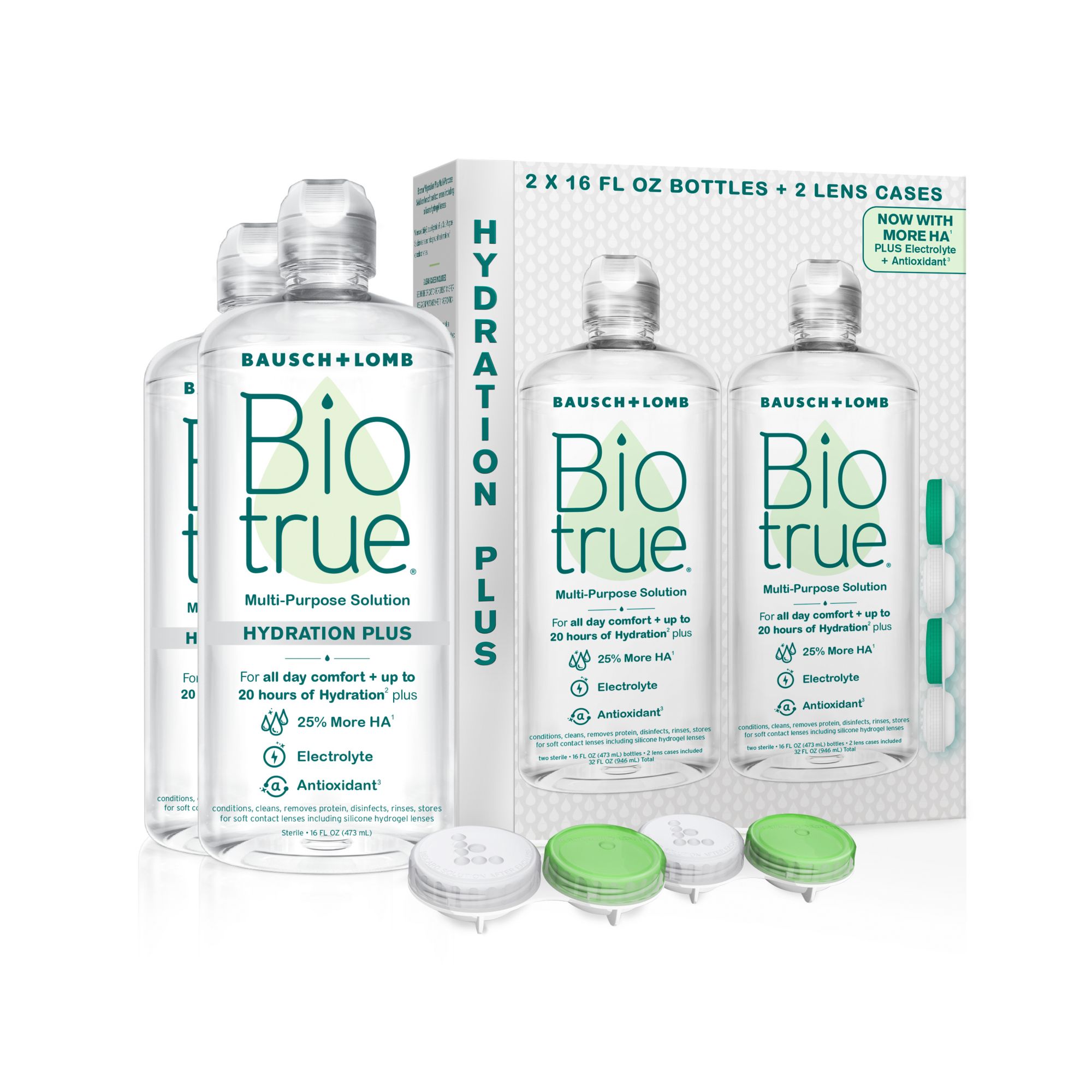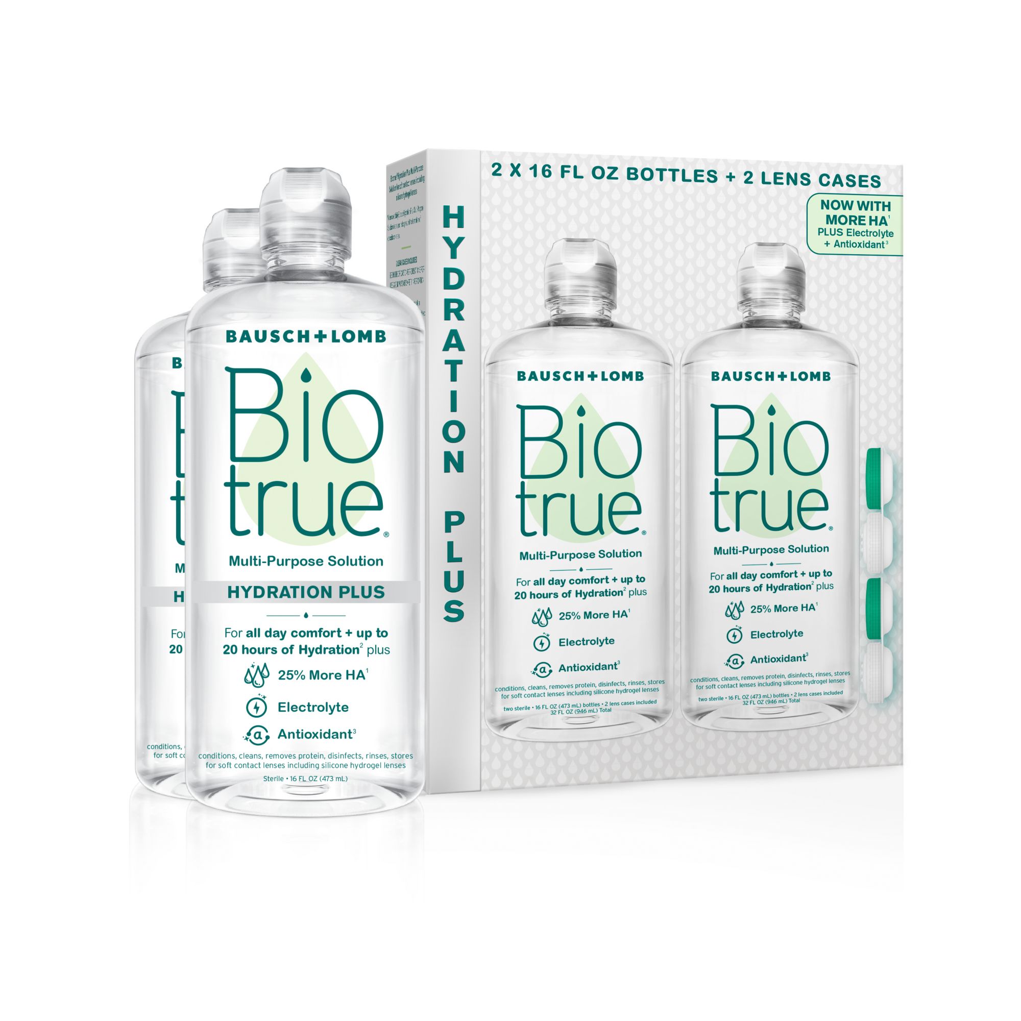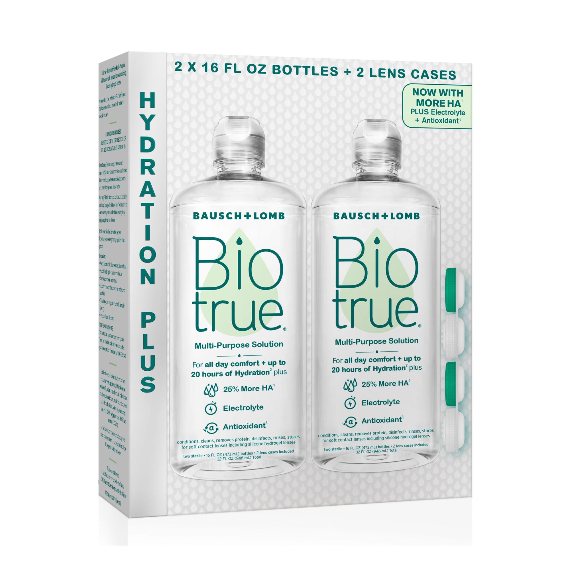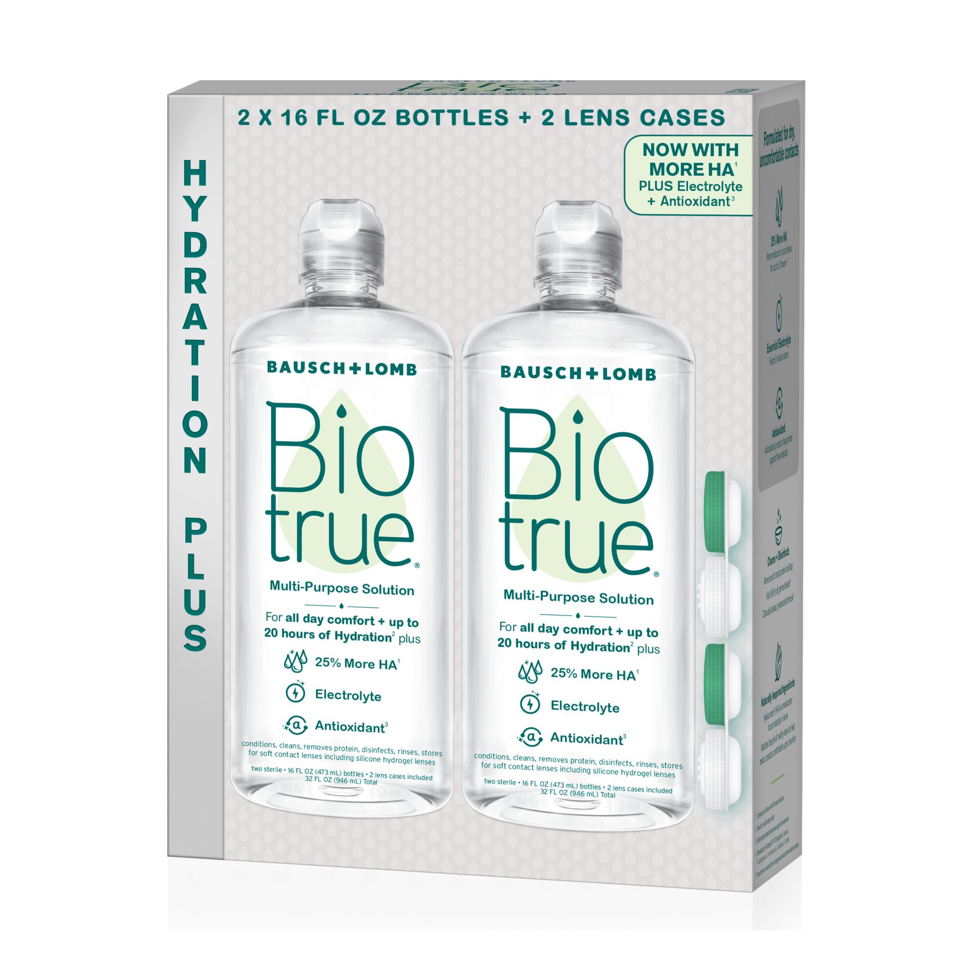 Naturally inspired features: Biotrue Hydration Plus contains naturally inspired ingredients, inspired by the biology of the eye: it’s enhanced with 25% more hyaluronan (a.k.a. HA, a moisturizer found naturally in tears) vs. original Biotrue Multi-Purpose Solution; contains an antioxidant (protects HA against free radicals); as well as potassium (an electrolyte found naturally in tears). Biotrue Hydration Plus also matches the pH of healthy tears to help make contacts comfortable when you put them in.