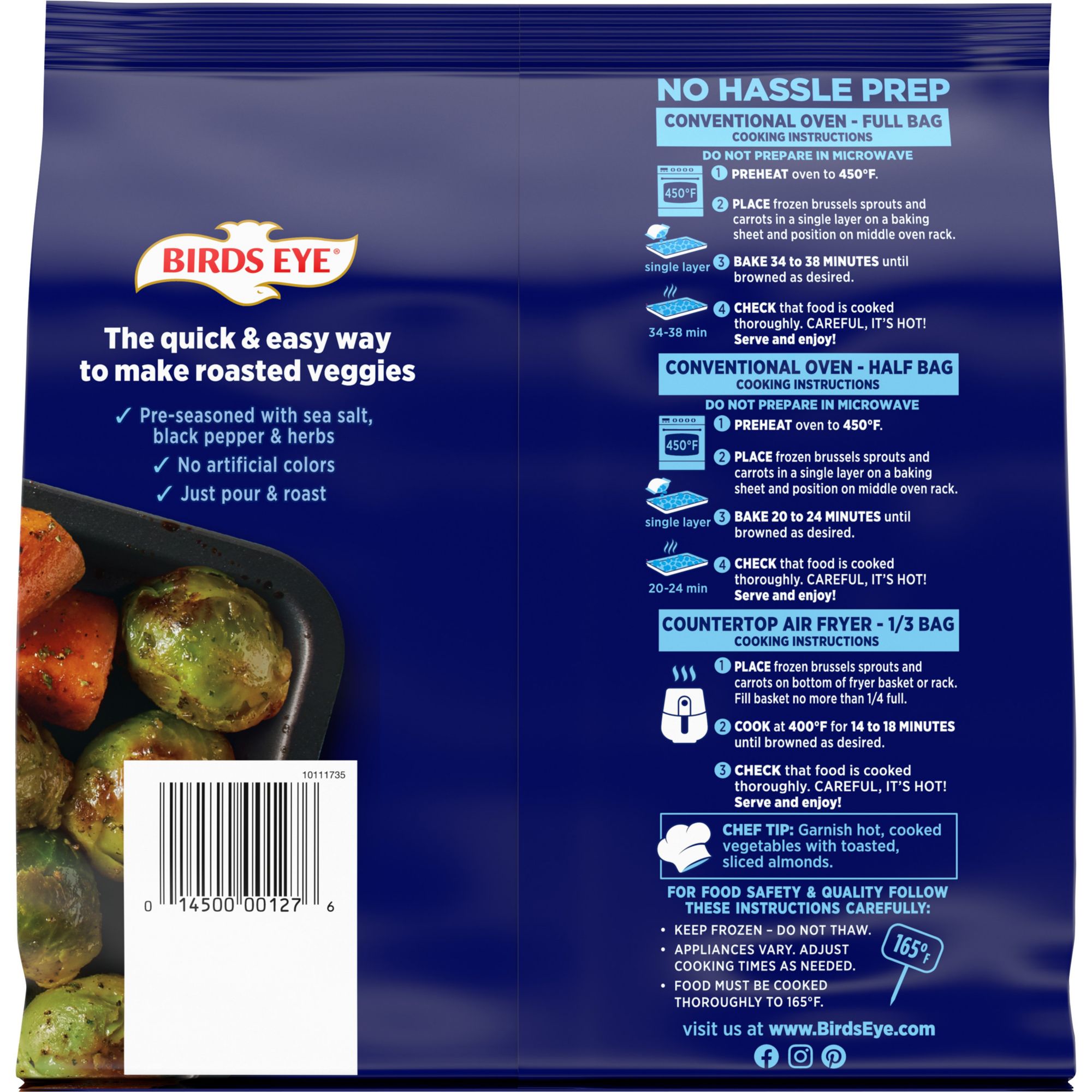 Birds Eye Oven Roasters Seasoned Brussels Sprouts and Carrots Frozen Vegetables serve up loads of flavor with no-hassle prep for a dish the whole family will love. Frozen carrots and frozen brussel sprouts combined with the perfect blend of sea salt, black pepper, and herbs for a flavorful, nutritious side dish. Your family can enjoy the best vegetables without artificial colors, so you can feel good about what you're serving. Top the cooked seasoned vegetables with toasted sliced almonds for extra flavor and crunch. They pair perfectly with roasted chicken for an easy meal. Roast the vegetables on a lightly greased baking sheet for 18 to 22 minutes.