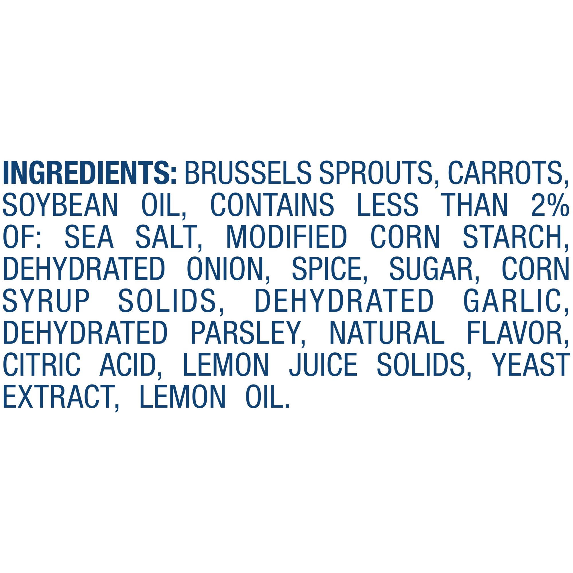 Ingredients:Brussels Sprouts, Carrots, Soybean Oil, Contains Less Than 2% of Sea Salt, Modified Corn Starch, Dehydrated Onion, Spice, Sugar, Corn Syrup Solids, Dehydrated Garlic, Dehydrated Parsley, Natural Flavor, Citric Acid, Lemon Juice Solids, Yeast Extract, Lemon Oil.