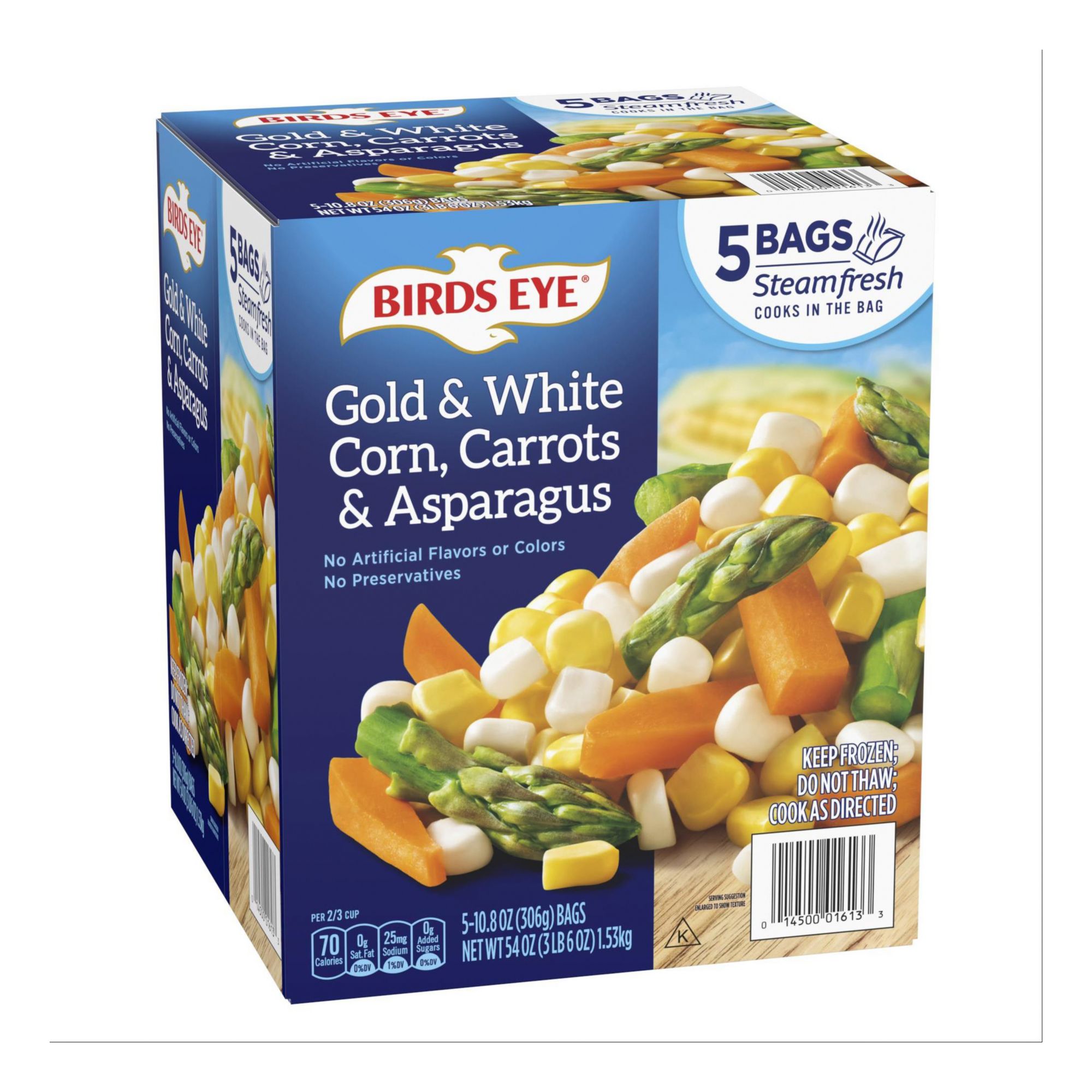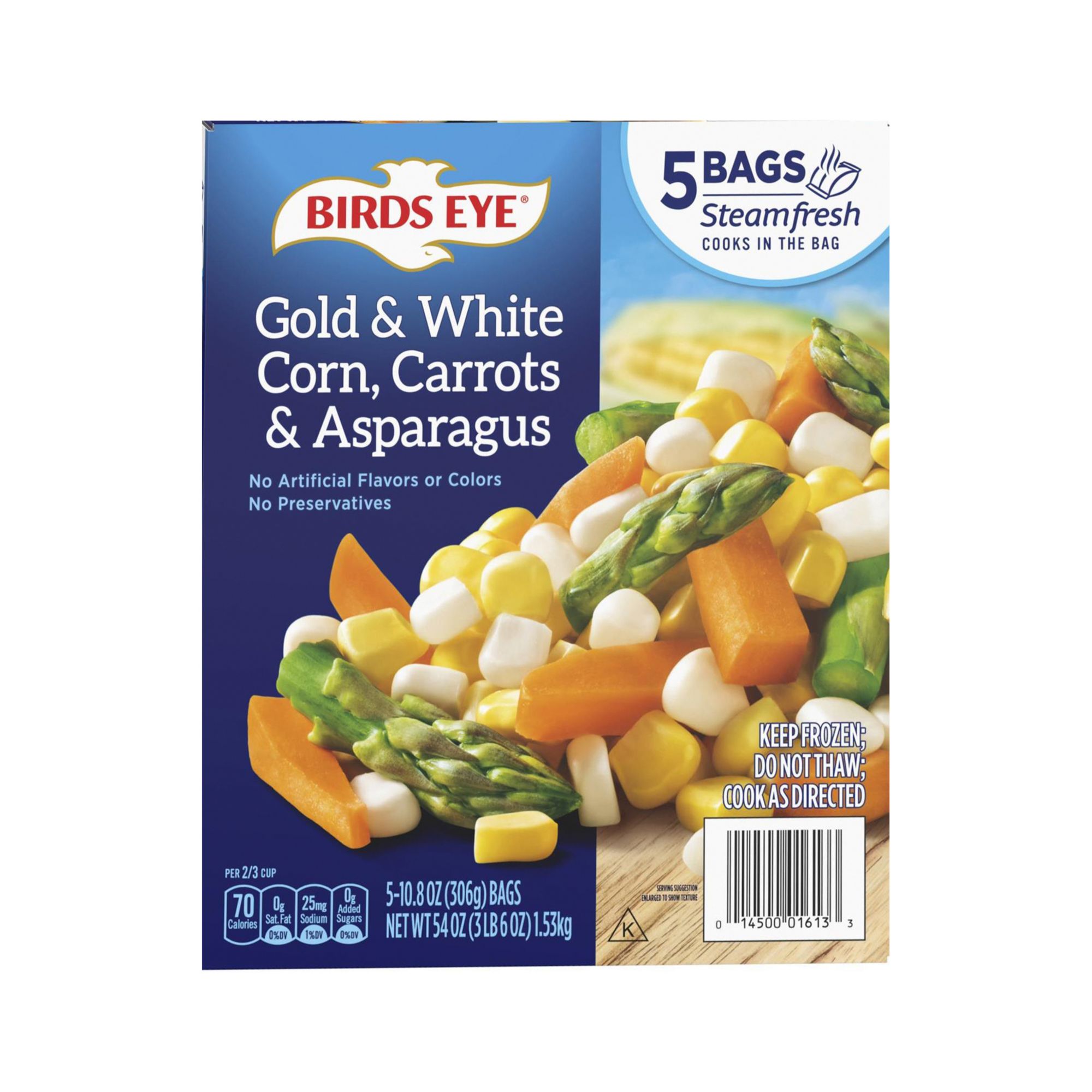 Five 10.8 oz. bags of Birds Eye Steamfresh Gold and White Corn, Carrots and Asparagus, Frozen Vegetables